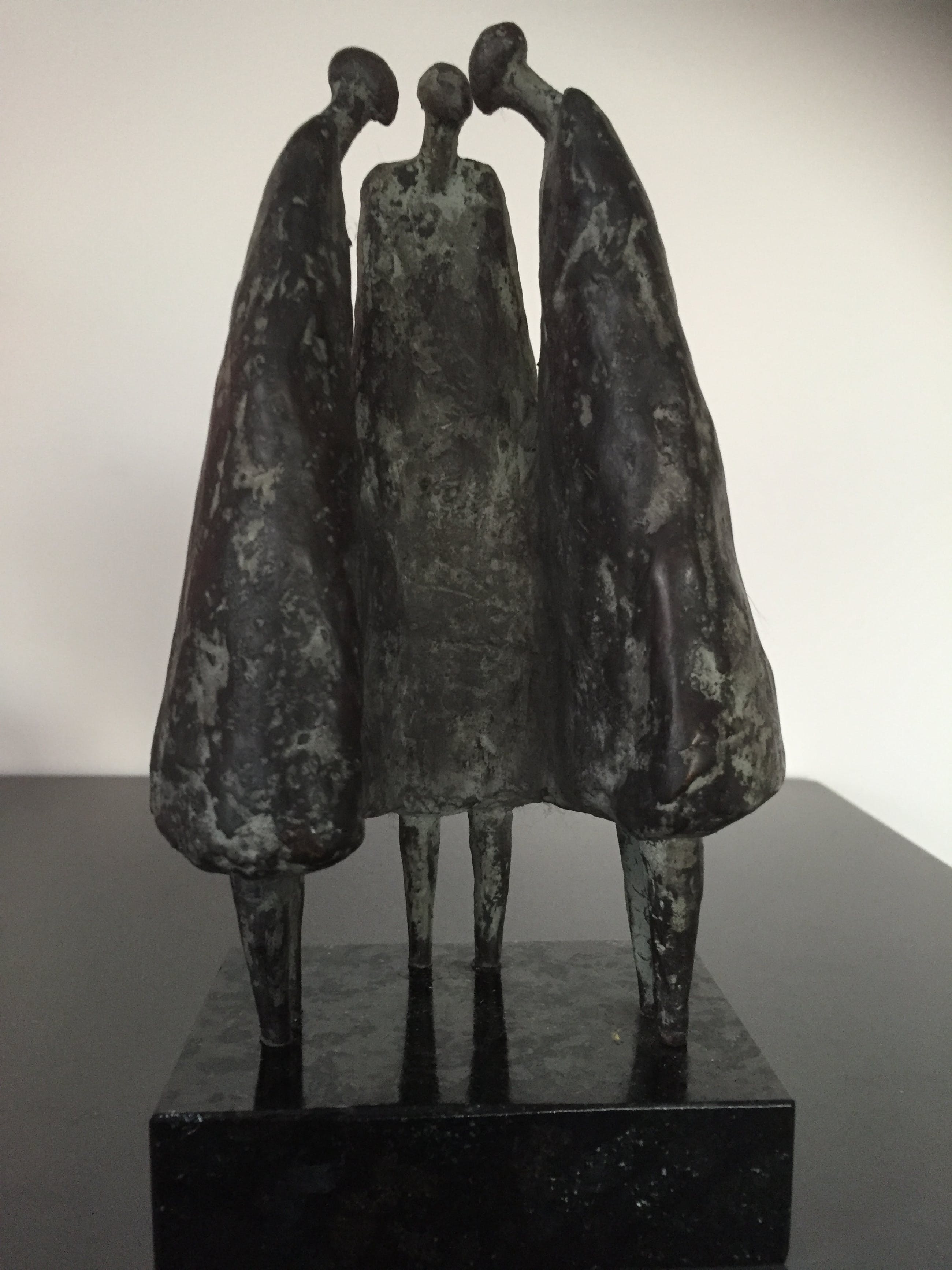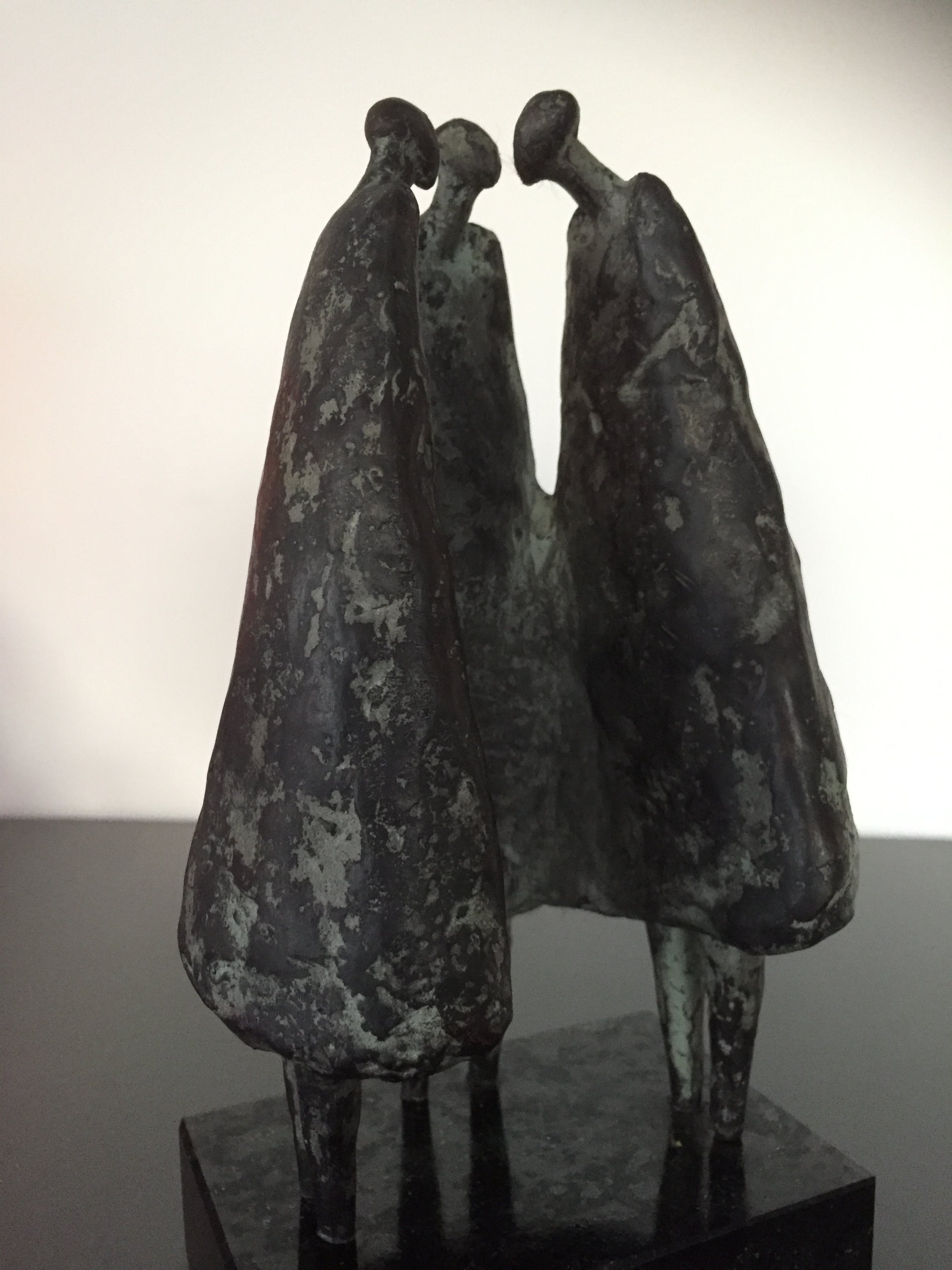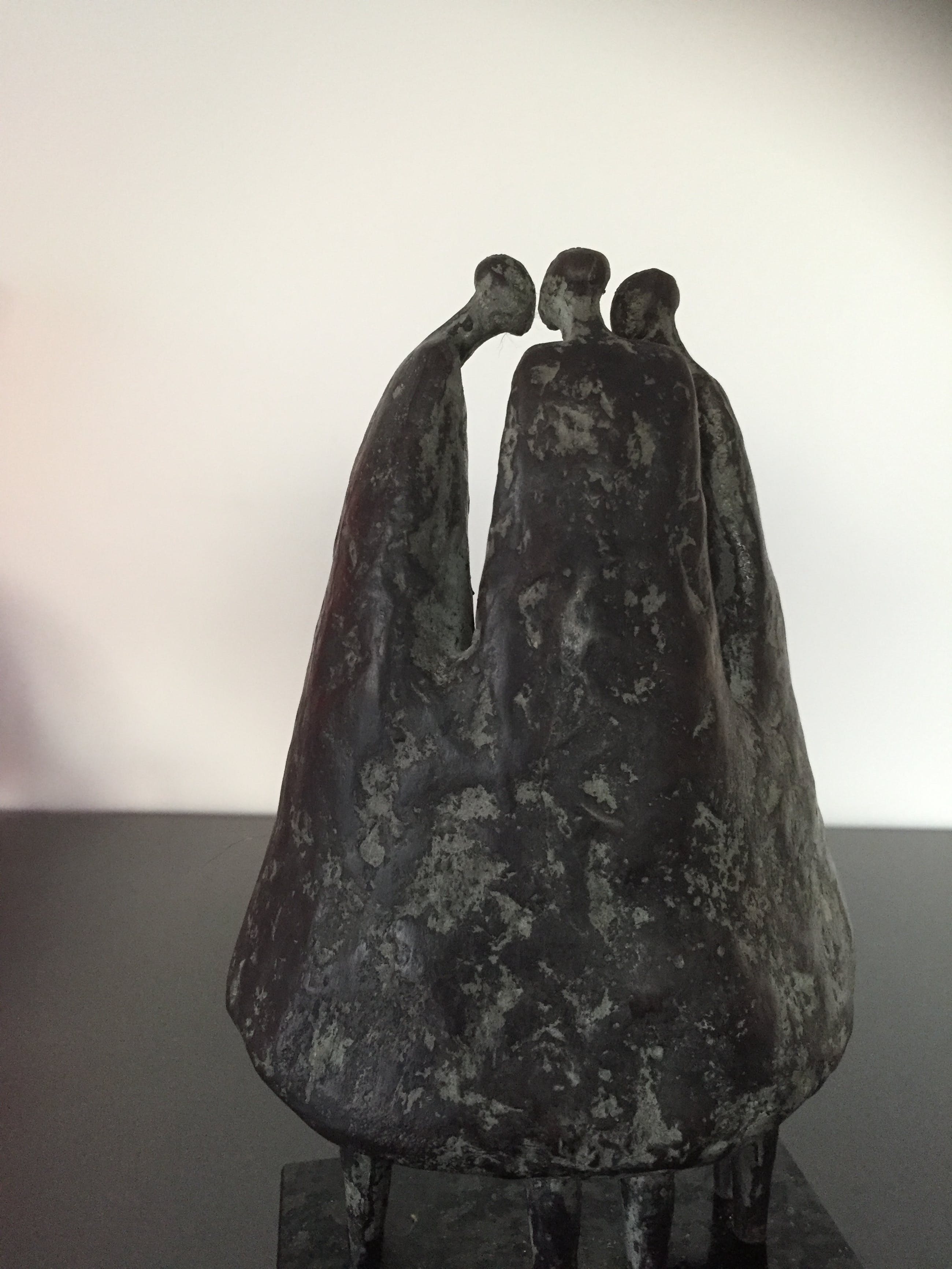 Drie vrouwen gezellig bijeen staande op een zwart natuurstenen sokkel