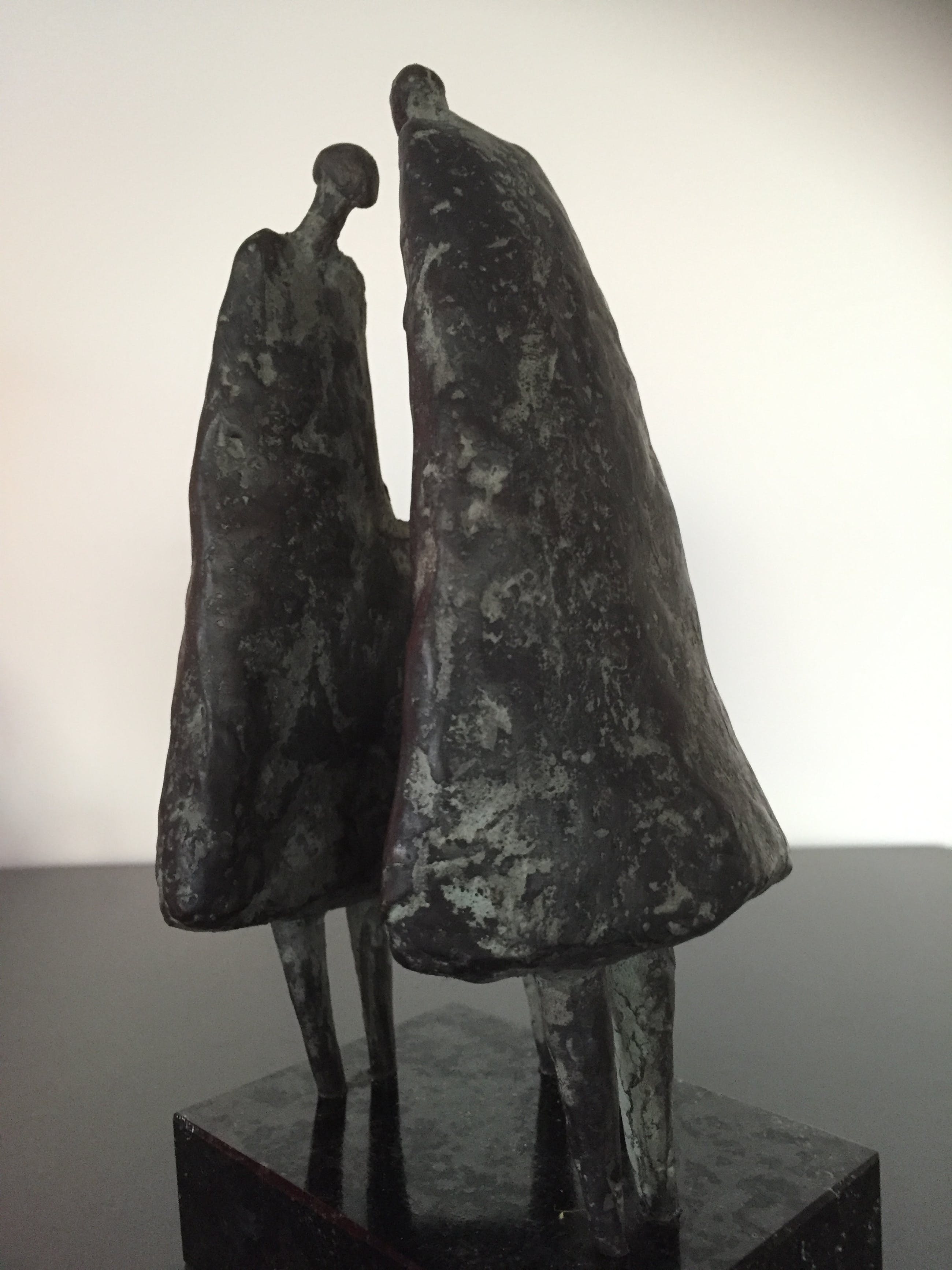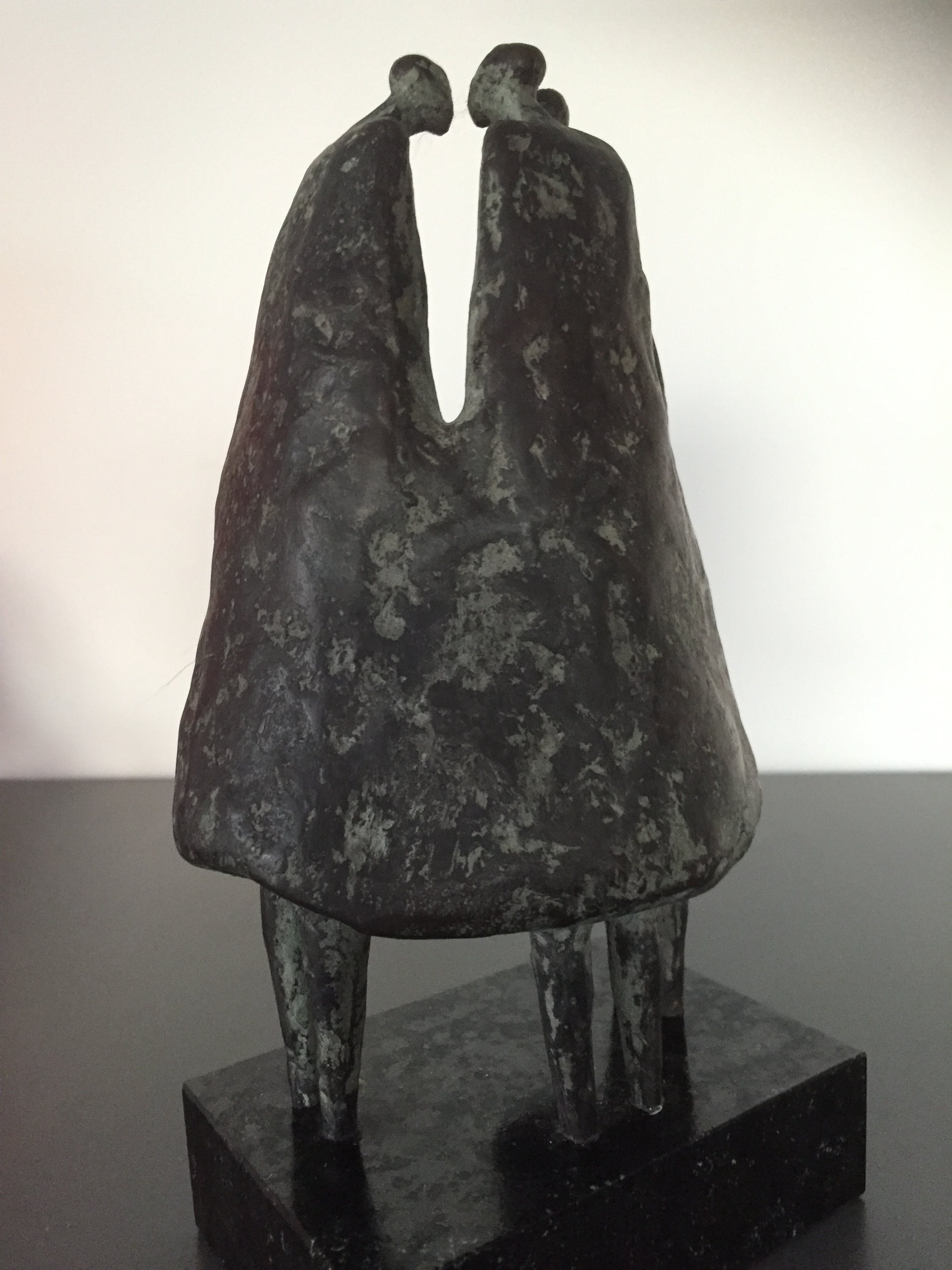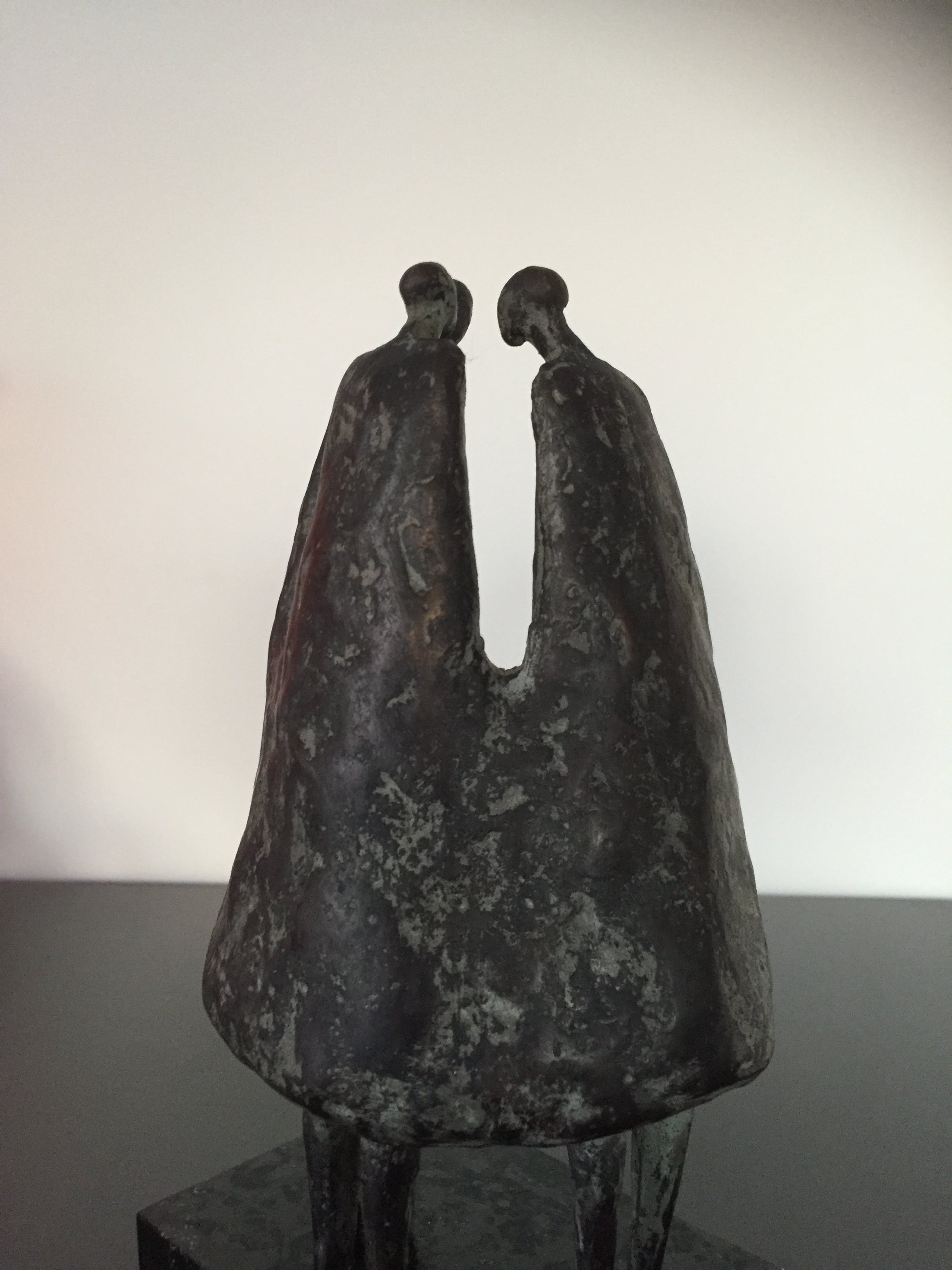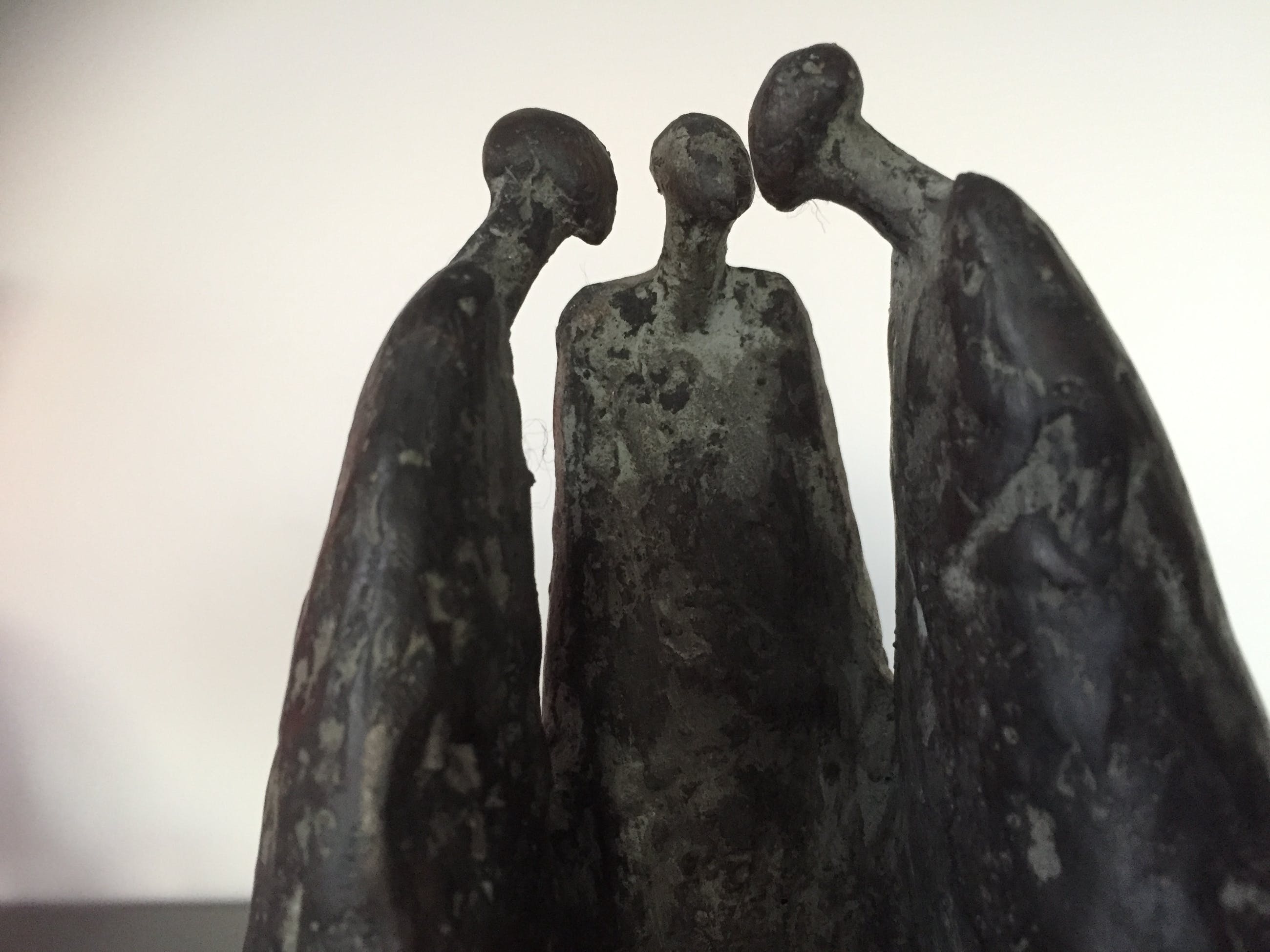 Drie vrouwen gezellig bijeen staande op een zwart natuurstenen sokkel