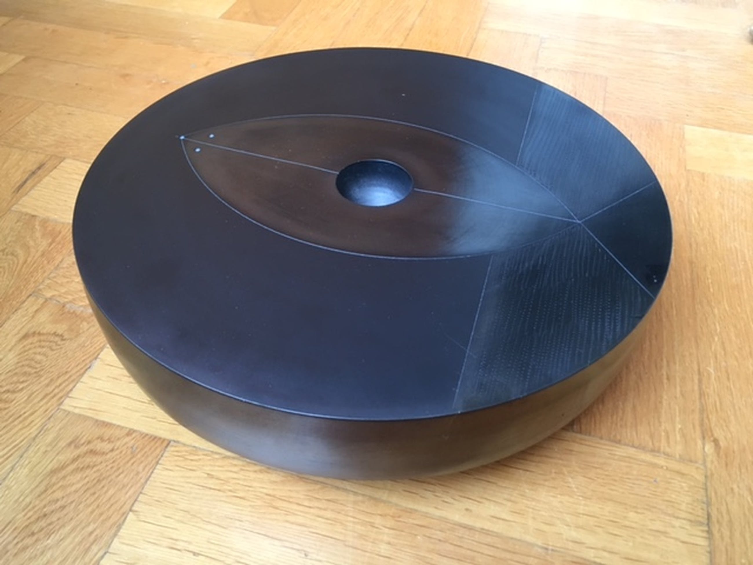 Rond 35 cm, hoogte 9 cm.