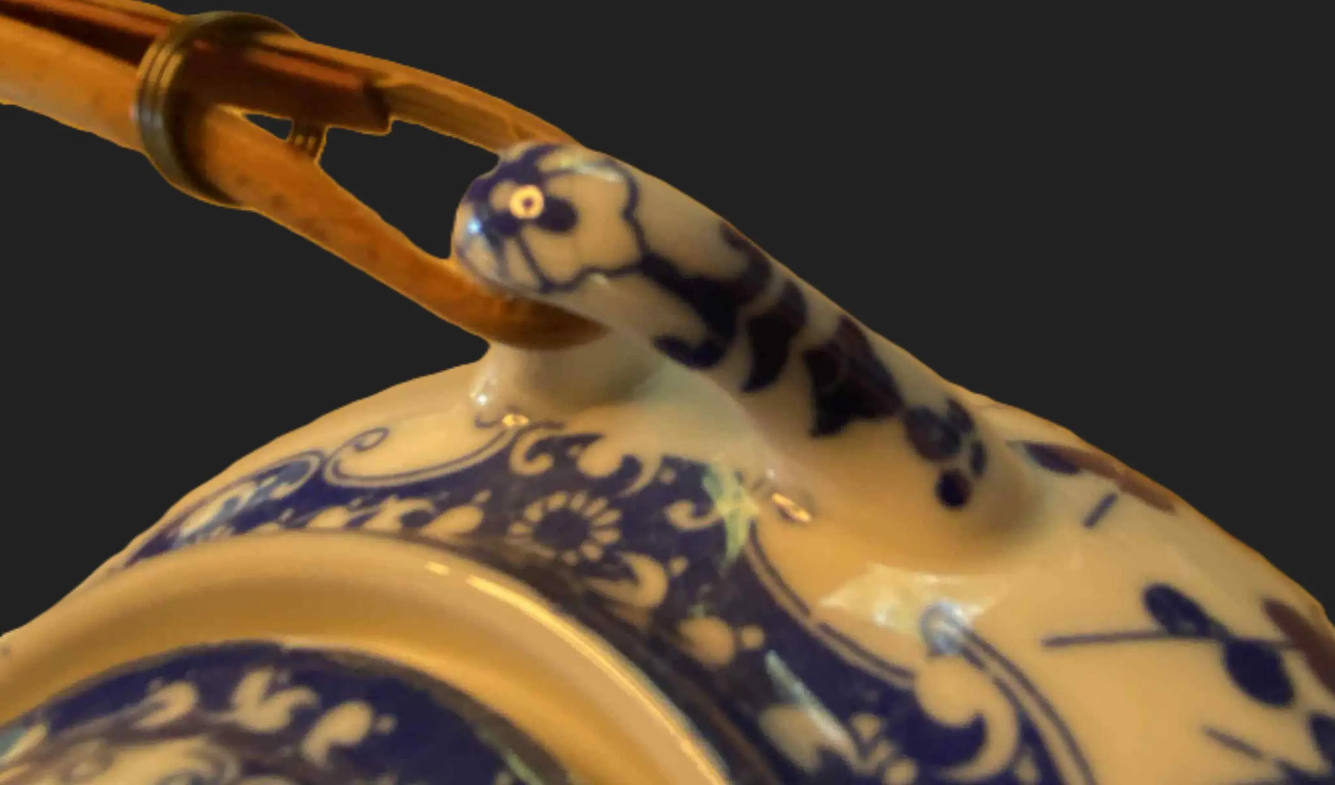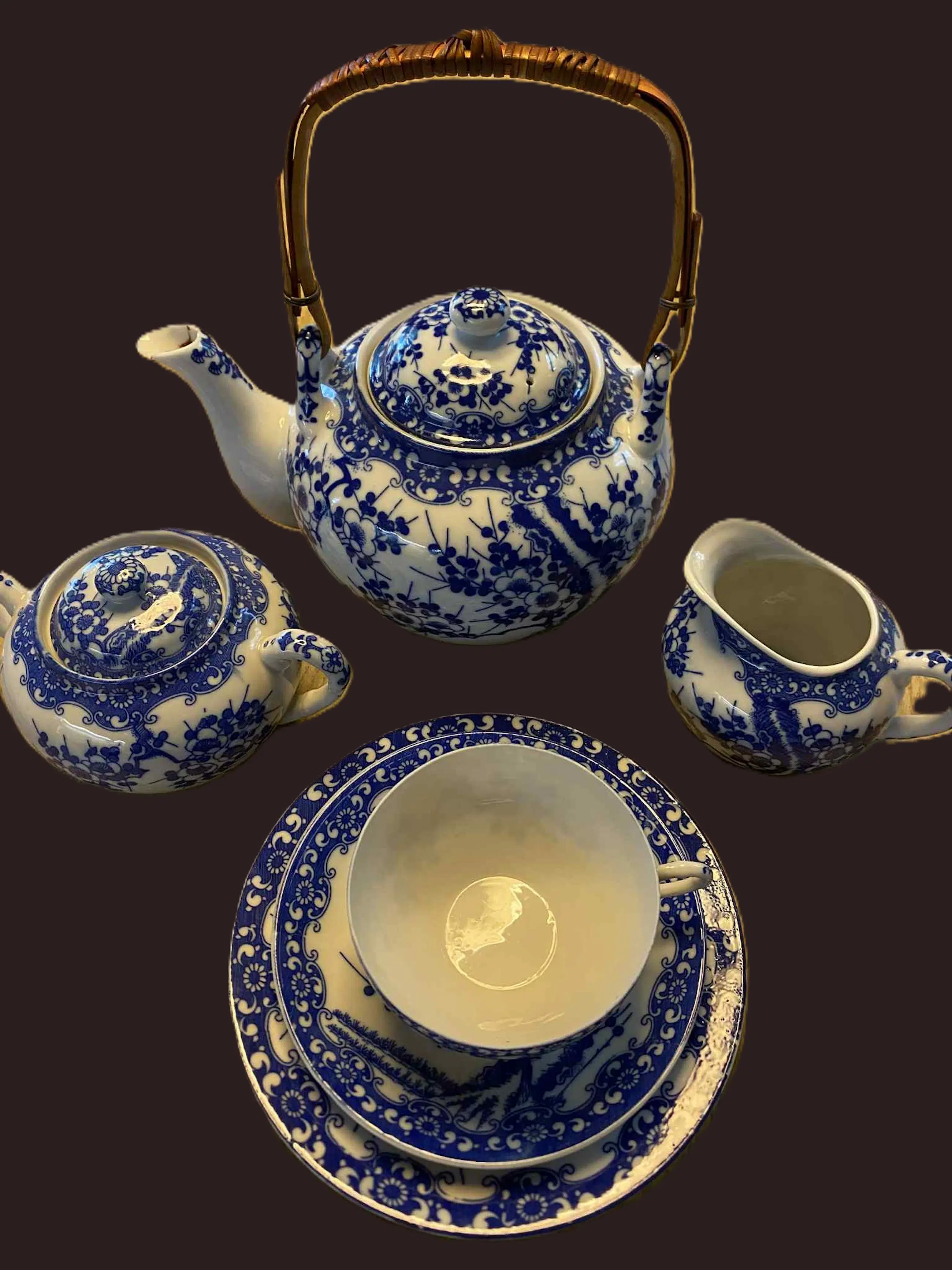 Het servies heeft een verfijnde, traditionele uitstraling. De theepot met de rieten (of bamboe) handgreep is een typisch kenmerk van Aziatische theepotten, wat de authenticiteit van de Japanse inspiratie benadrukt.