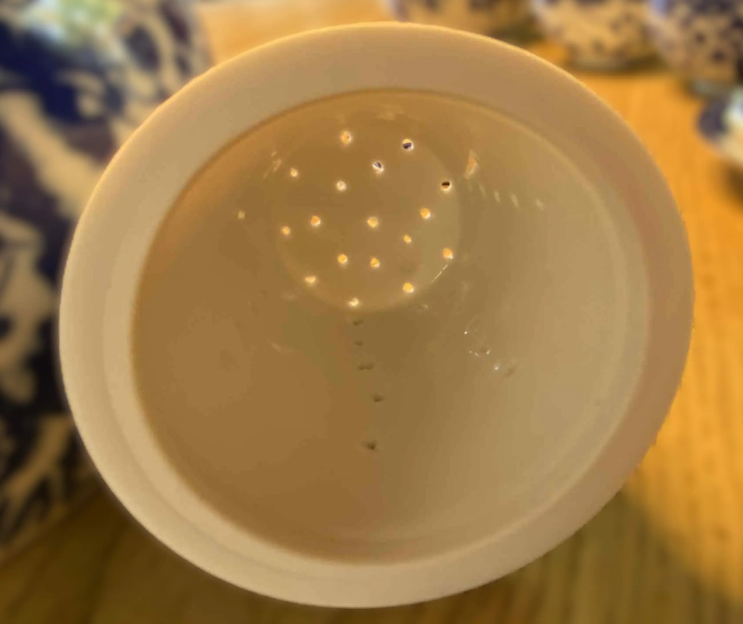 1 thépot met deksel en bijhorend porseleinen zeefje ( zeldzaam ) en authentiek bamboe handvat