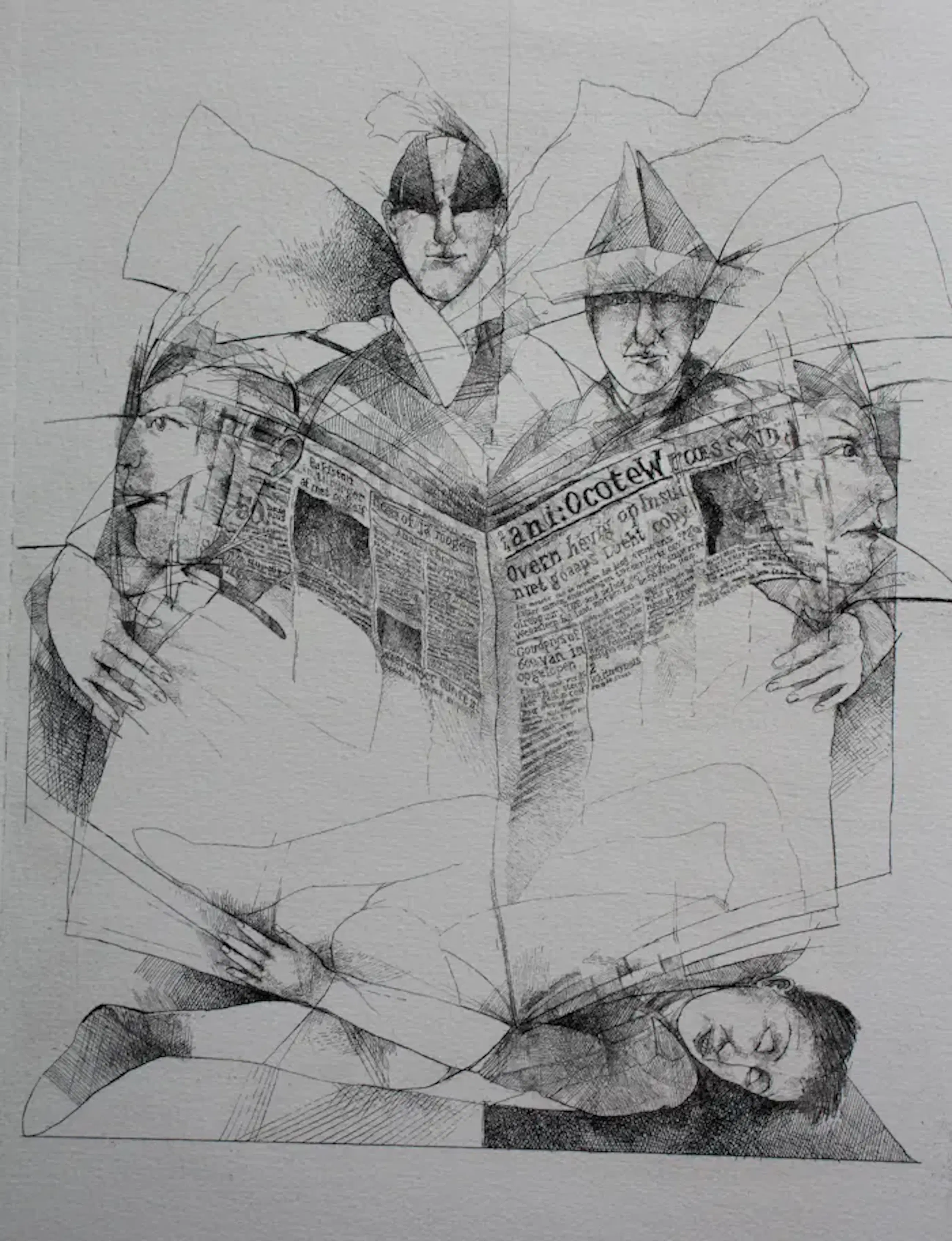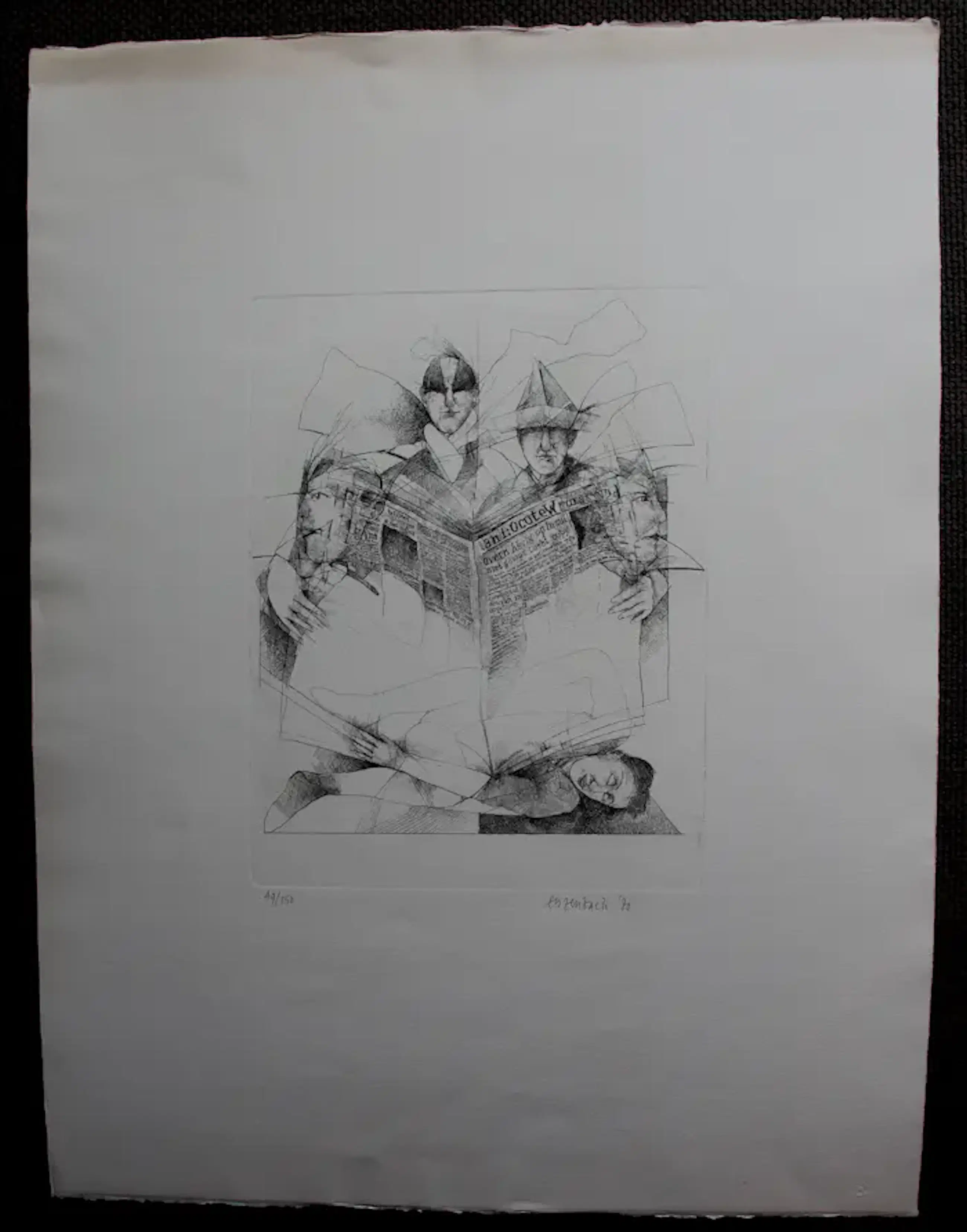 Ets van Tom Eyzenbach uit 1980. Nummer: 49/150. Afmetingen blad: H66 x b50cm. Afmetingen voorstelling: H29 x b24cm. Het werk is rechts onderaan gesigneerd en gedateerd, door de kunstenaar met potlood. De authenticiteit van dit werk wordt volledig gegarandeerd. Een certificaat kan, op aanvraag, worden gemaild.
