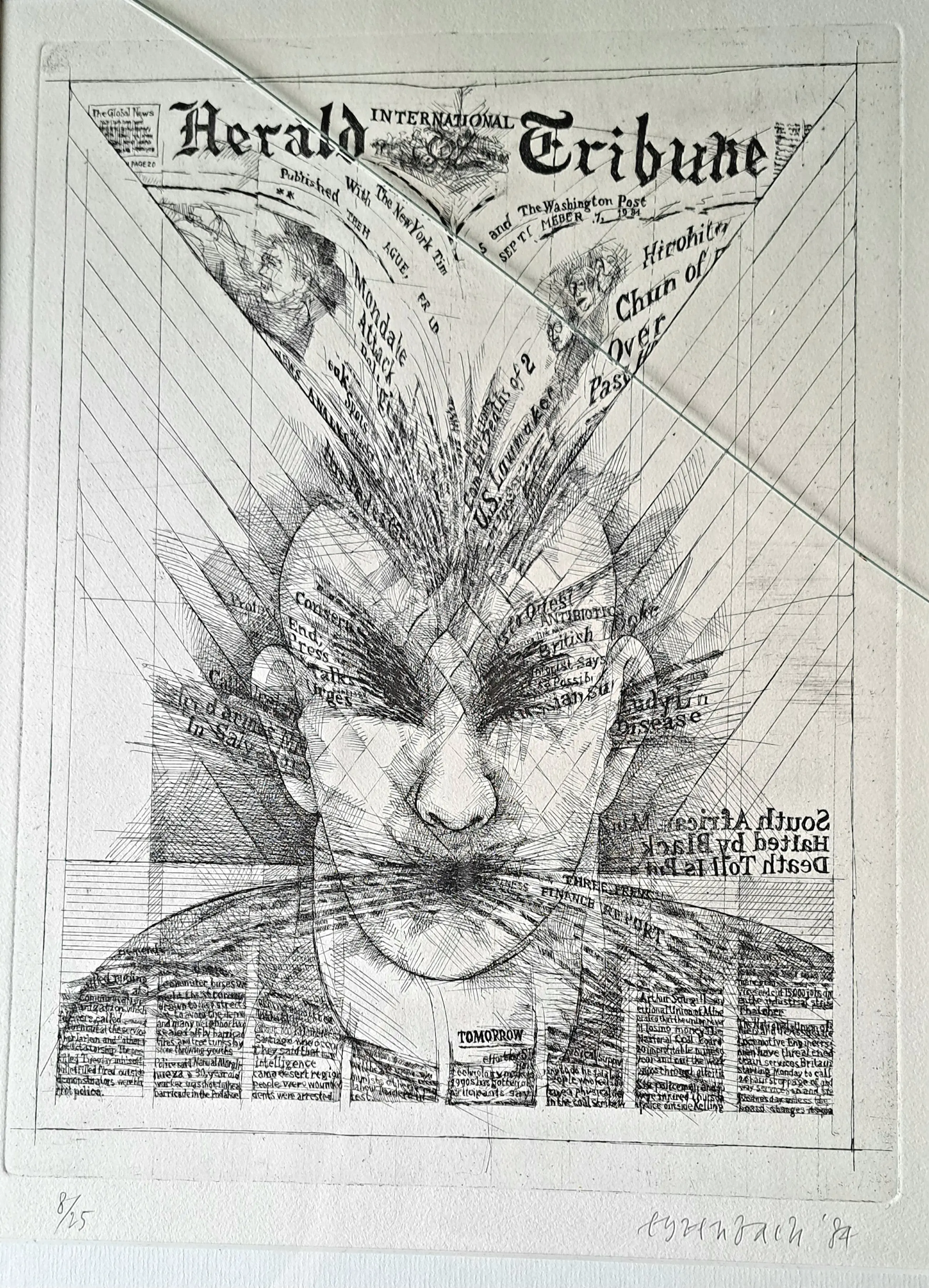 Mooi werk van Tom Eyzenbach. Gaat misschien wel.over de overload aan akelige informatie. Andere intepretaties ook mogelijk. Fijn om naar de kijken met al die letters. Barst in glas.