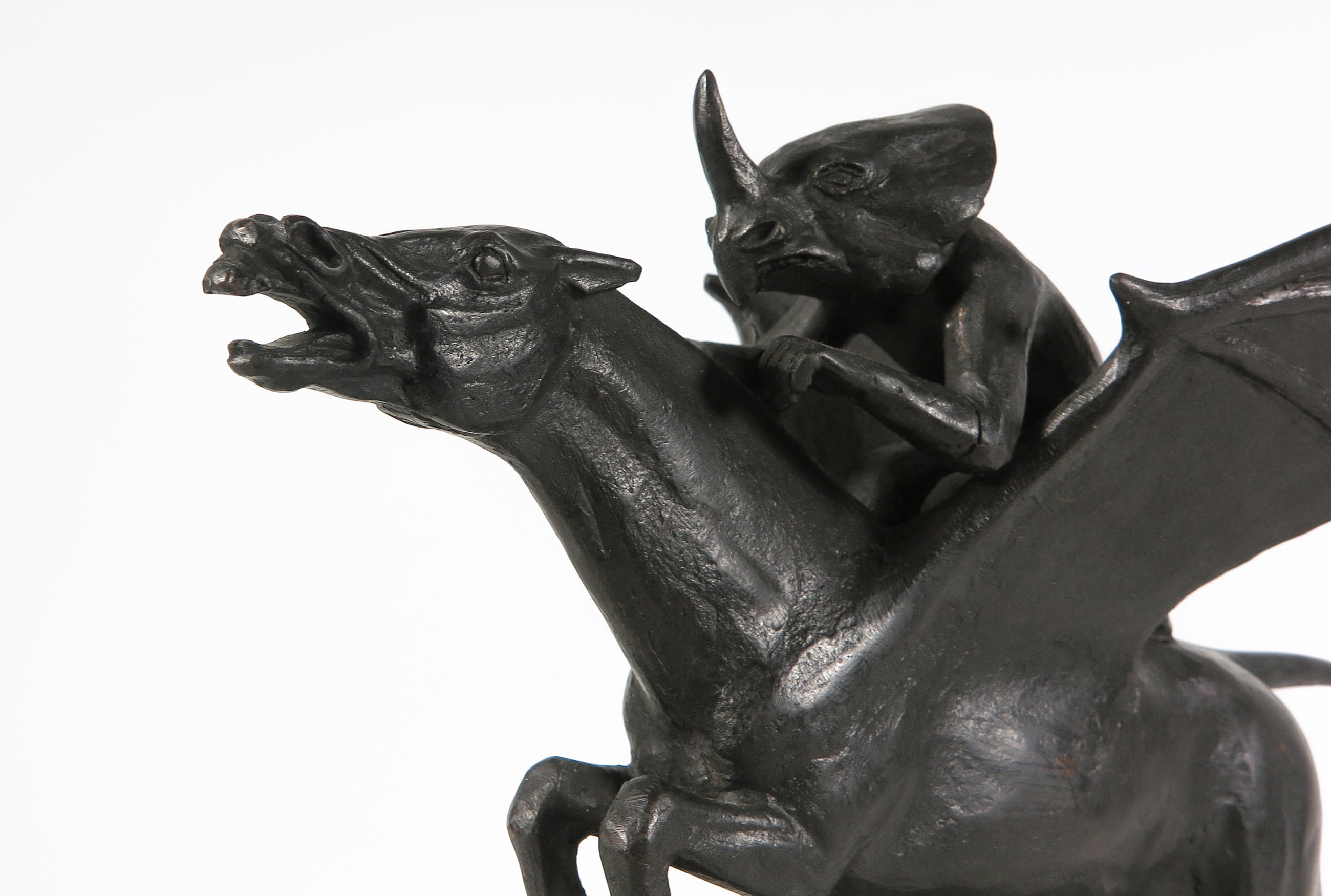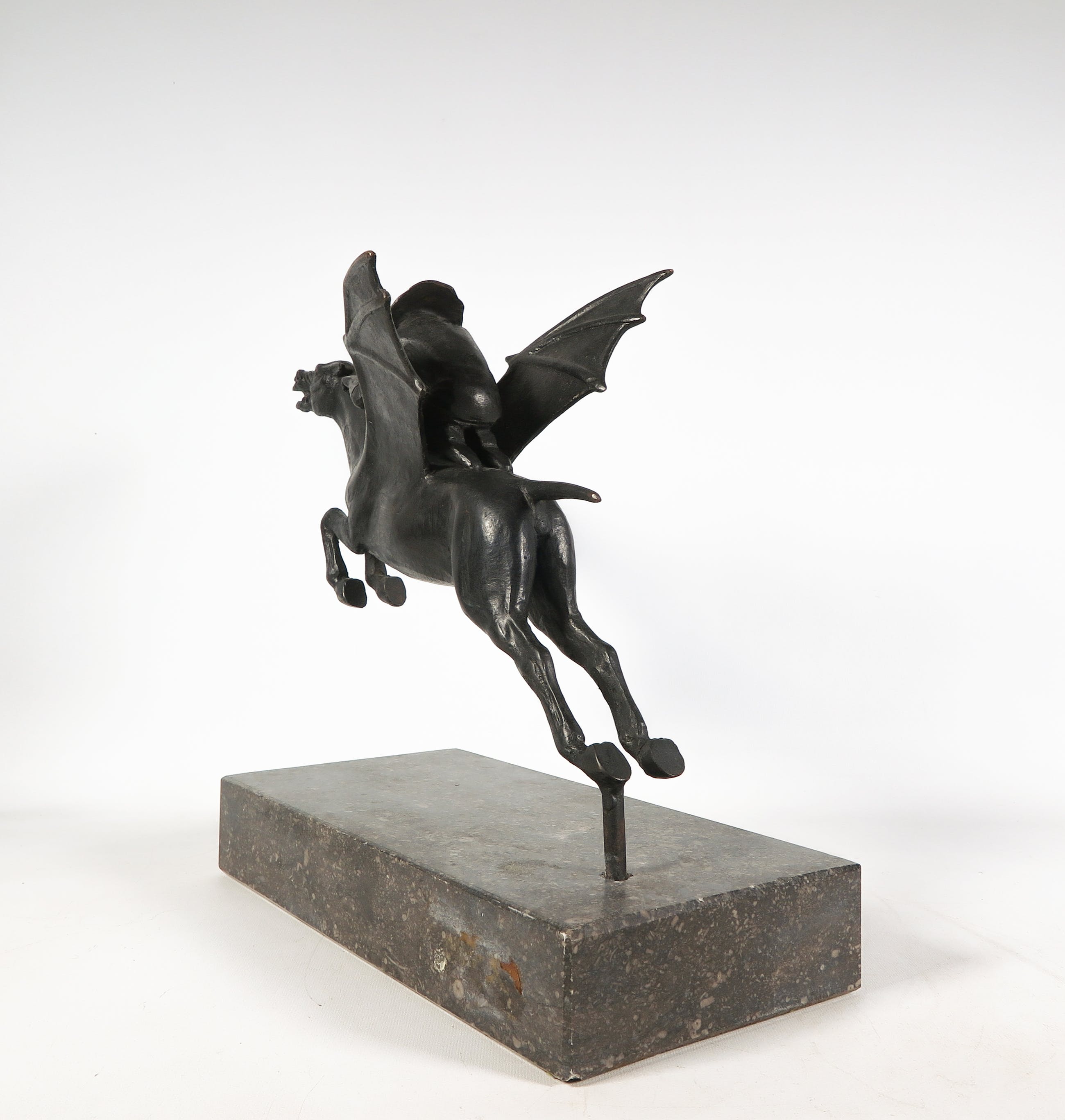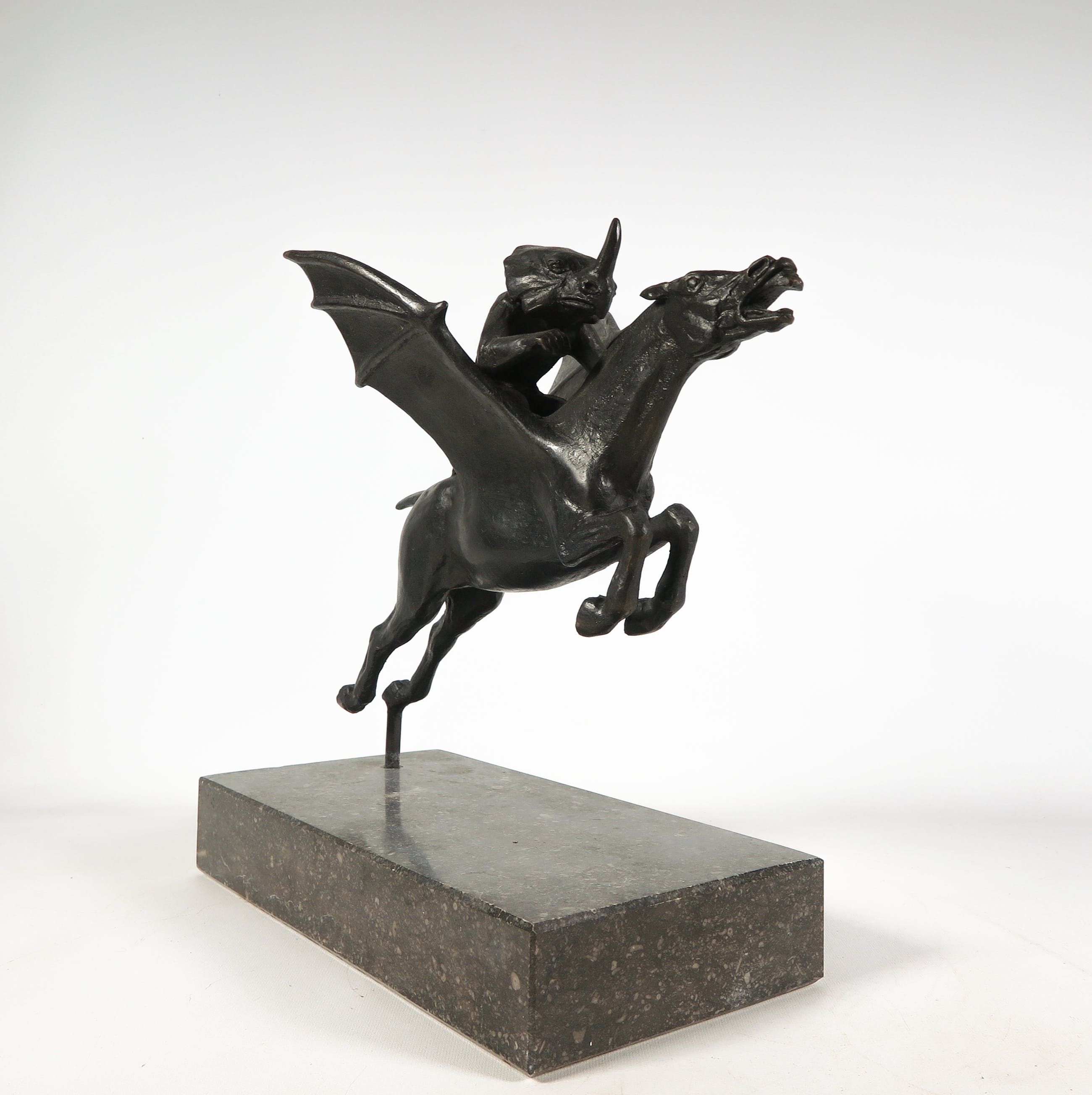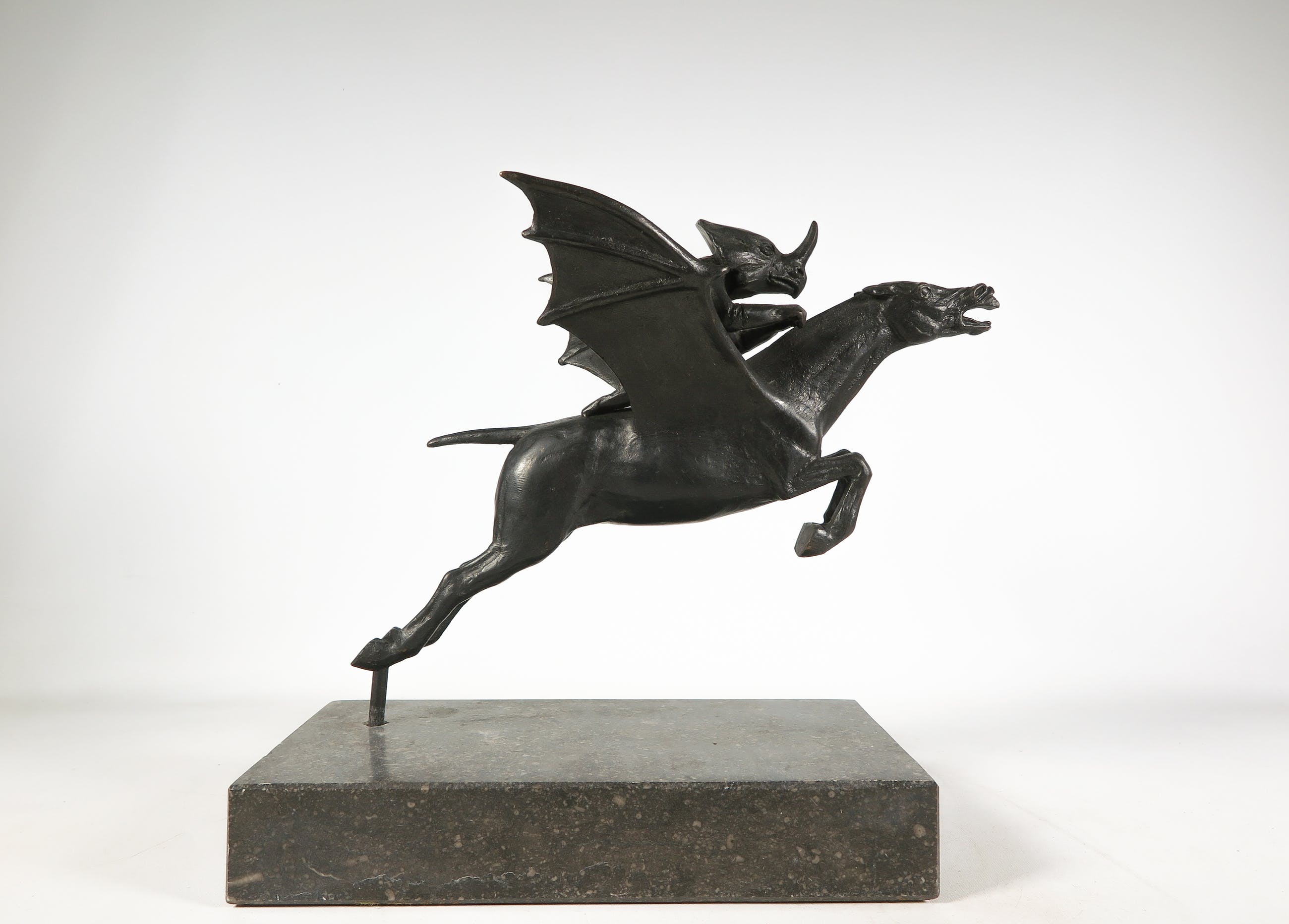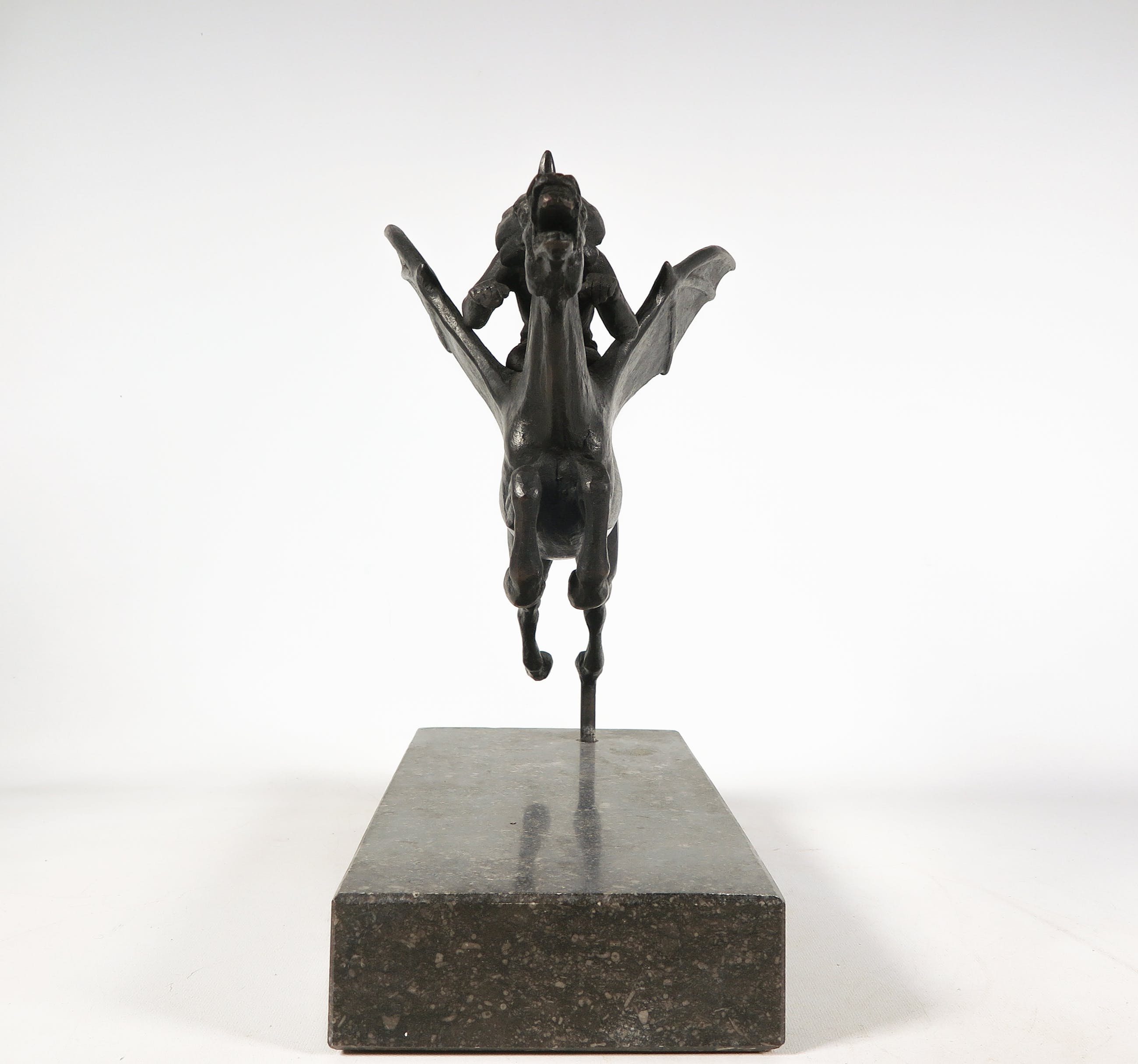 Bronzen beeld door de monumentale kunstenaar Tom Frantzen, voorstellende een ruiter met de kop van een triceratops op een gevleugeld paard.