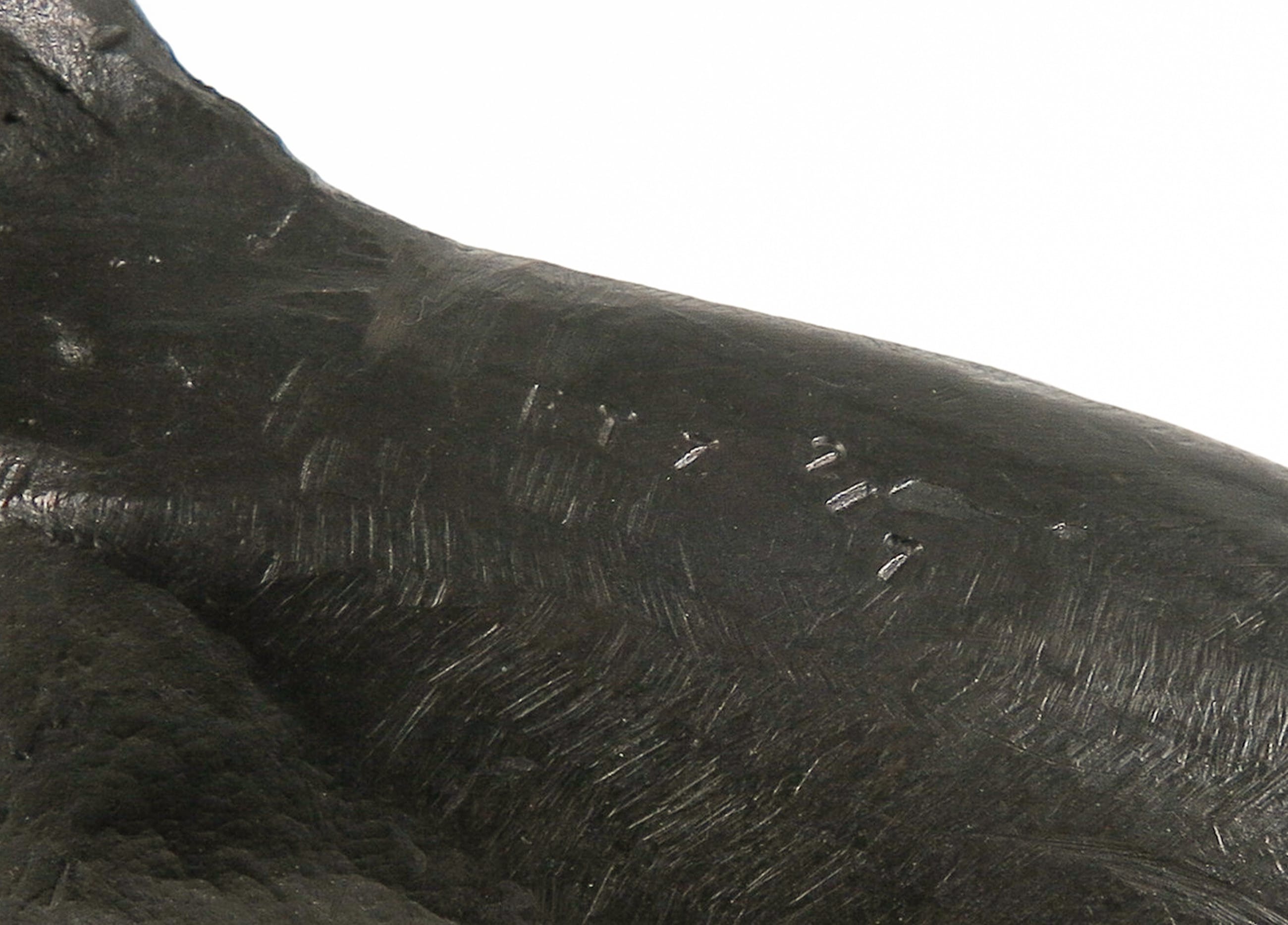 | Het brons is in zeer goede conditie. De voet heeft wat krasjes/gebruikssporen, ook rond het gat van de pin. Ook de hoekjes hebben een paar beschadigingen. Paar lichte krasjes in de patina. Mogelijk wat lijmresten/sporen van een oud naamplaatje. | |