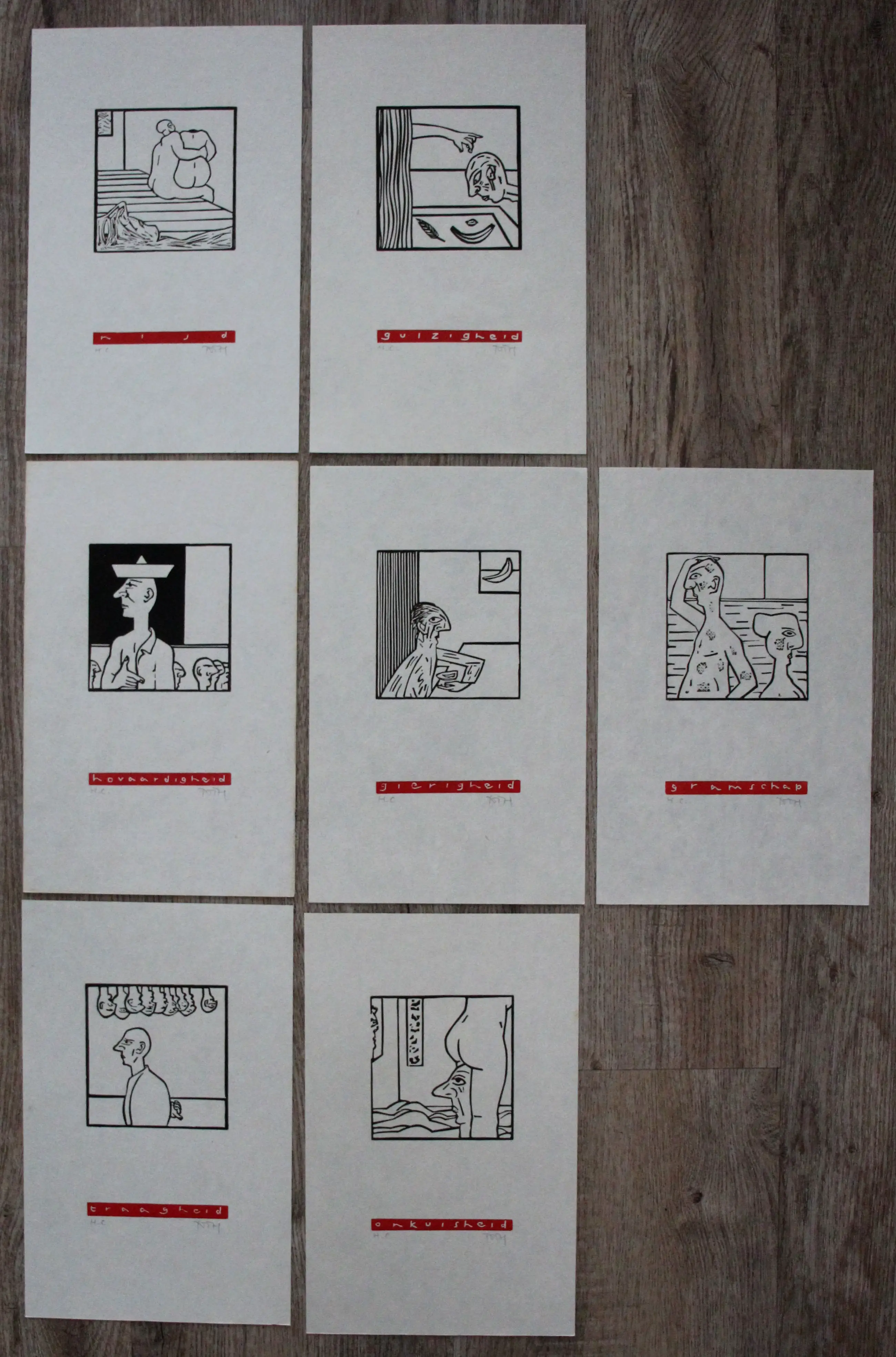 Zeven houtsneden van Thom Thijsse uit 1999.Titel: De Zeven Hoofdzonden. Uitgegeven in opdracht van Change Managements Consultants en alleen verstrekt aan klanten. Gedrukt op 89 grams Kozo papier. Nummer: H.C. Afmetingen blad: H30 x b19,2 cm. Afmetingen voorstelling: H10 x b10 cm. De werken zijn rechts onderaan, met potlood gesigneerd door de kunstenaar.