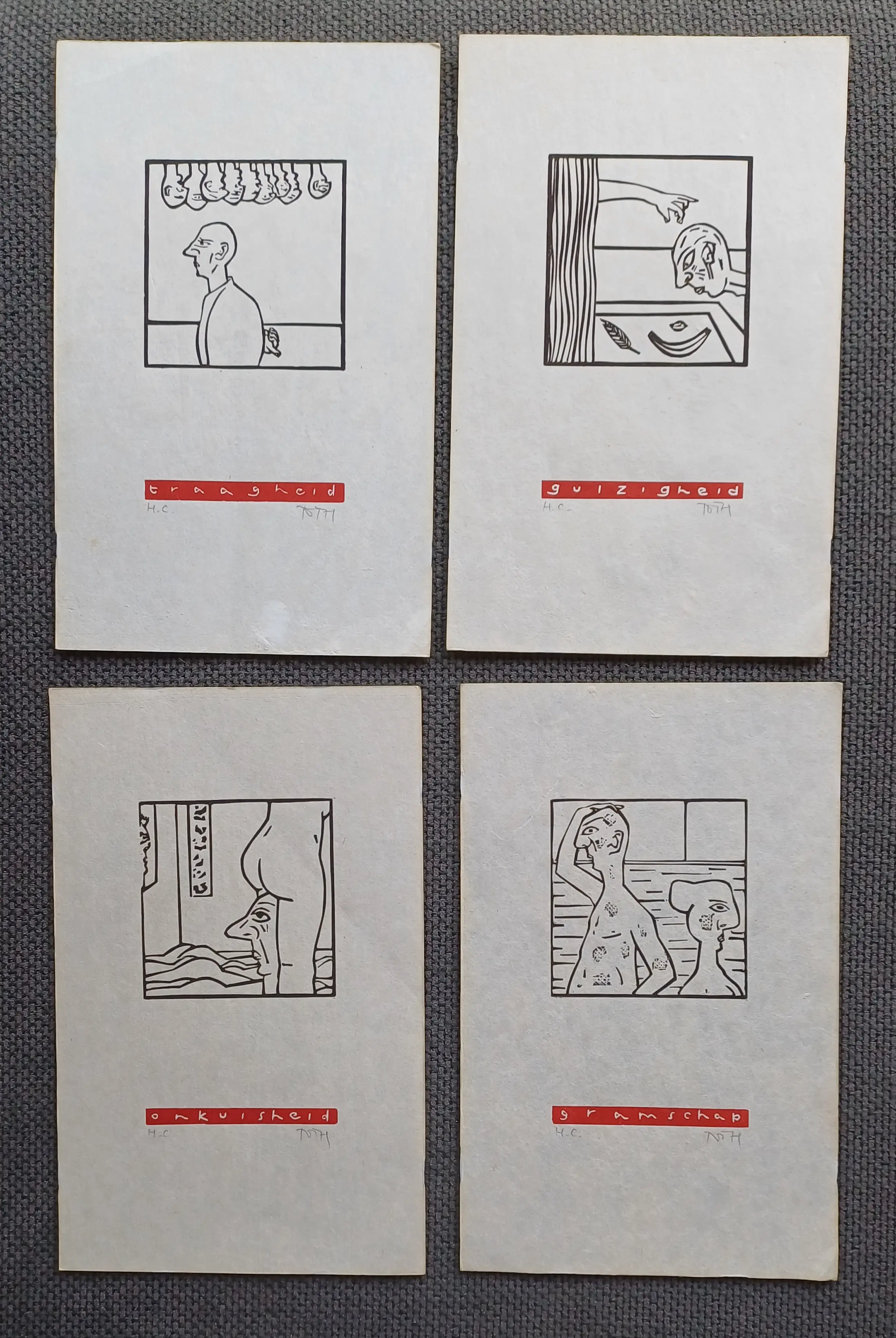 Zeven houtsneden van Thom Thijsse uit 1999. Titel: De Zeven Hoofdzonden. Uitgegeven in opdracht van Change Managements Consultants en alleen verstrekt aan klanten. Gedrukt op 89 grams Kozo papier. Nummer: H.C. Afmetingen blad: H30 x b19,2 cm. Afmetingen voorstelling: H10 x b10 cm. De werken zijn rechts onderaan, met potlood gesigneerd door de kunstenaar.