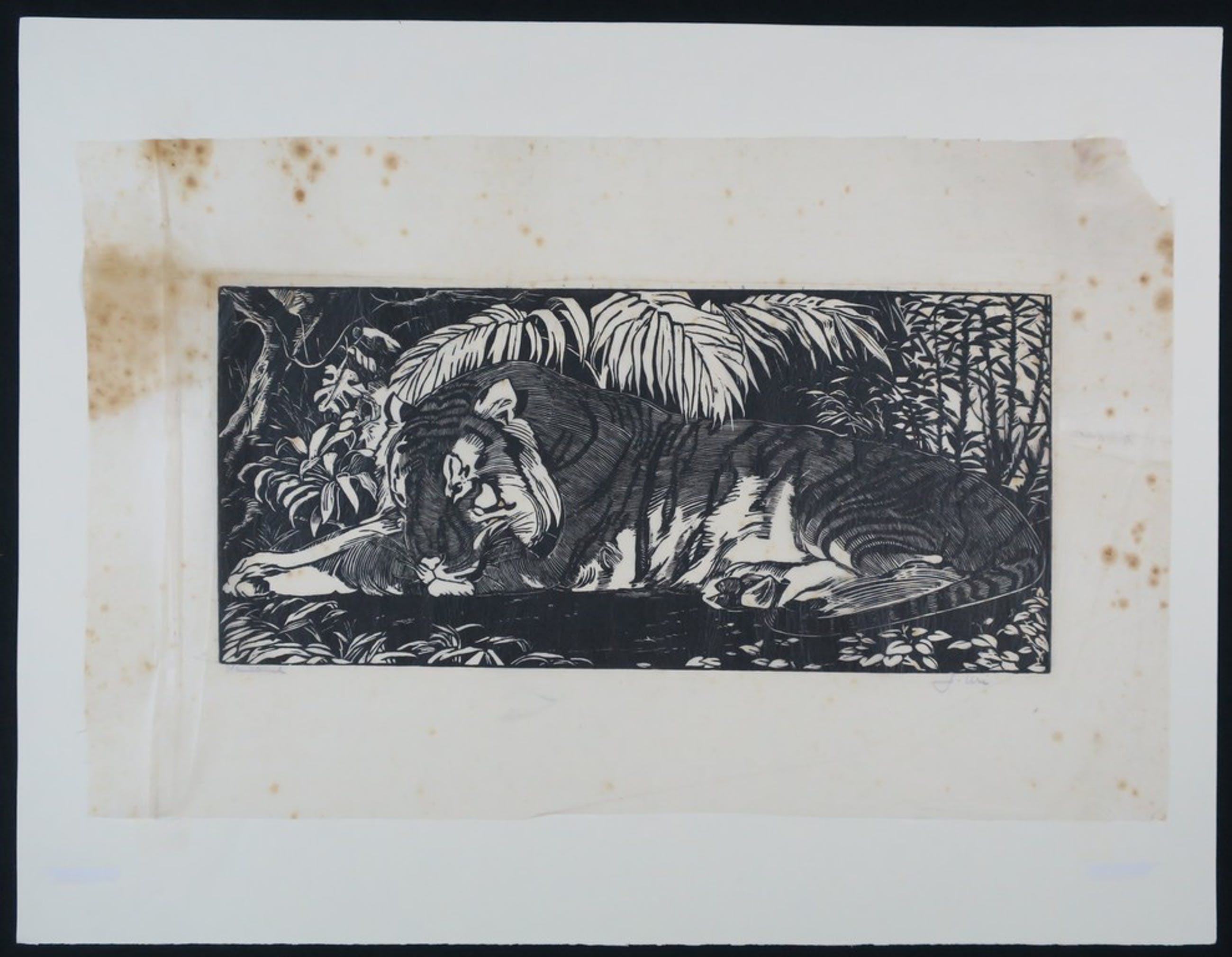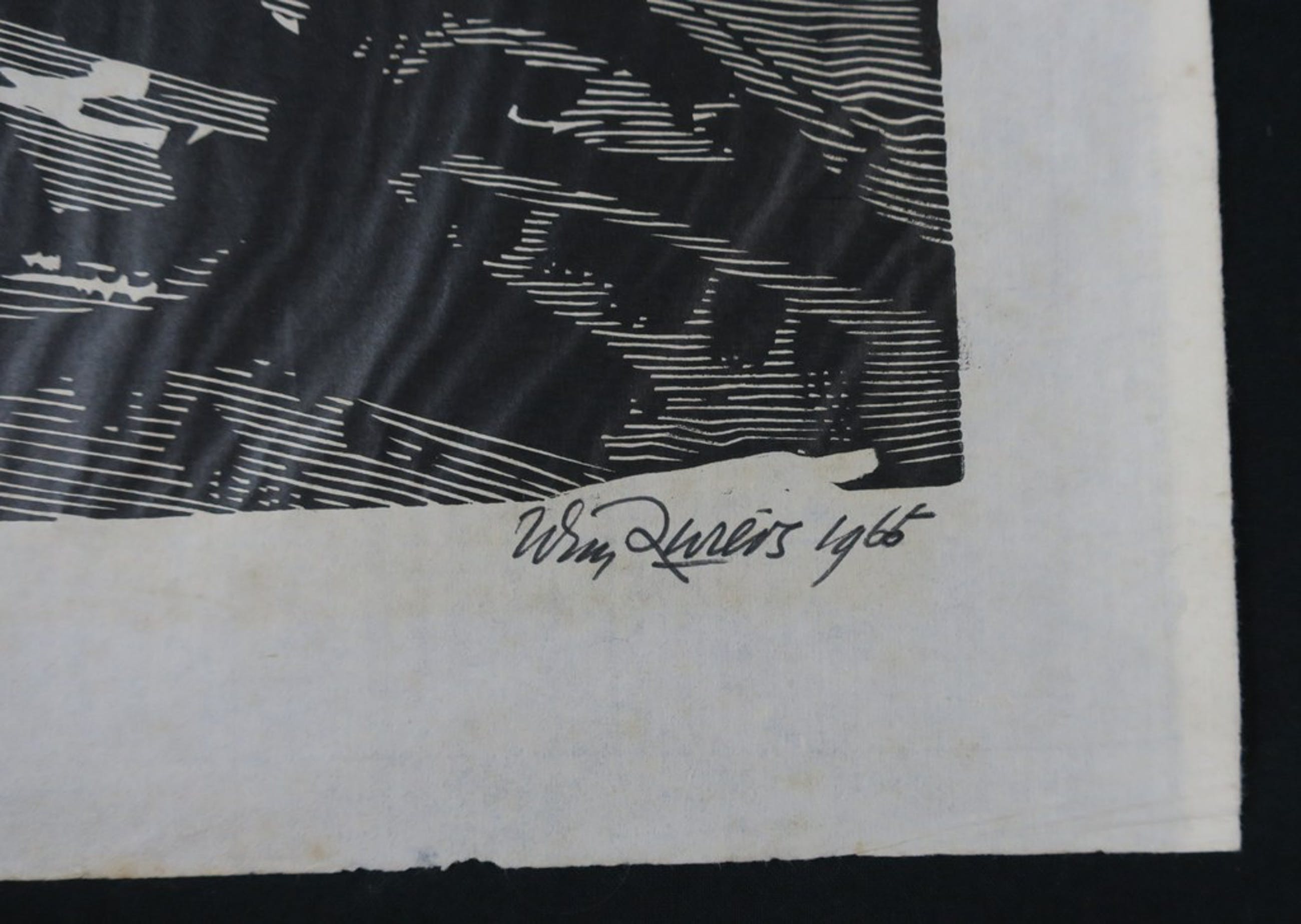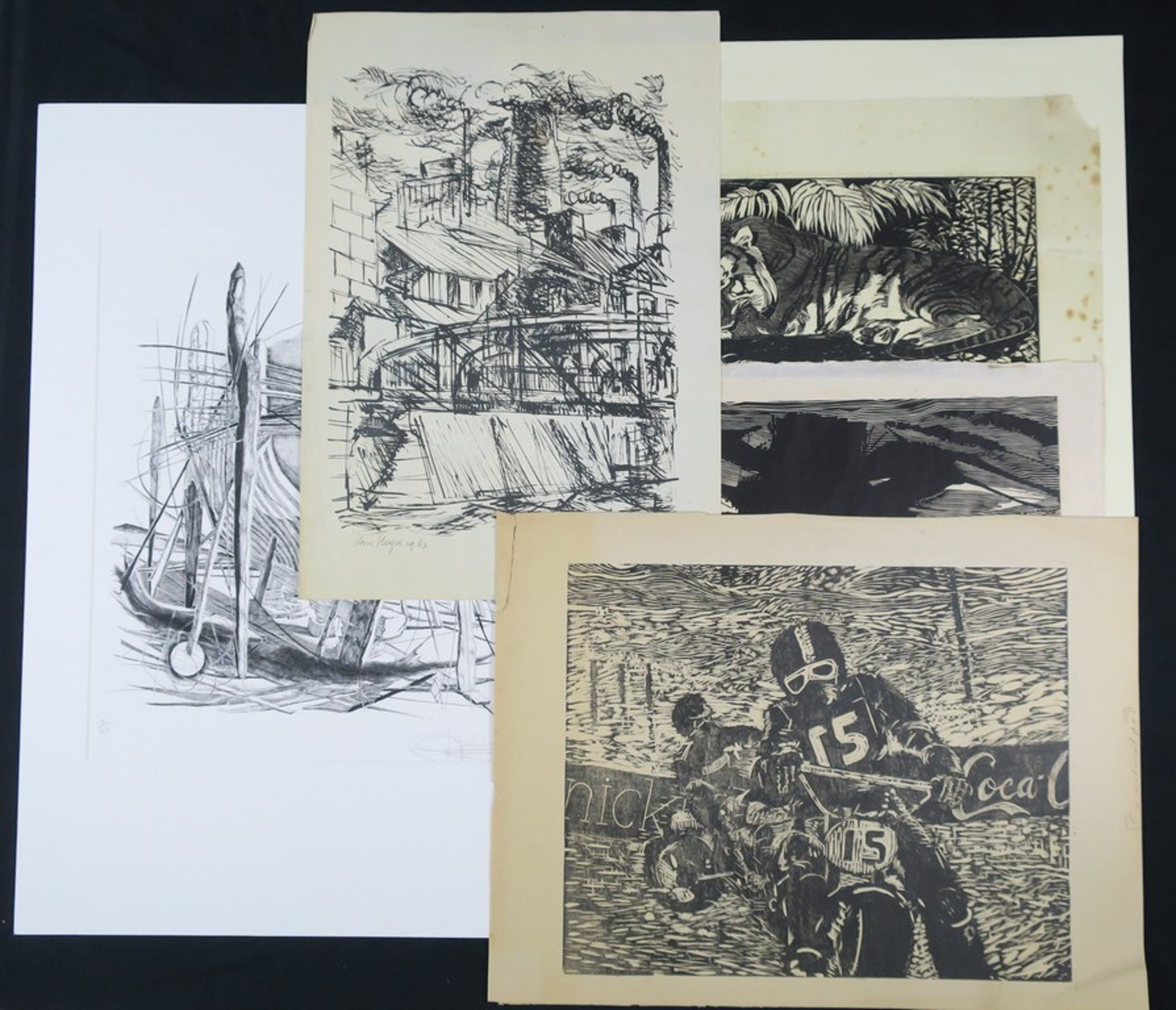 Lot met 5 werken van o.a. Tom Thijsse en Wim Izaks, de andere werken hebben een voor ons onbekende signatuur. Vier van de werken zijn in slechte staat met beschadigingen, oxidatiestippen en vergeling in het blad.