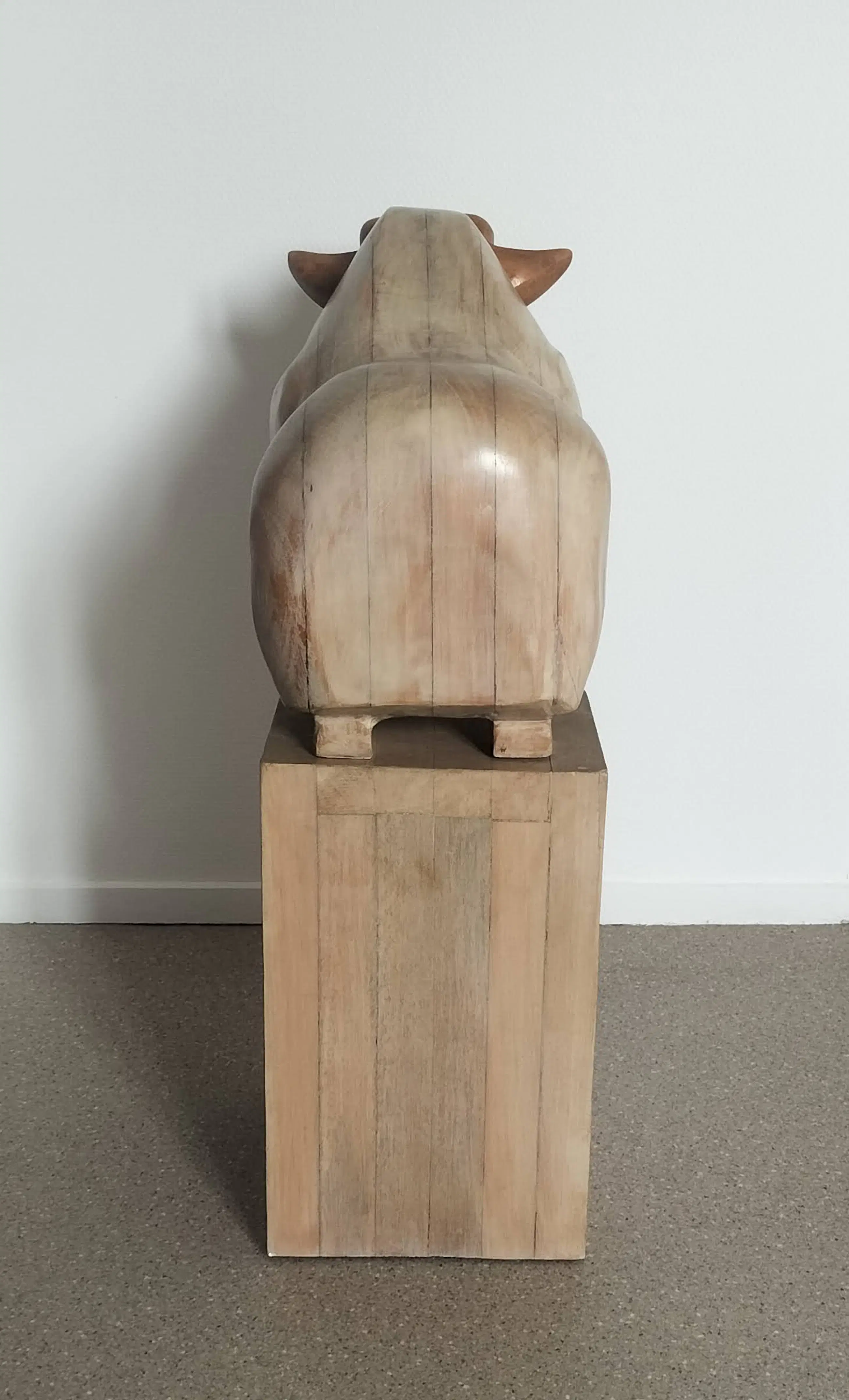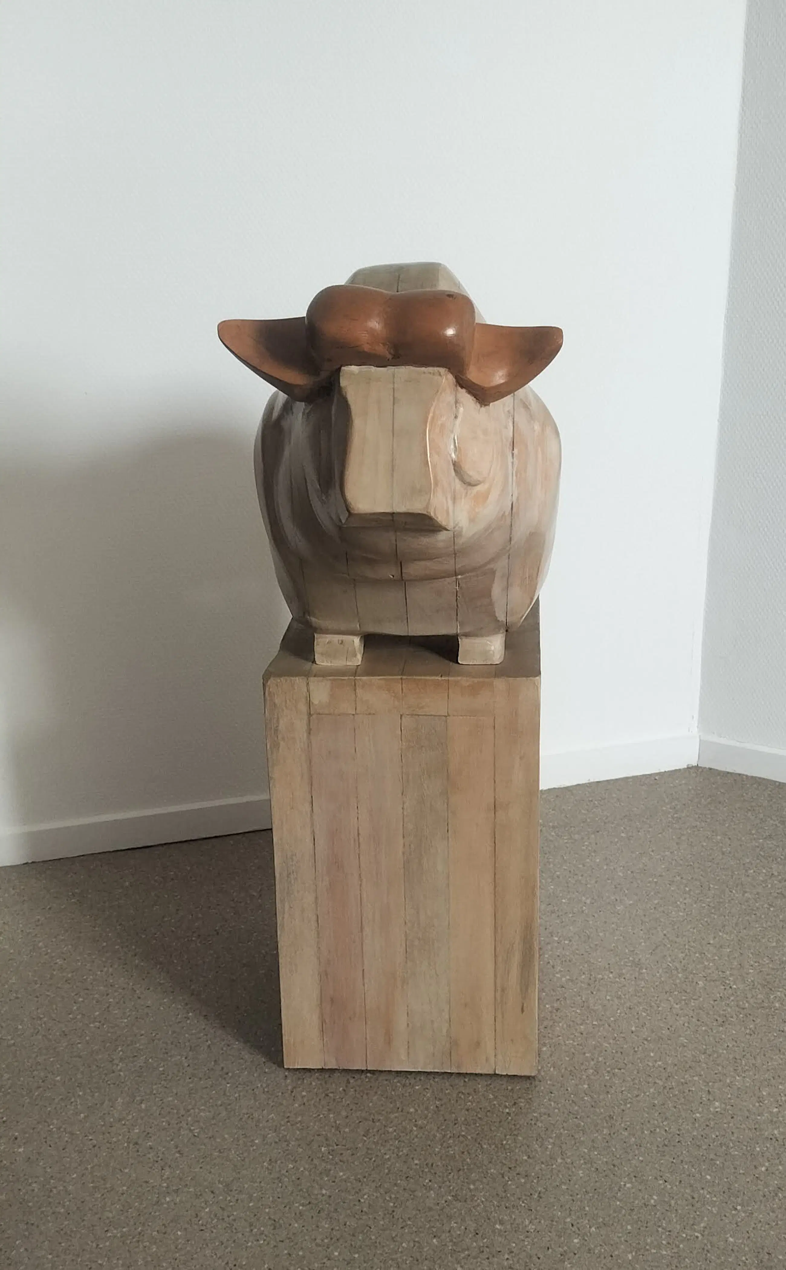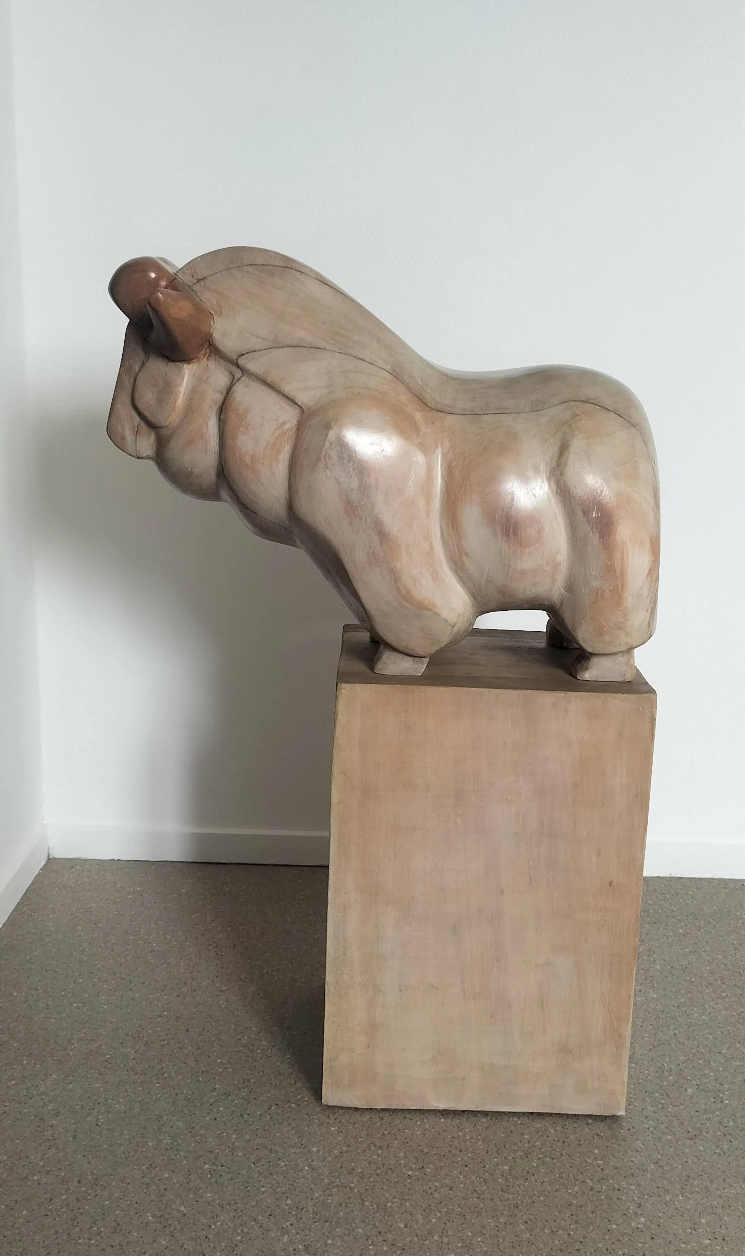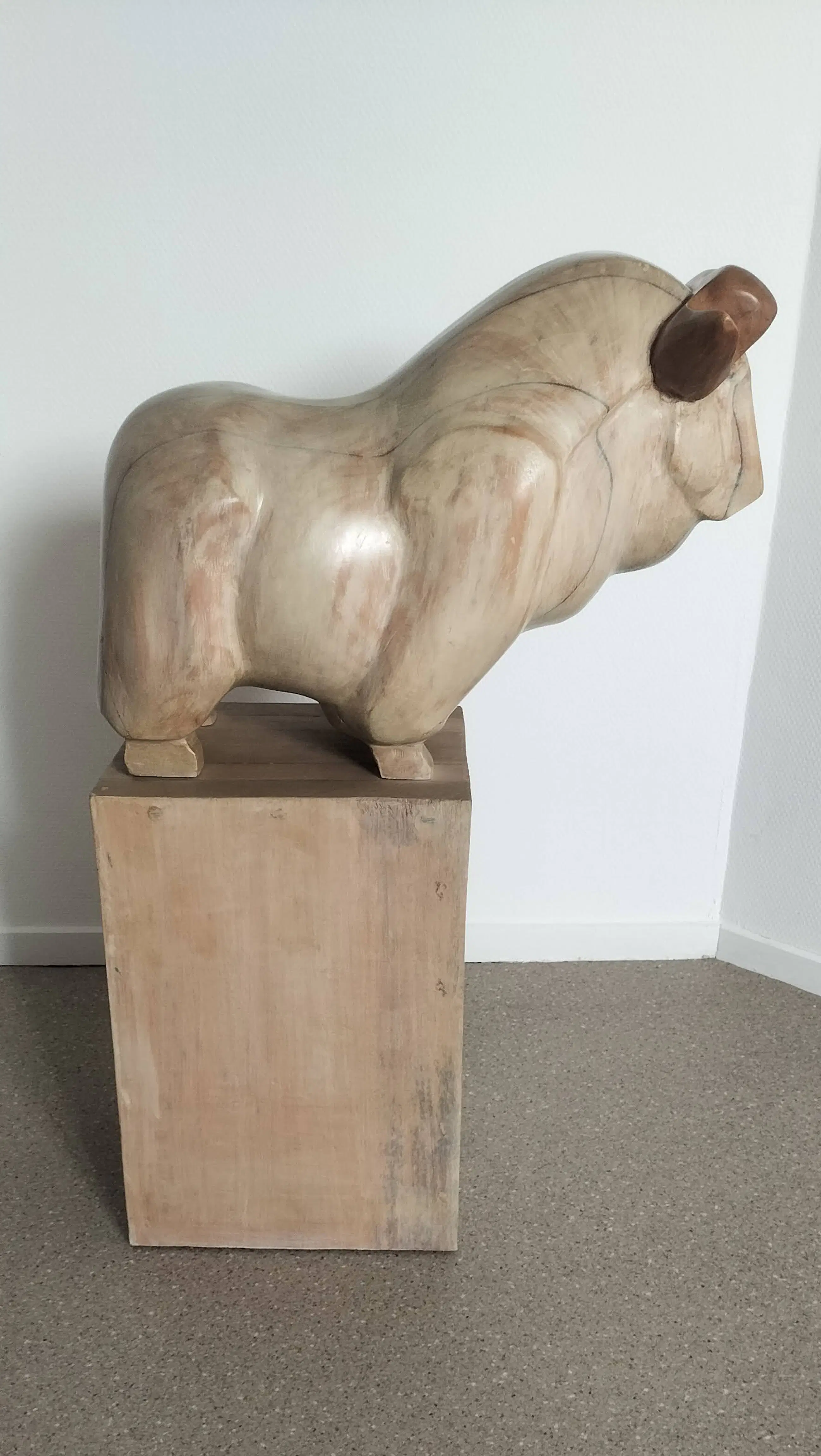 De Oeros van tom Waakop Reijers in spaans hout. Een imposant beeld. de afmetingen zijn van het beeld, de sokkel is 40x27x24. In totaal dus 80 cm hoog.