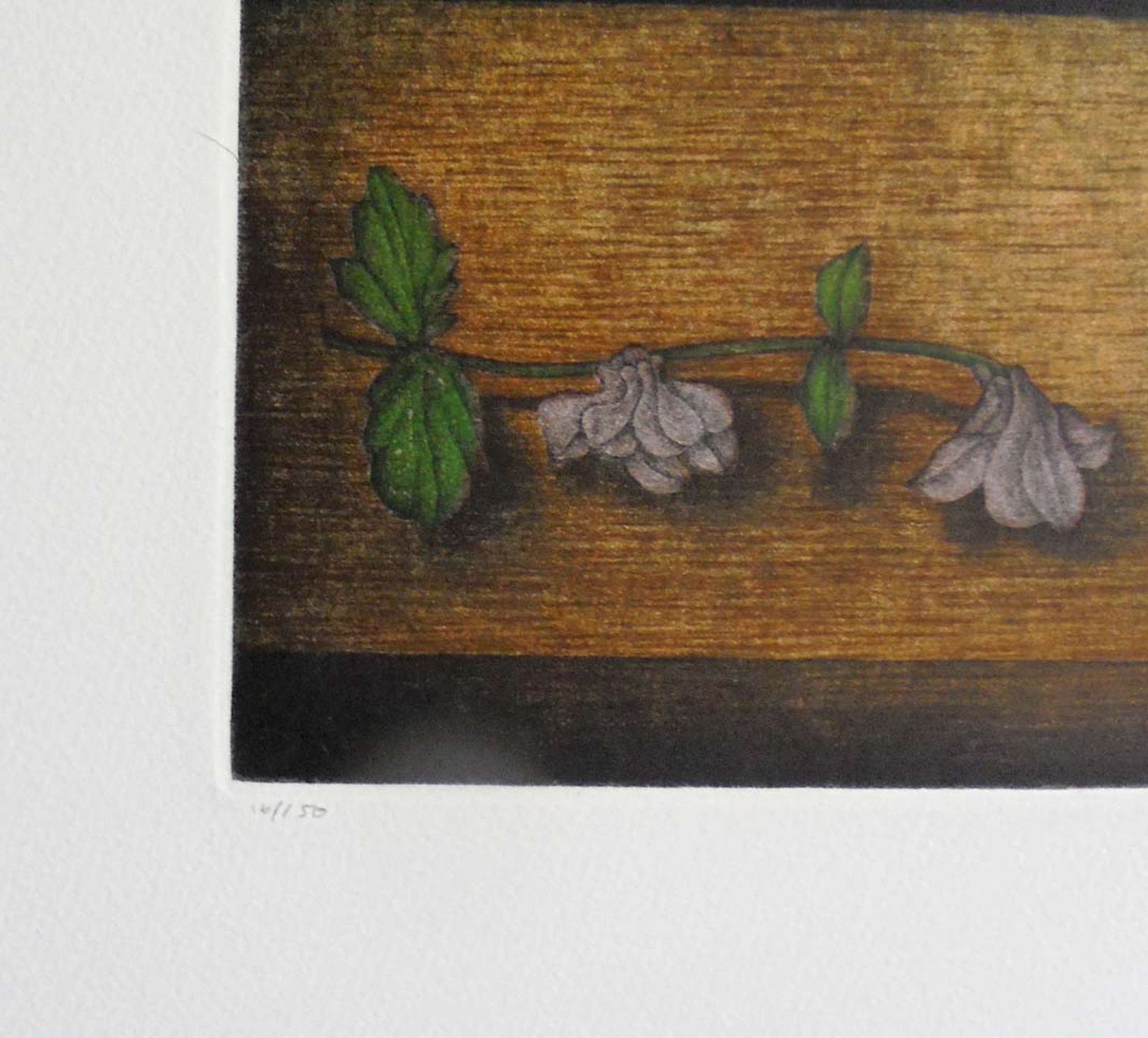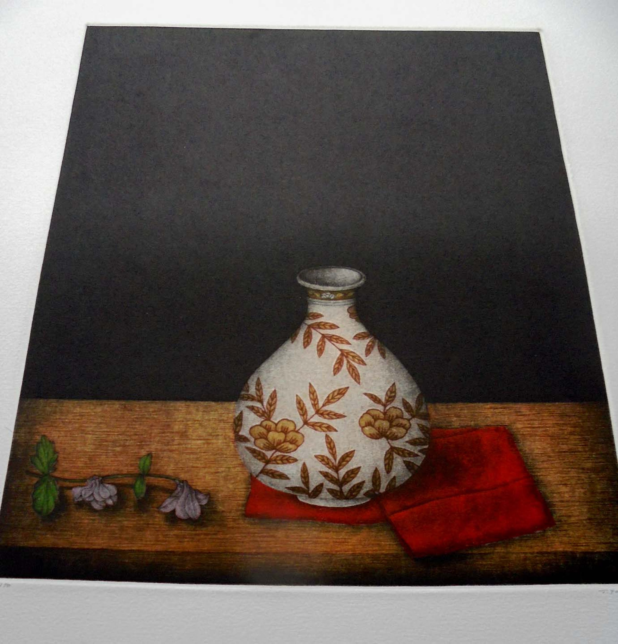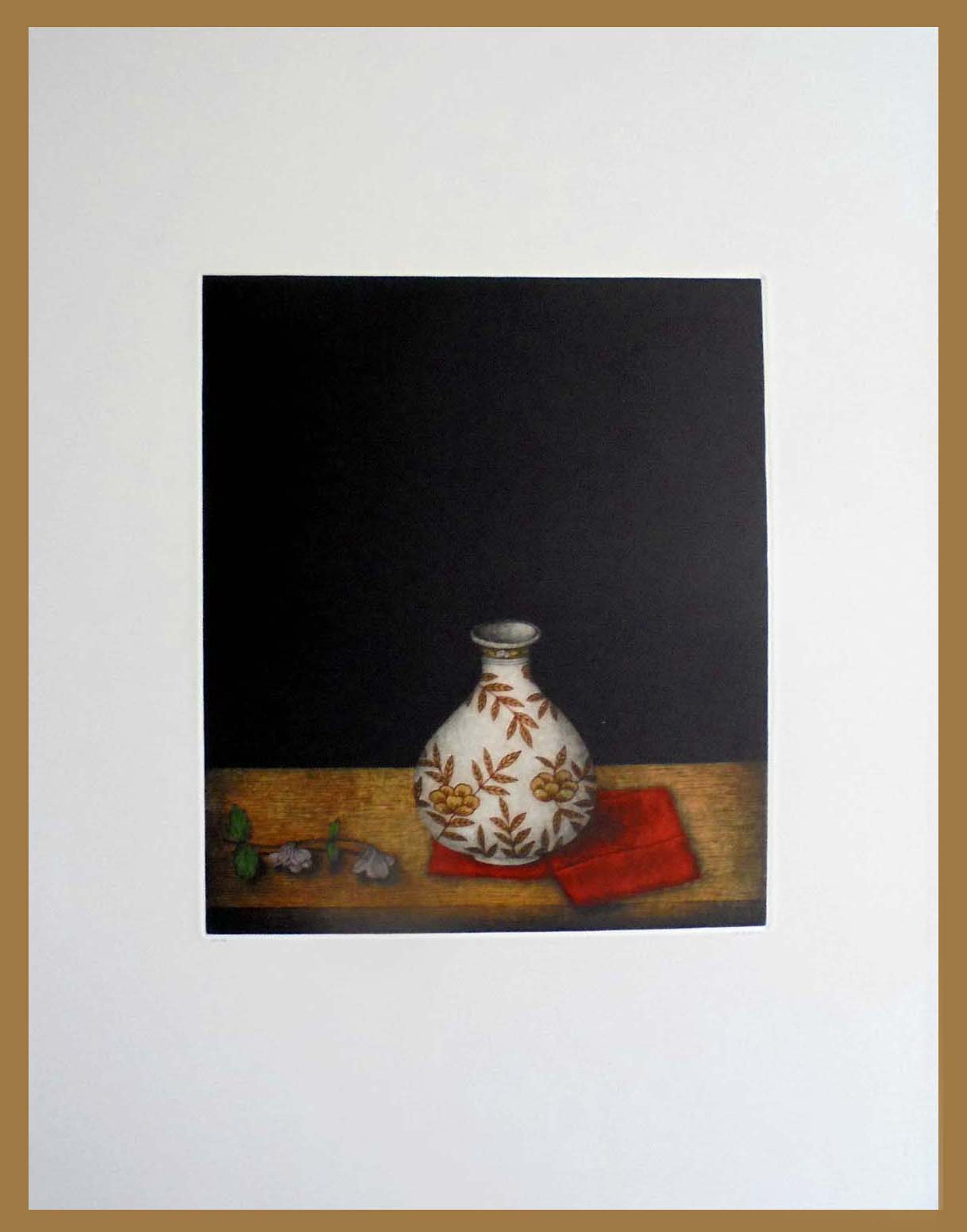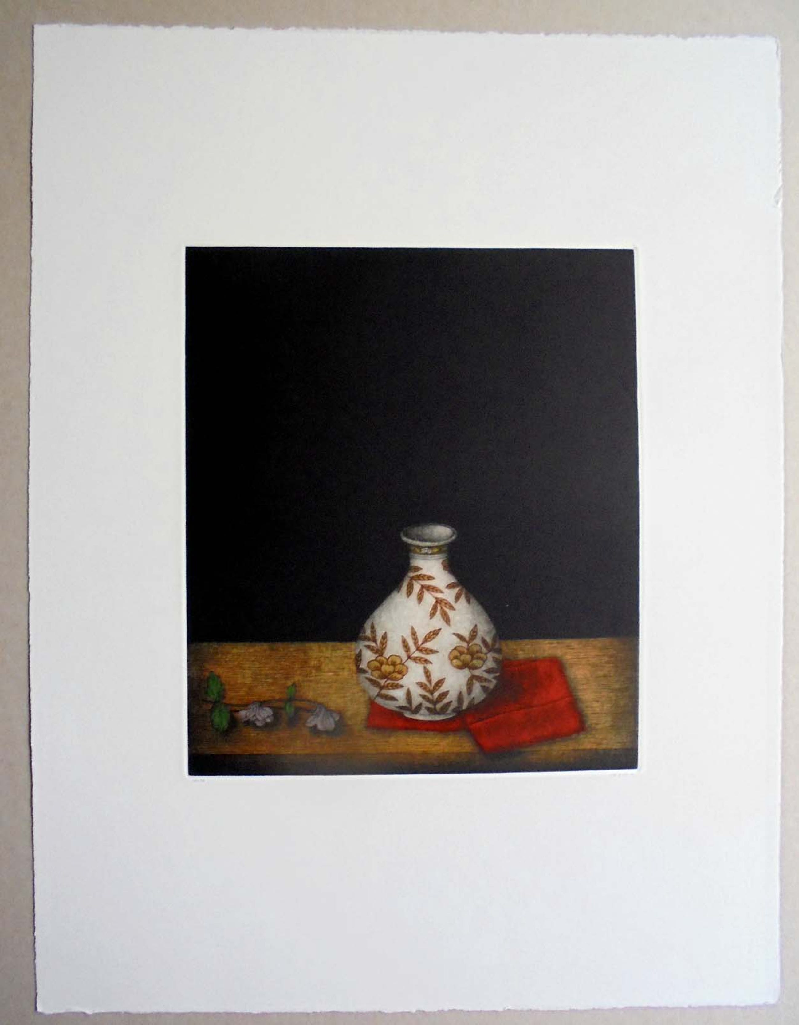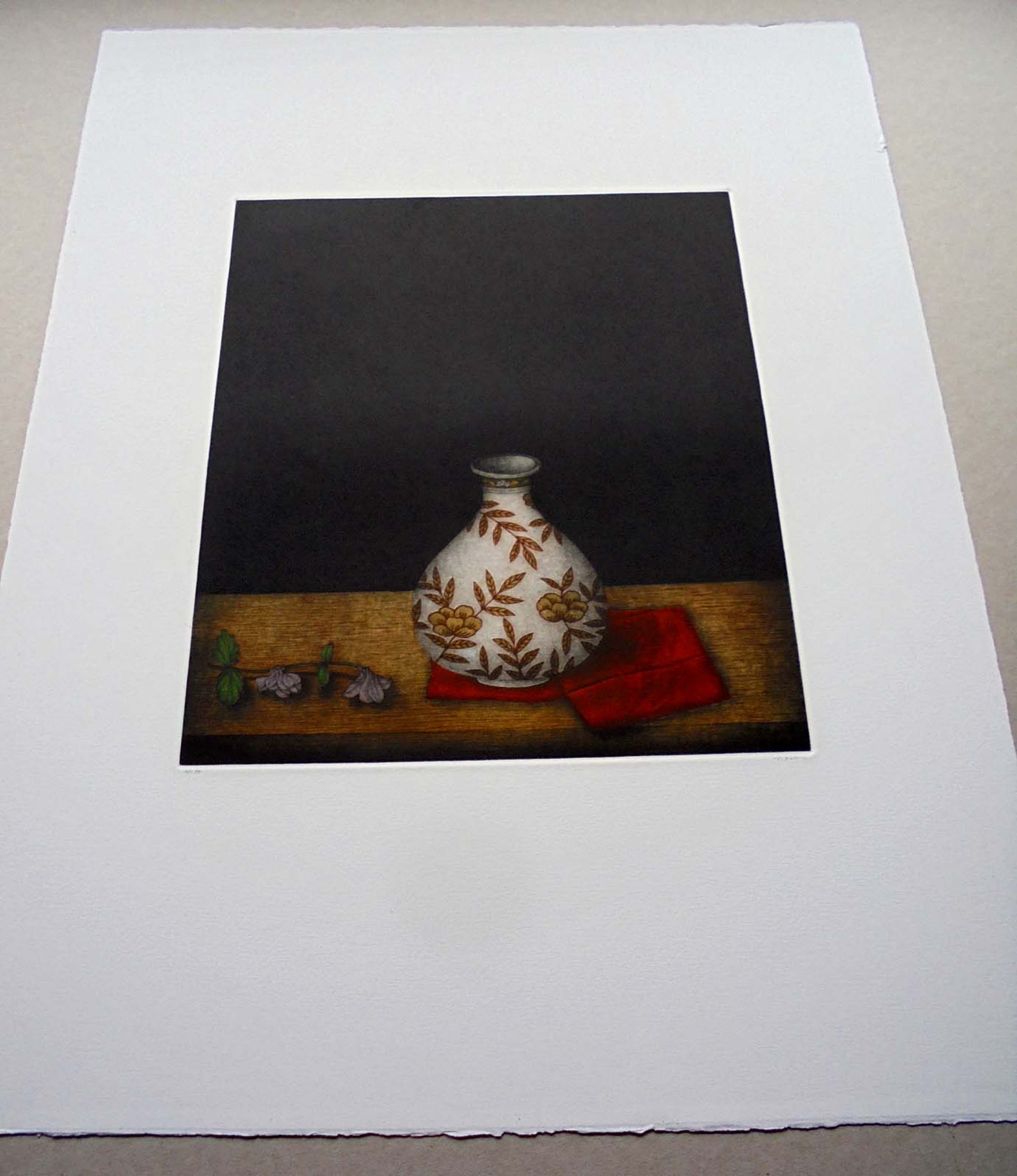 Tomoe Yokoi Stilleven met Sakebottle mezzotint-ets op handgeschept katoen papier handgesigneerd genummerd : 16/150