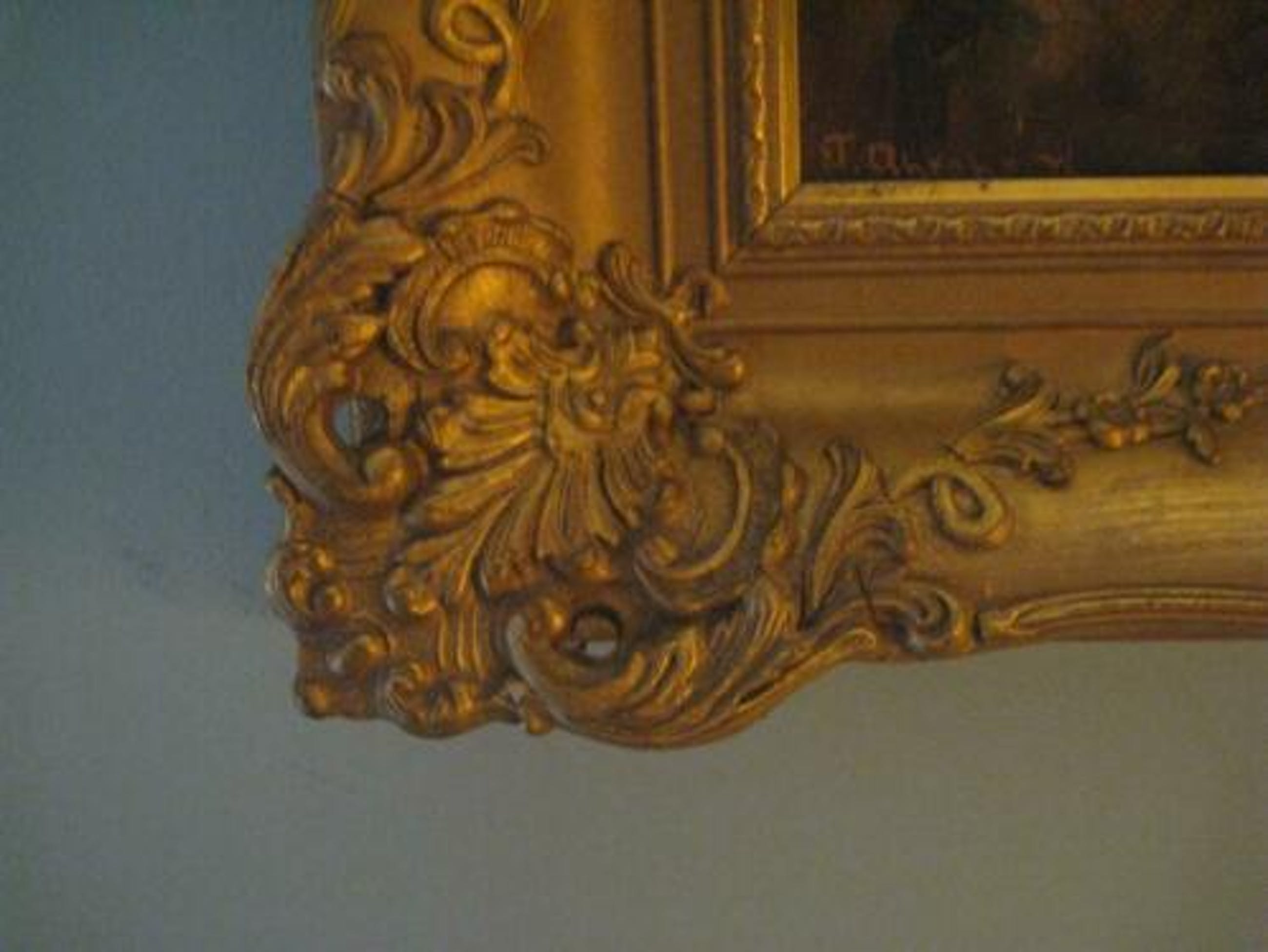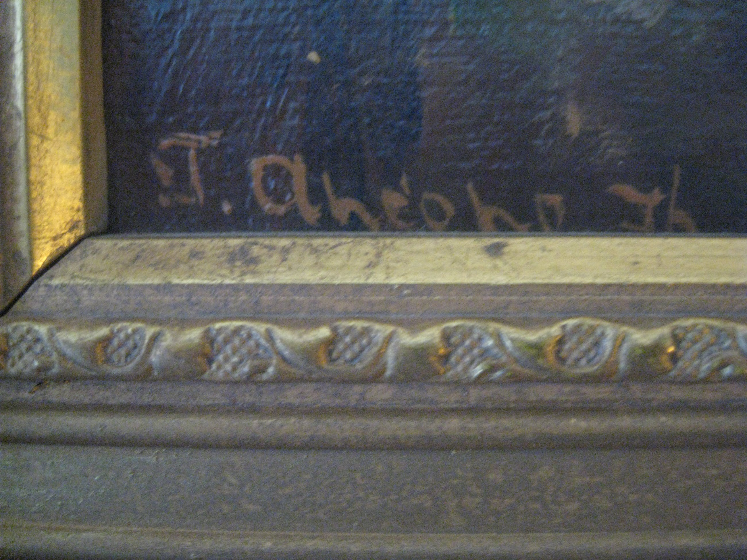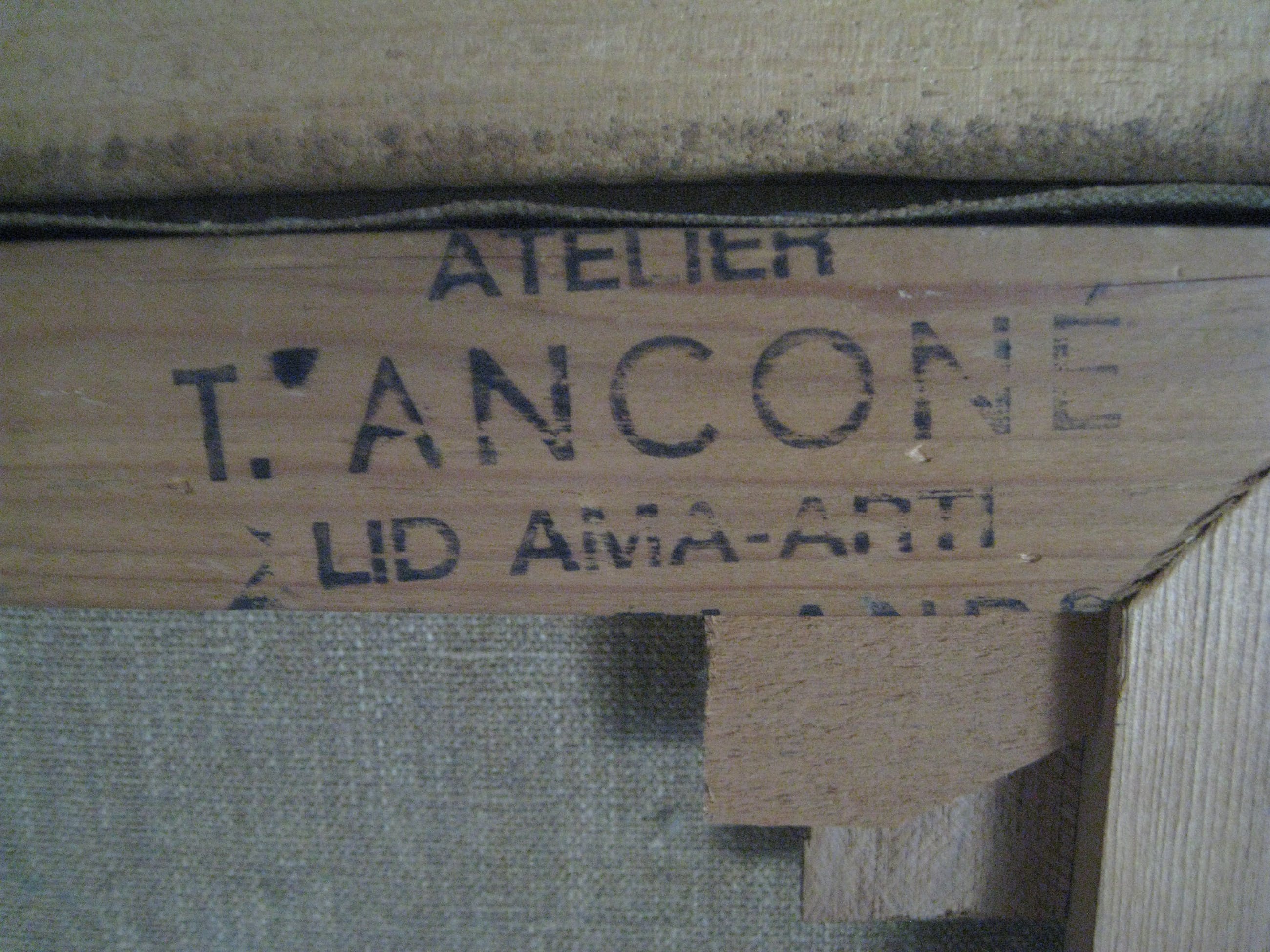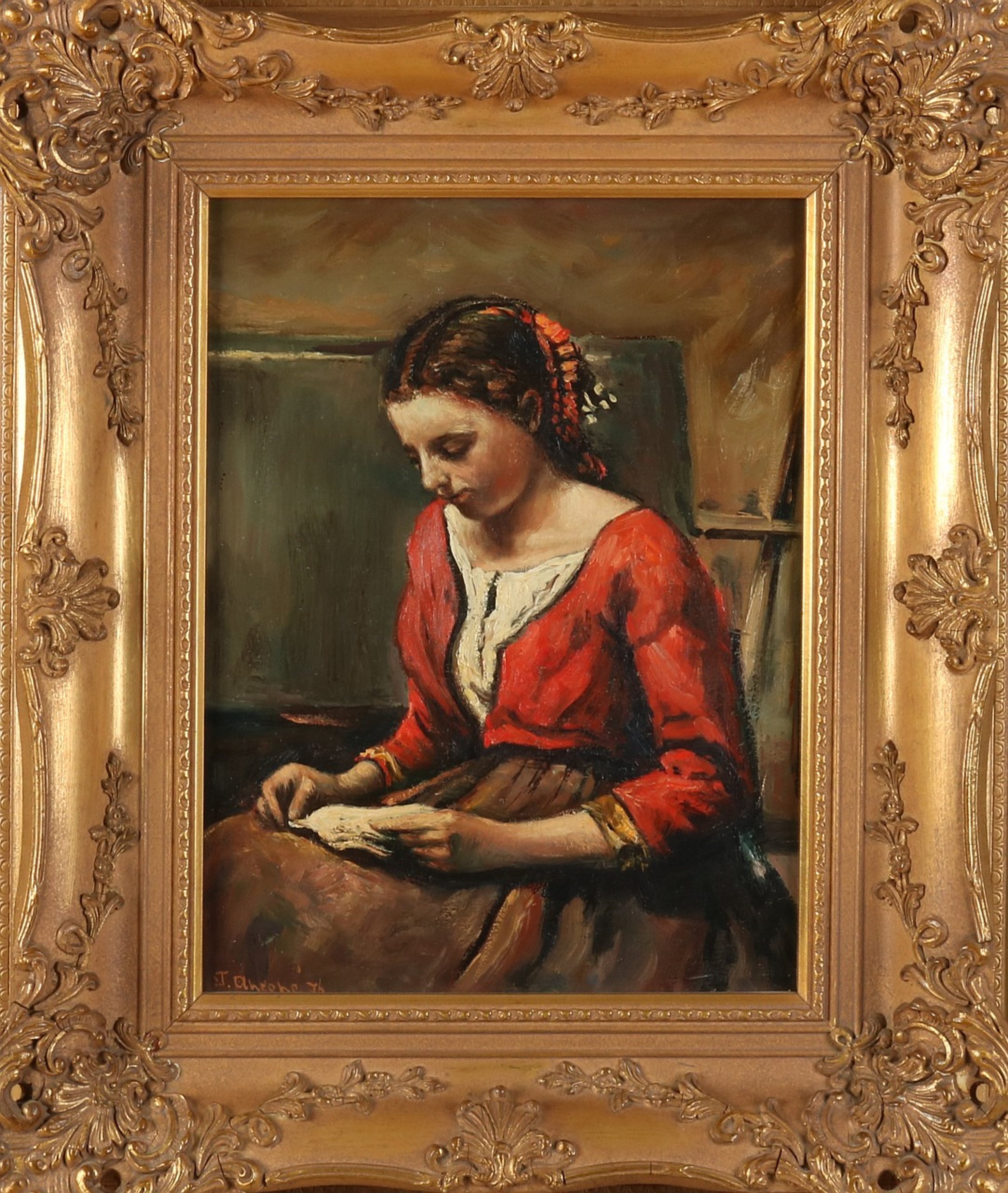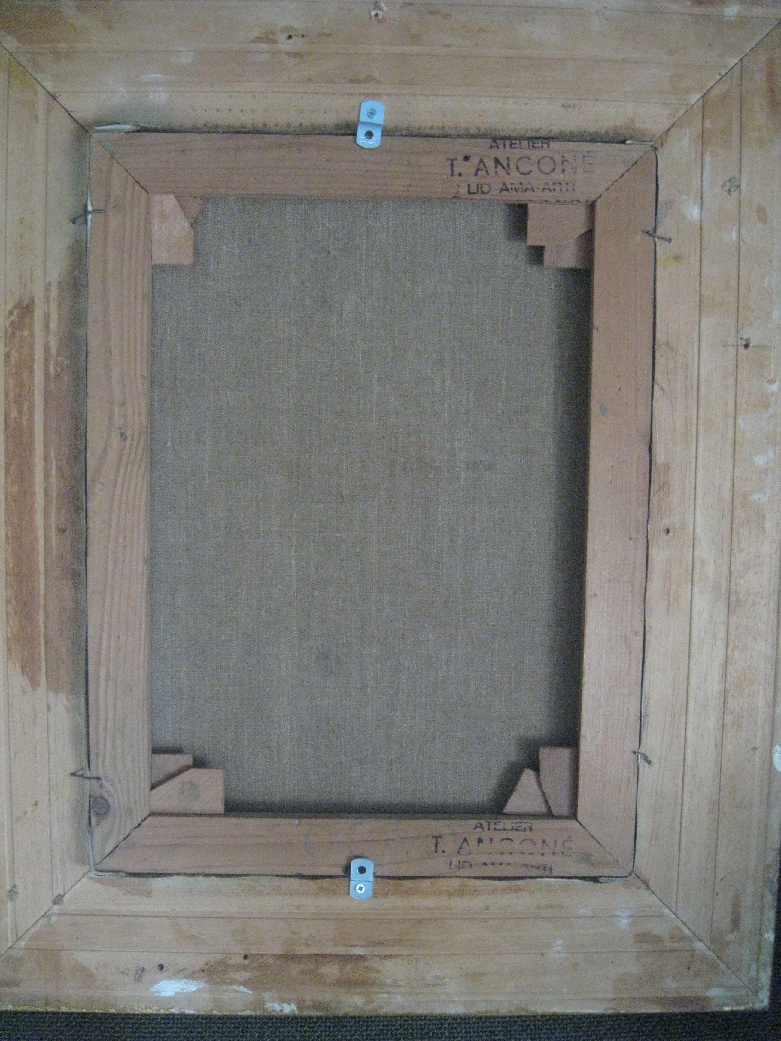 Knap werk van de oldenzaalse schilder Ton Anconé met fraai weergegeven details zoals de handen en het gezicht. Het werk zit in een gave gebronsde ornamentenlijst .