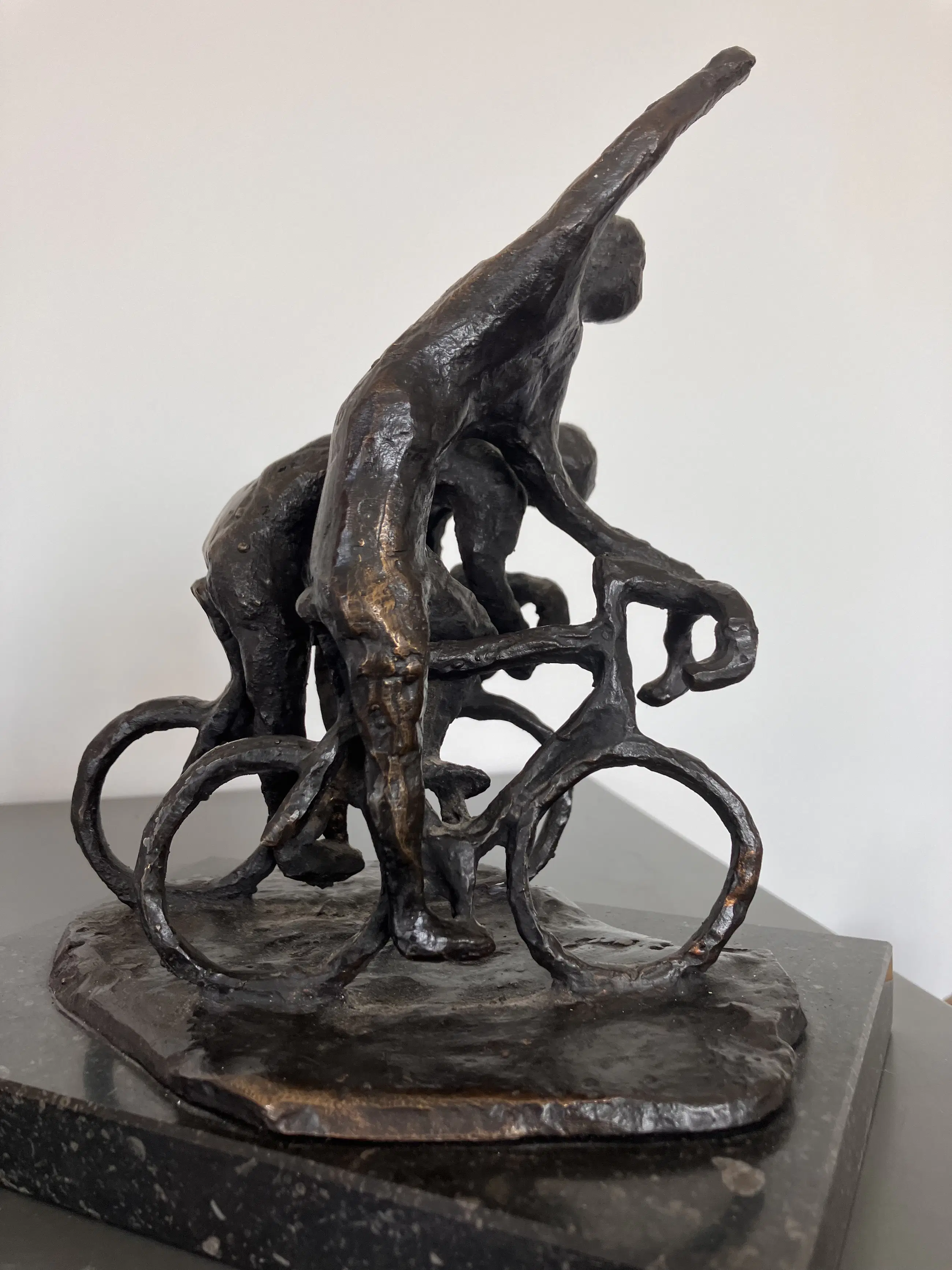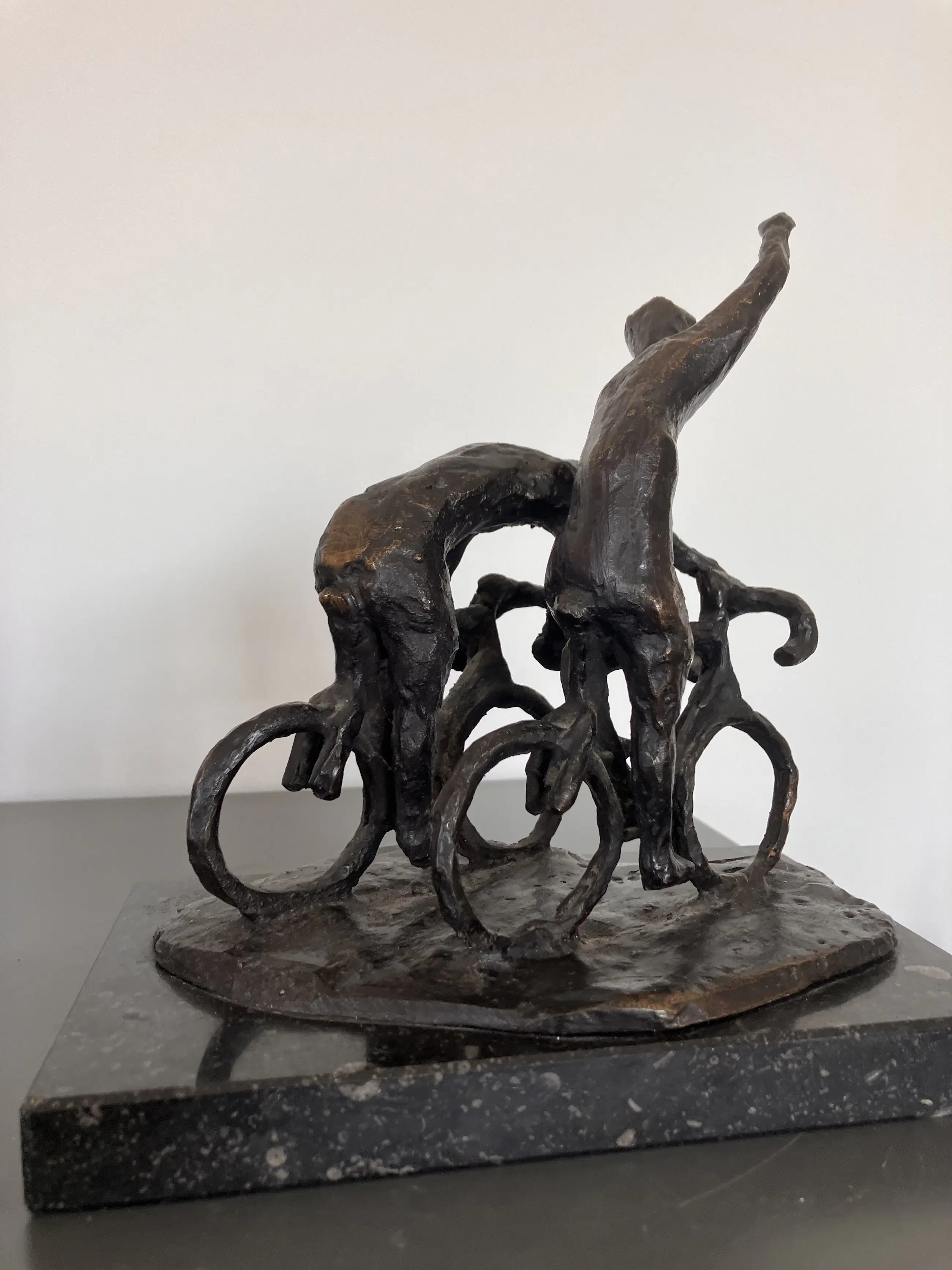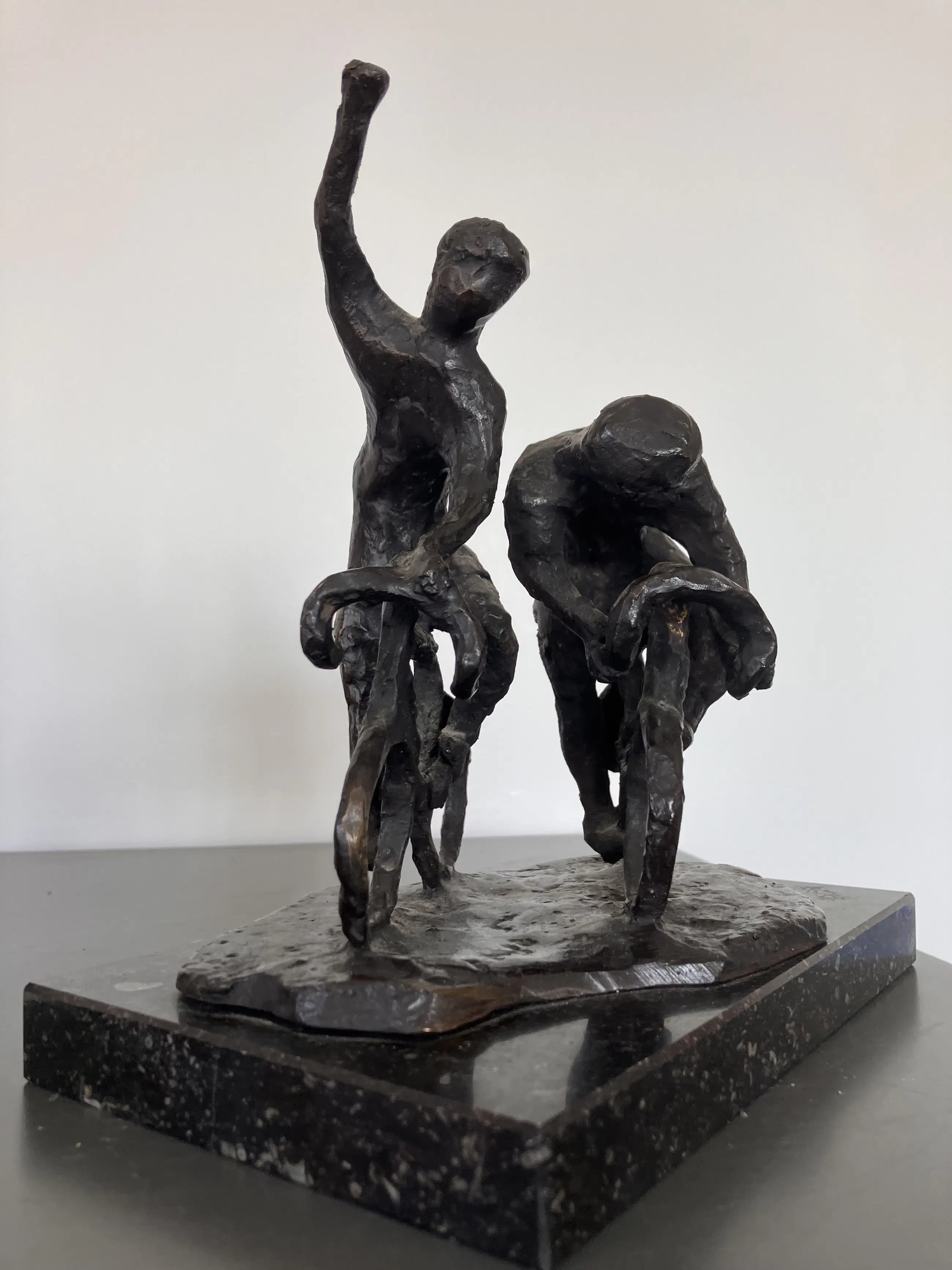 Wielrenners bij de finishlijn Zwaar bronzen beeld op natuurstenen sokkel