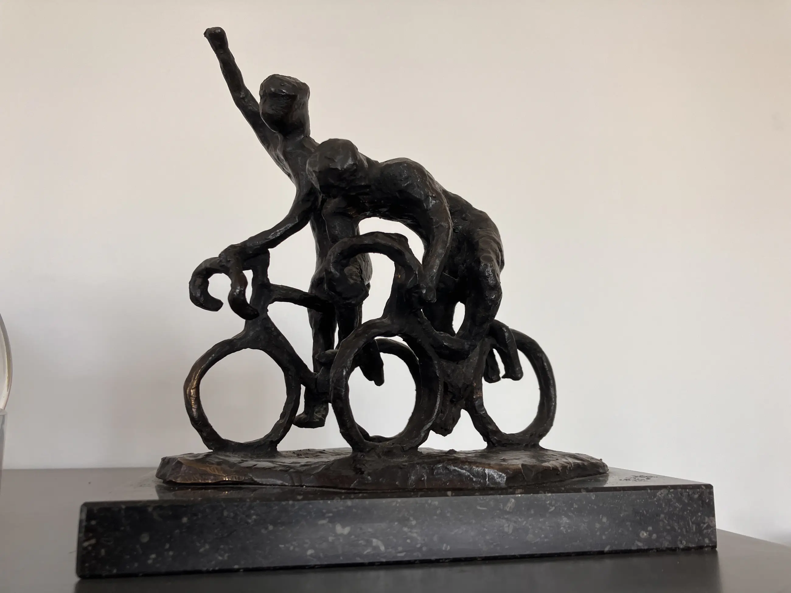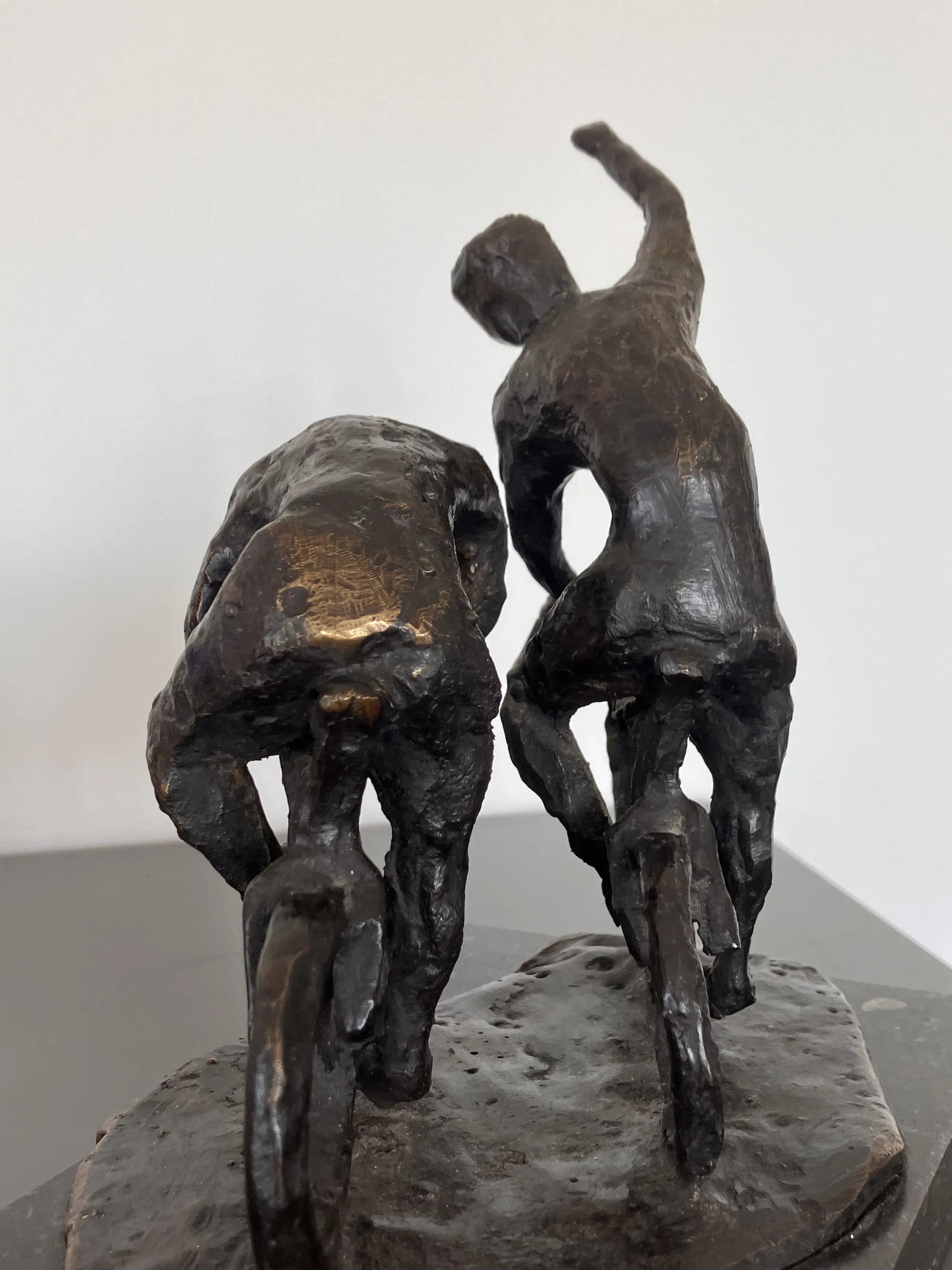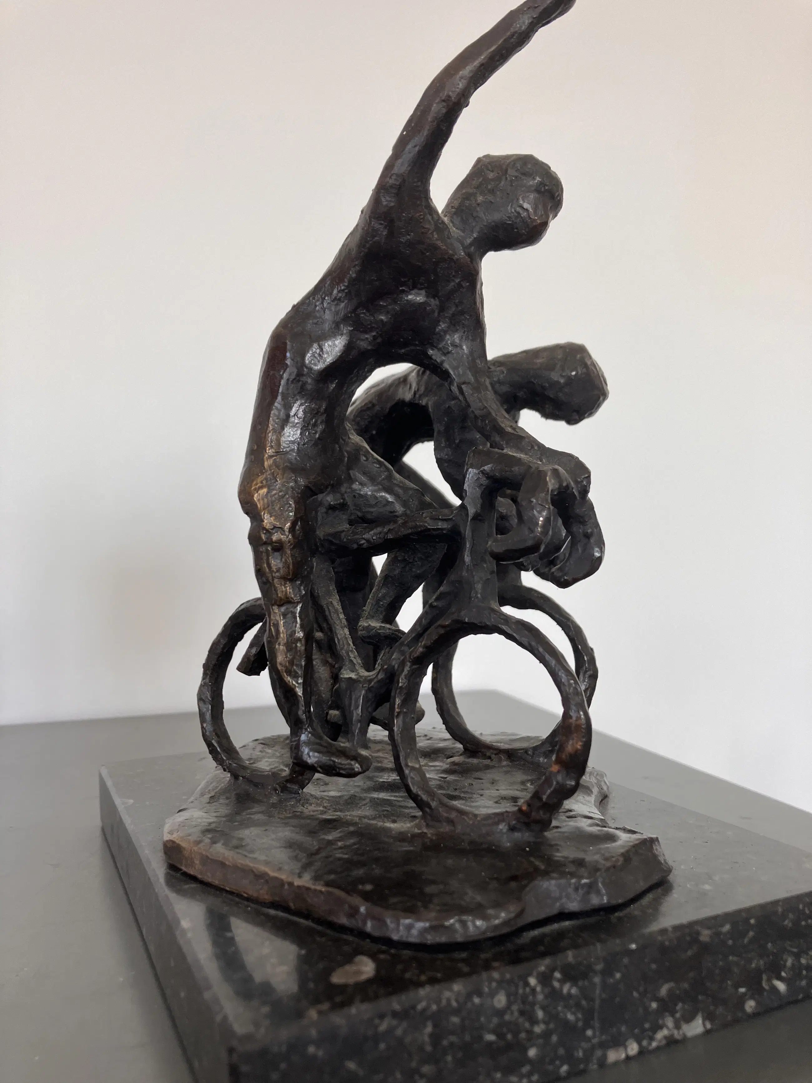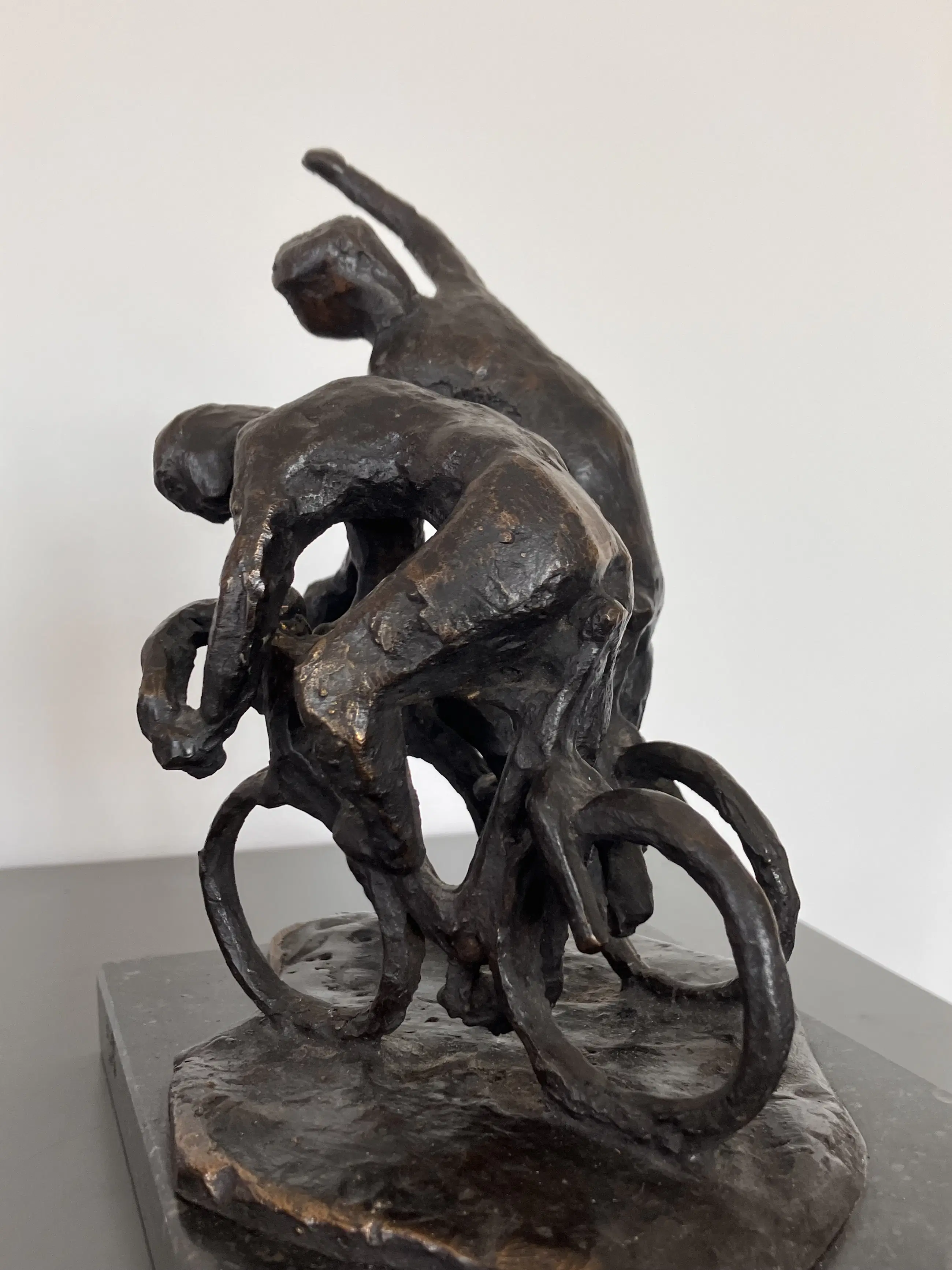 Wielrenners bij de finishlijn Zwaar bronzen beeld op natuurstenen sokkel
