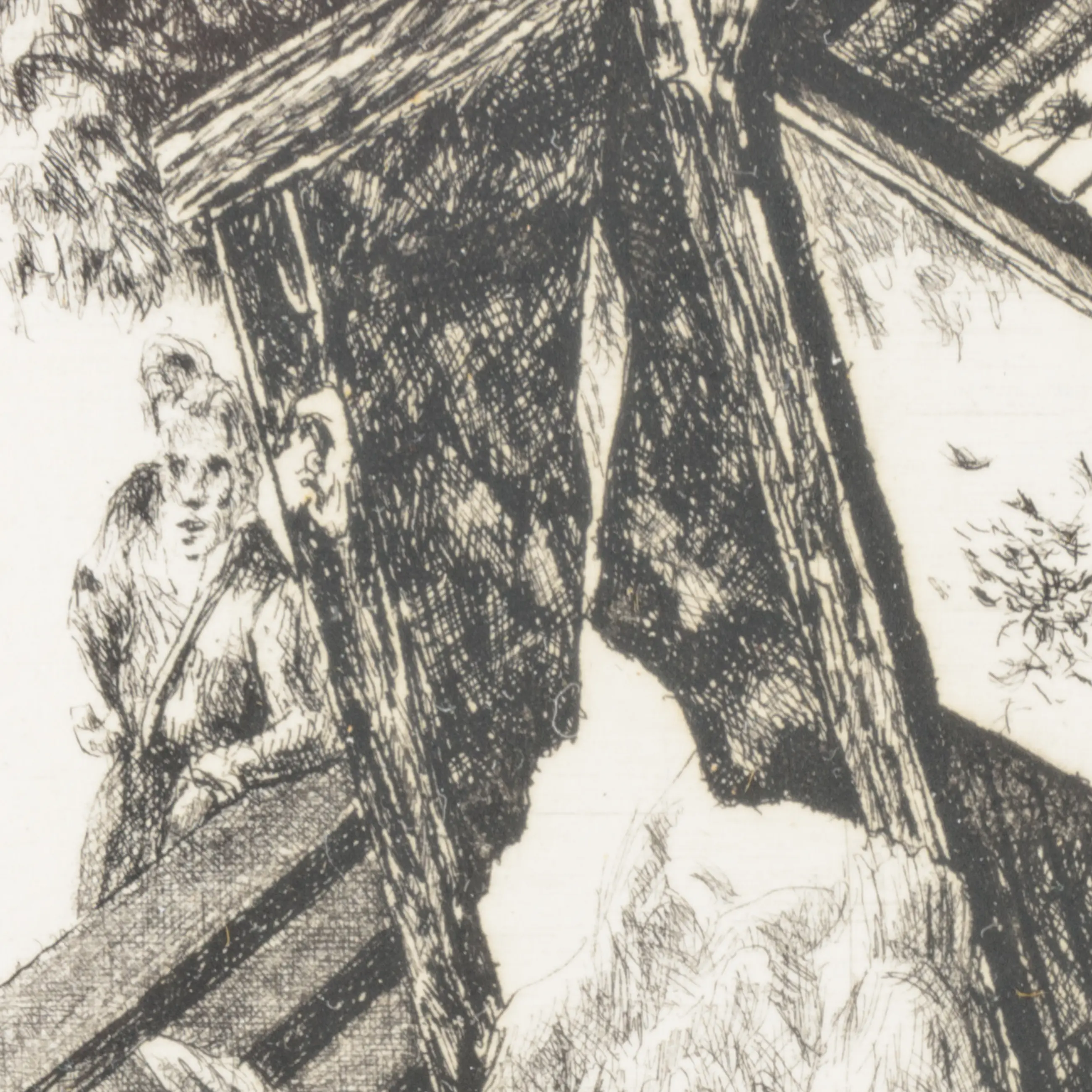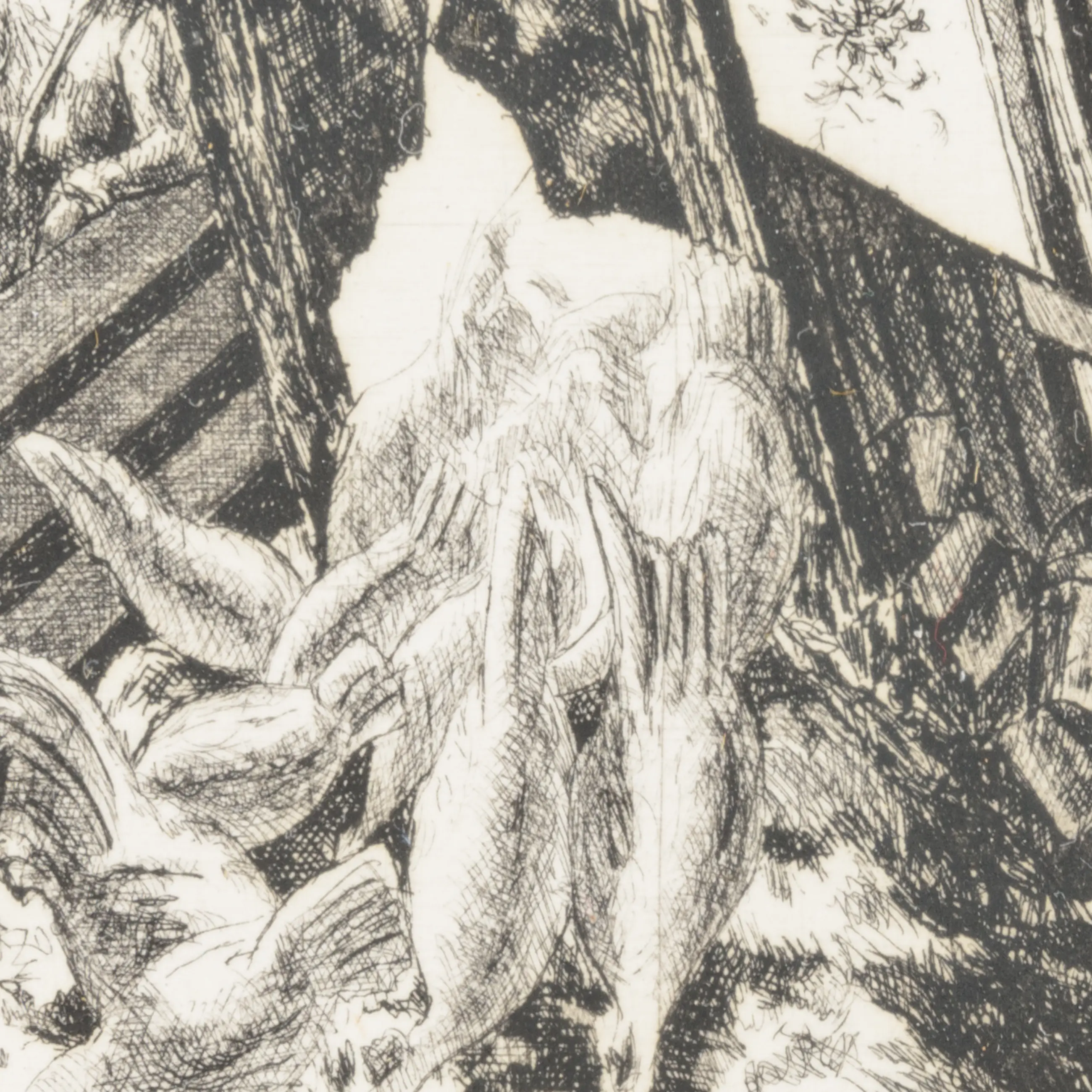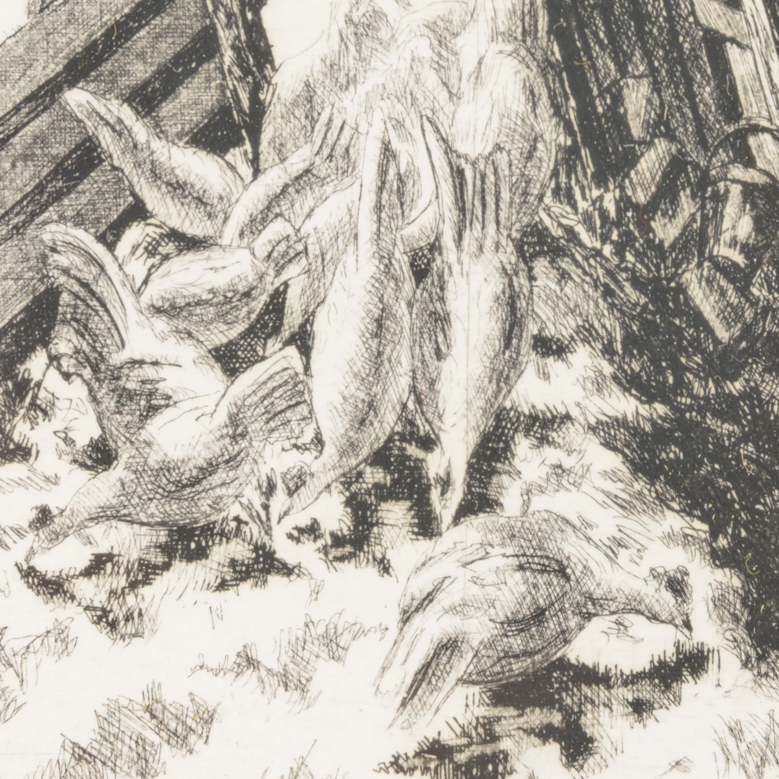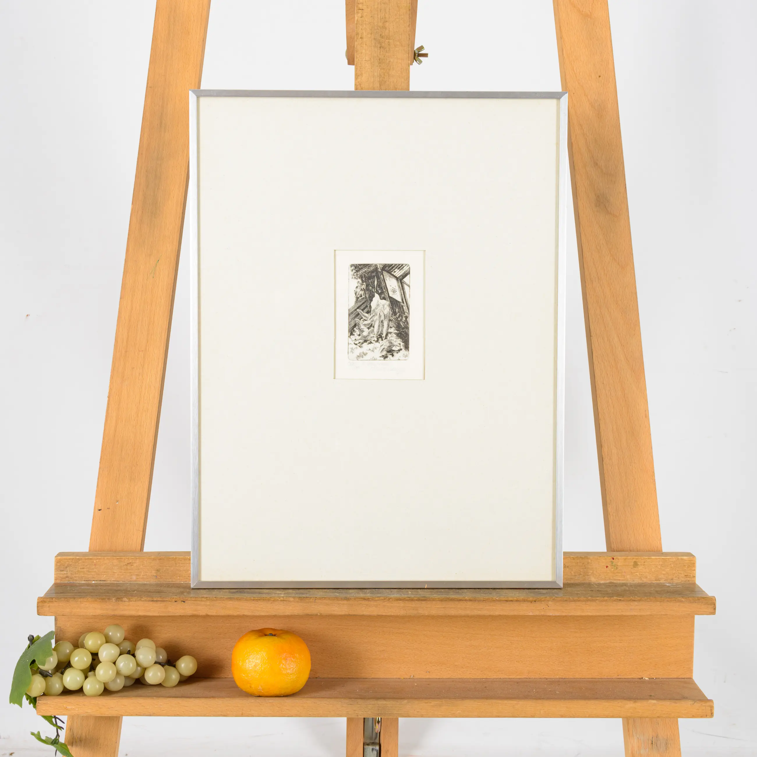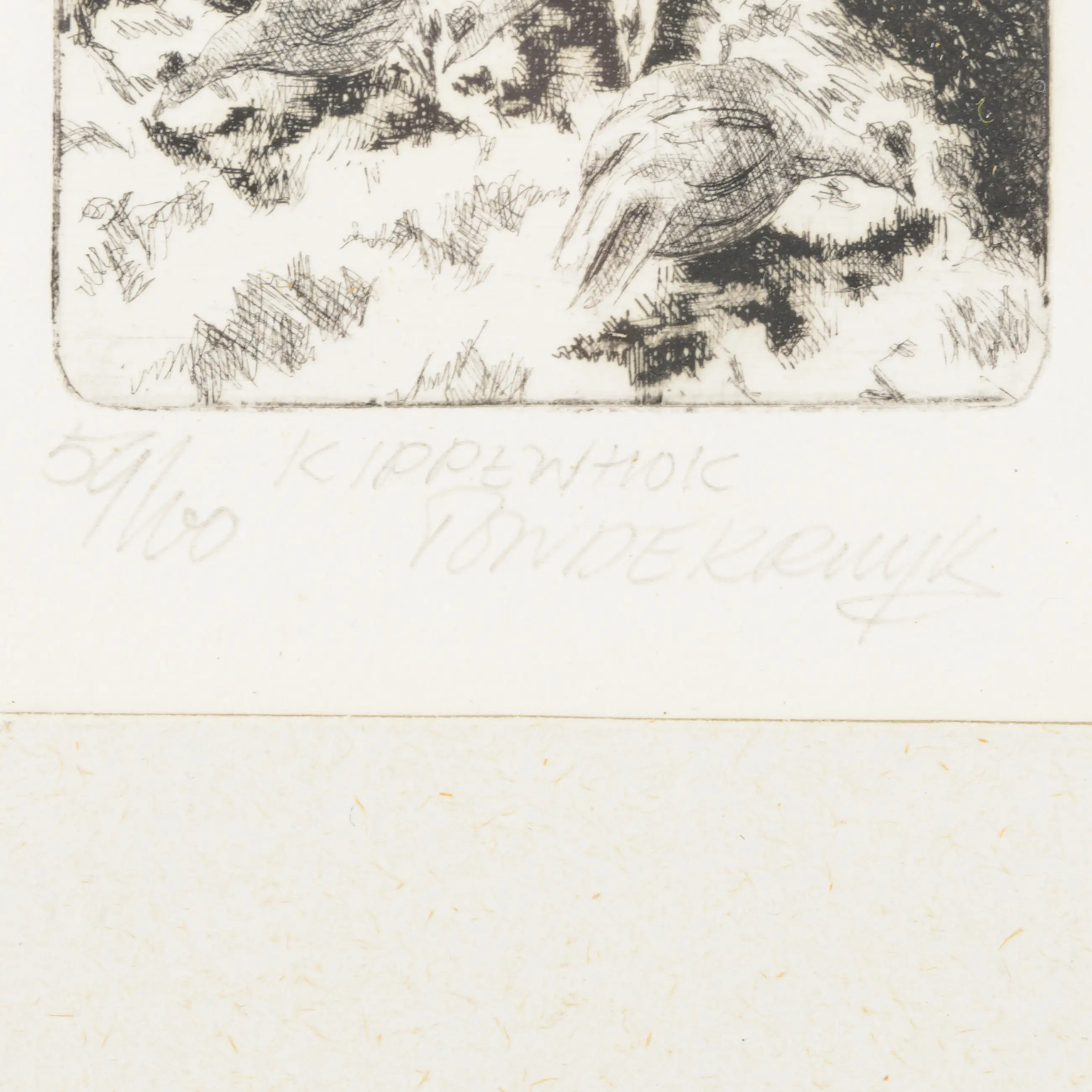 Een ets van een boer die het kippenhok inkijkt. Mooi ingelijst. Gemaakt door Ton de Kruijk. Hij woont en werkt in Bussum. Naast zijn werk als beeldend kunstenaar is hij actief als docent tekenen en schilderen, en verzorgt hij vanuit zijn atelier in Bussum diverse lessen en workshops. Het Gooi vormt een belangrijke inspiratiebron voor zijn schilderijen, tekeningen en grafiek.