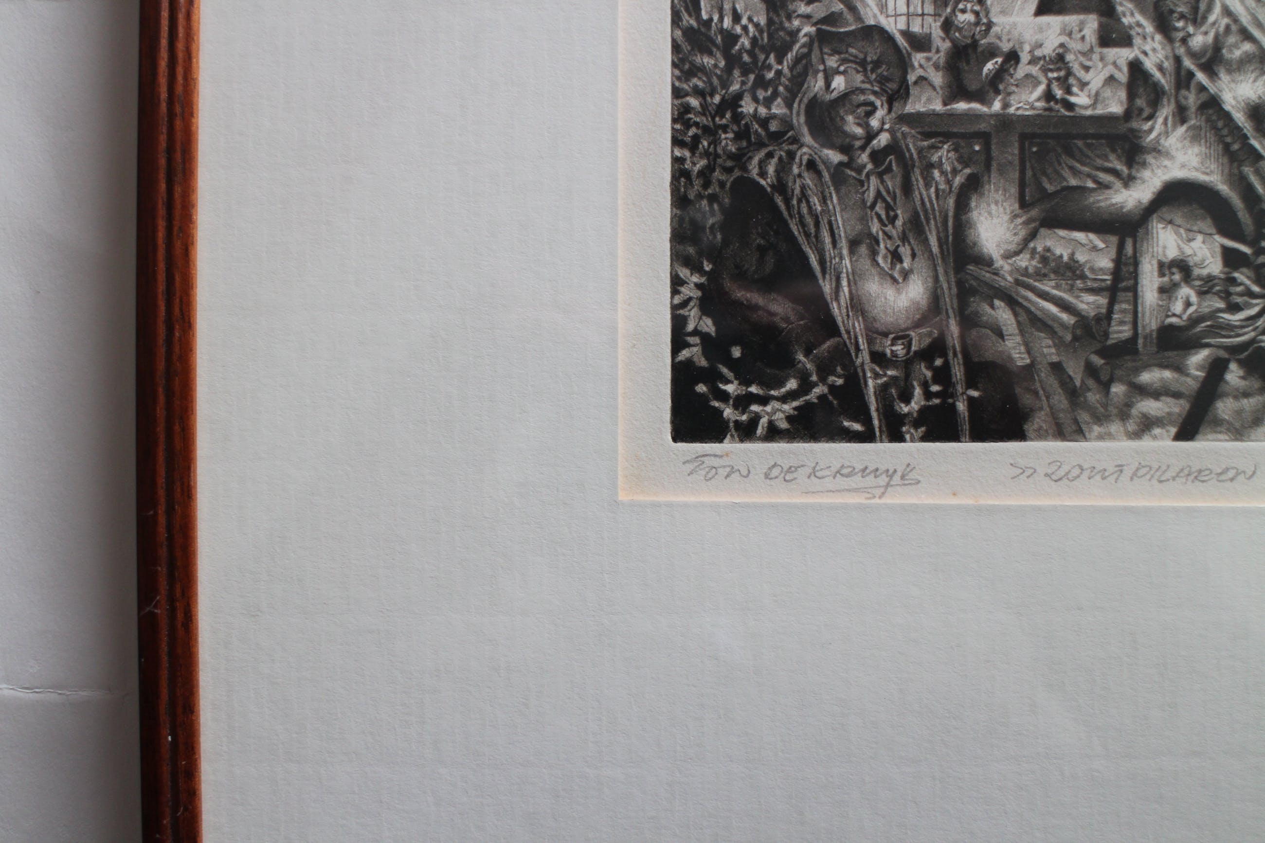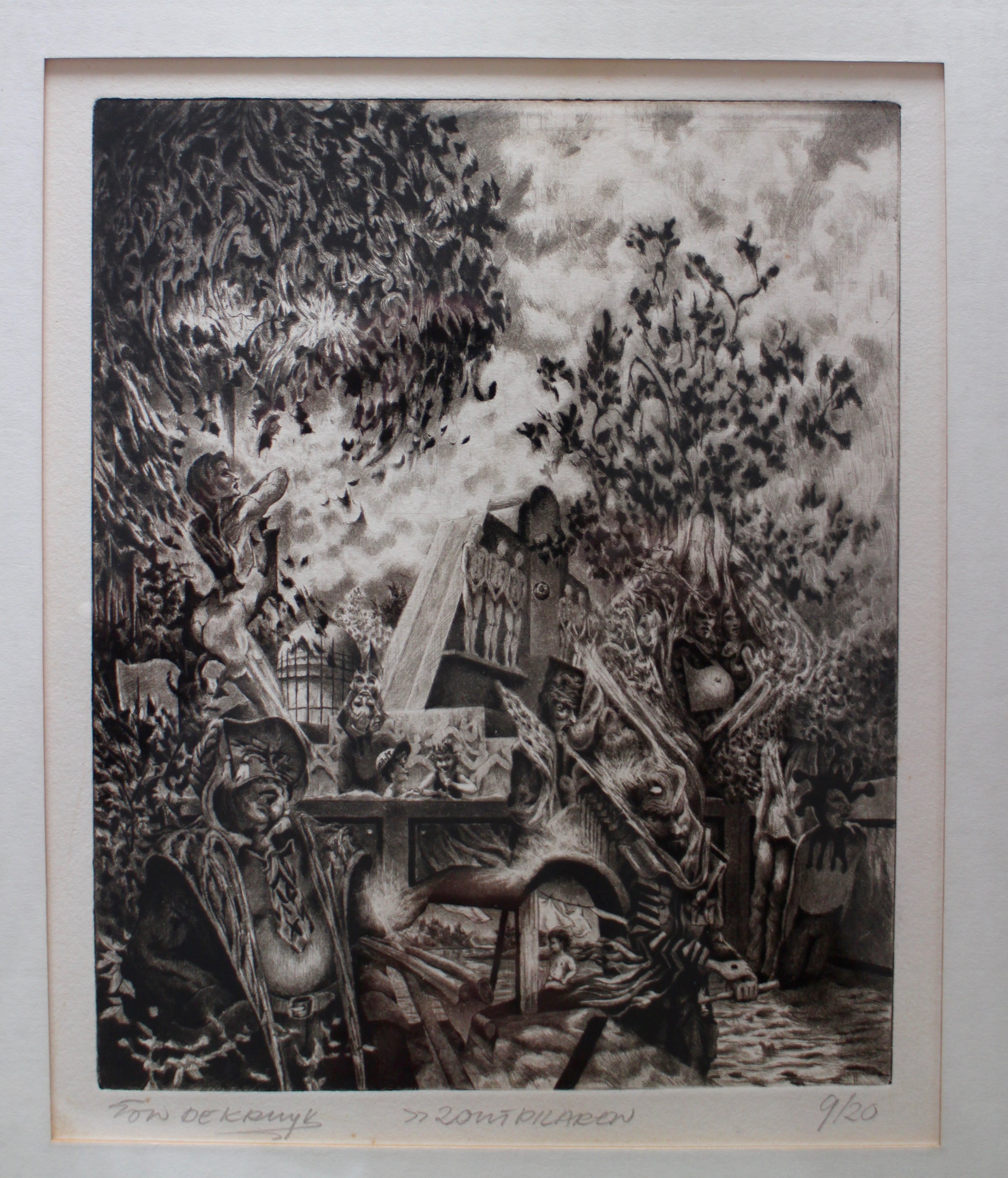 Ets gesigneerd, van titel voorzien en genummerd rechtsonder 9/20 Mooi ingelijst. Karakteristiek en gedetailleerd werk van deze surrealistische kunstenaar.