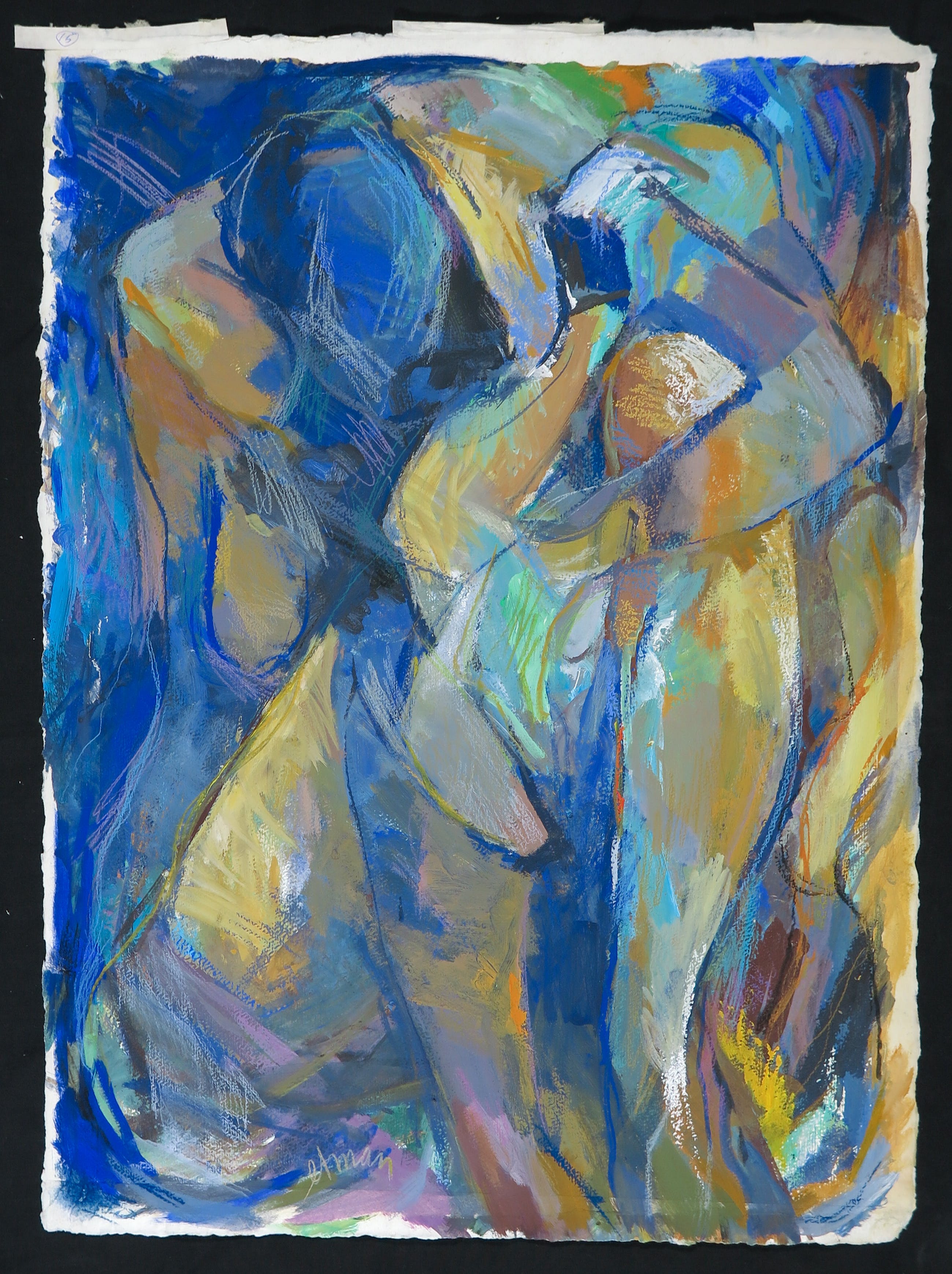 Gemengde techniek op papier, o.a. acryl en krijt.