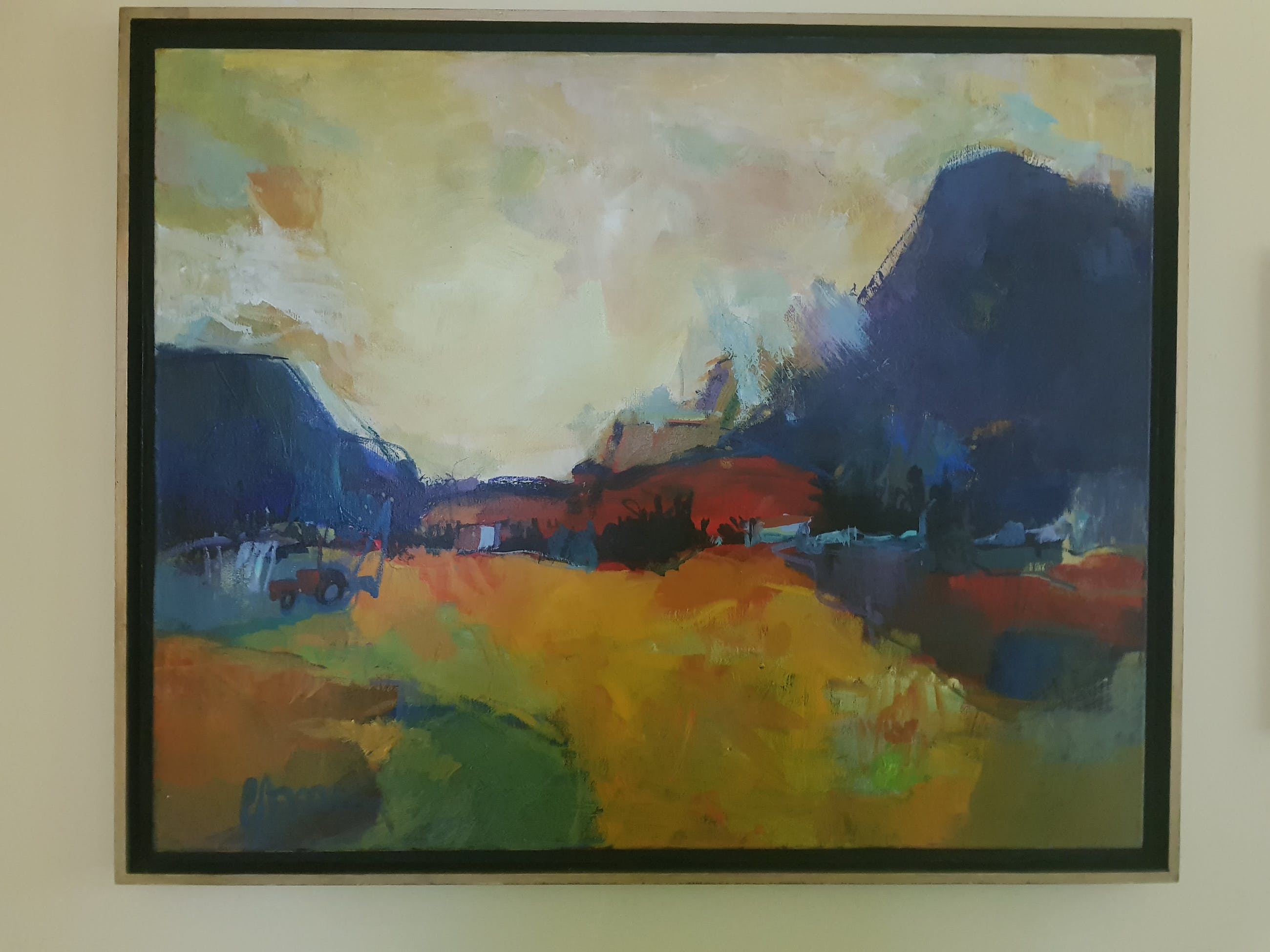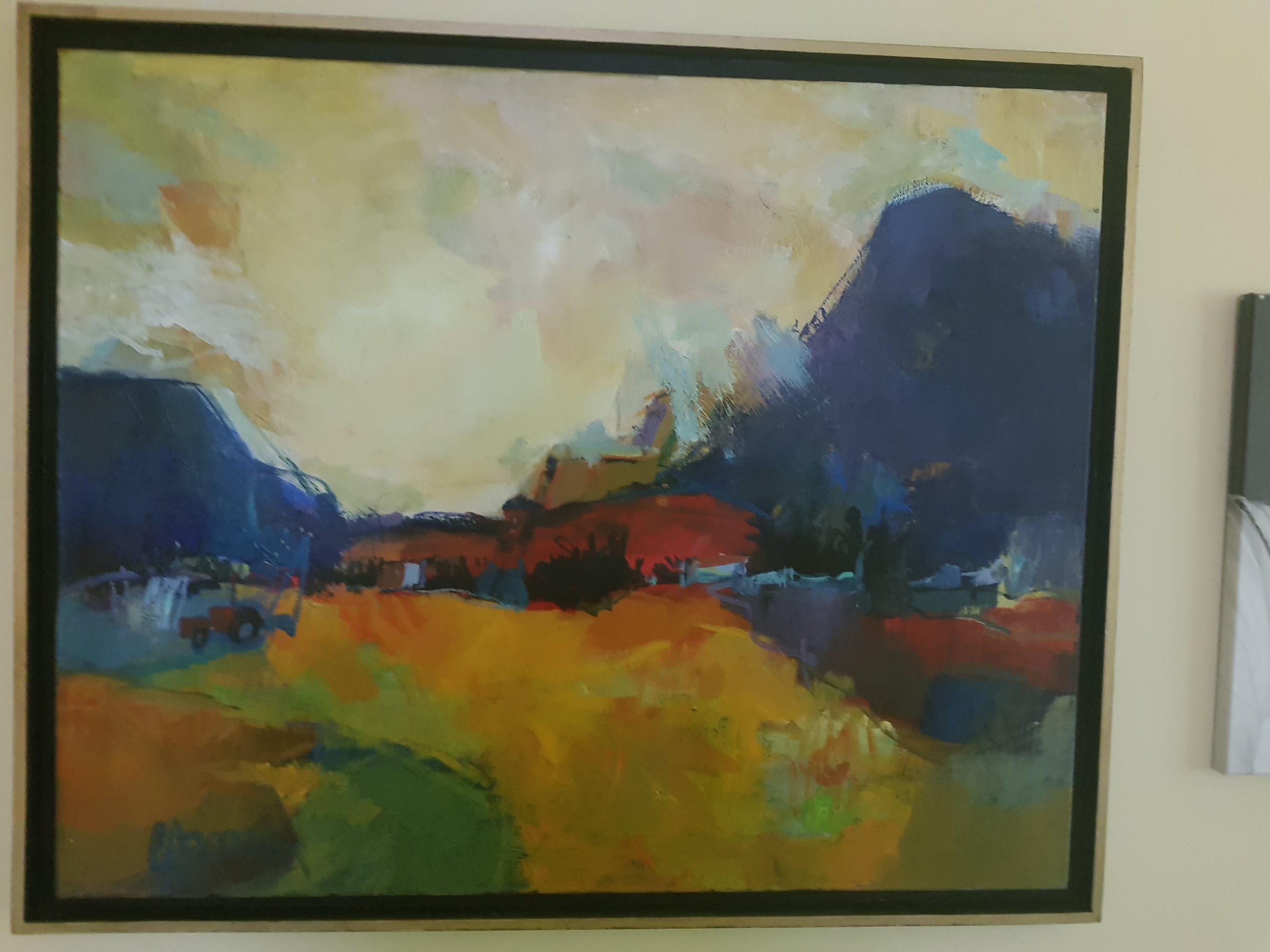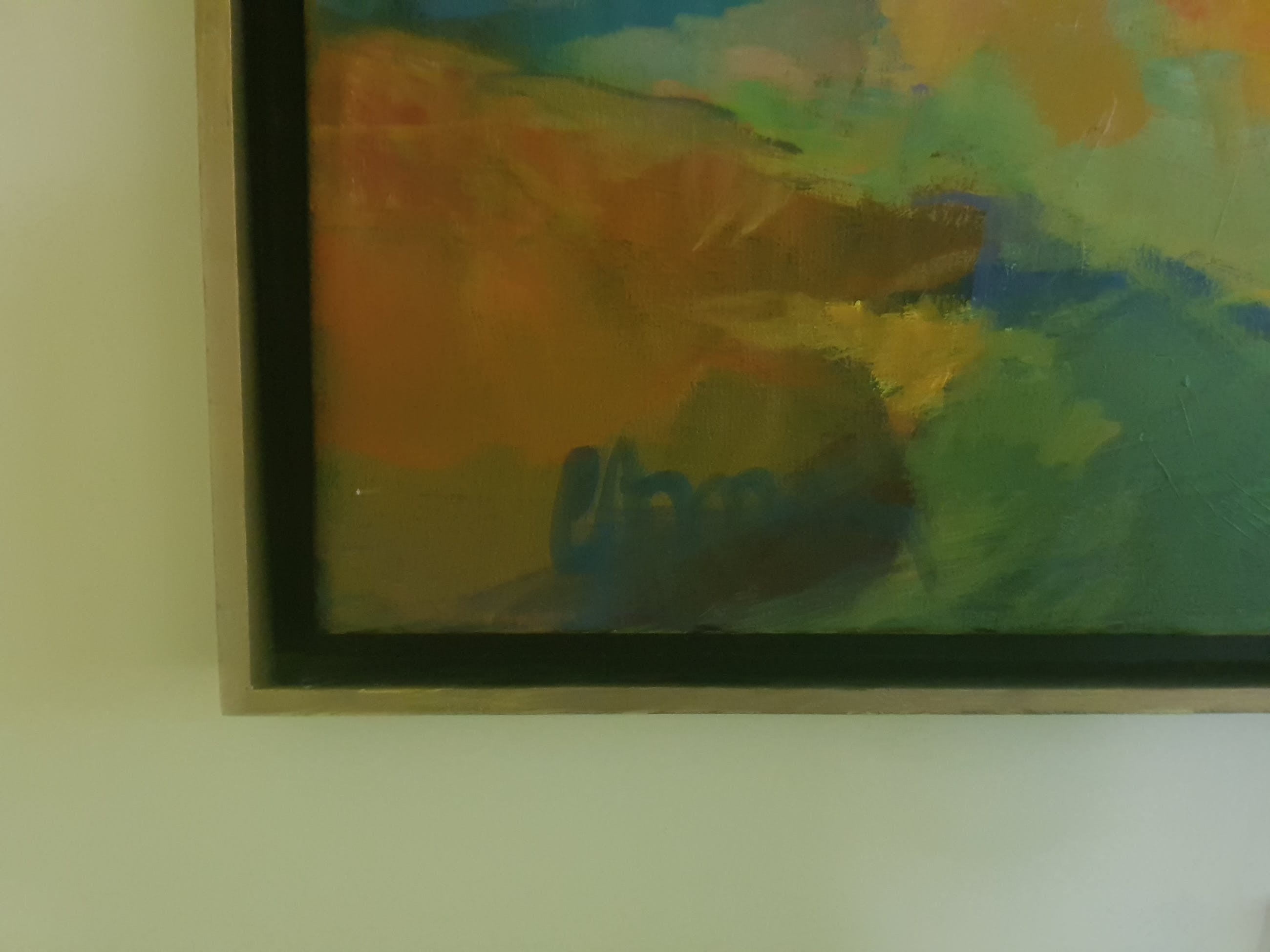 gesigneerd, 70 x 100 cm. Prachtig kleurenspel in gouden moderne lijst, zijkanten mee geschilderd.