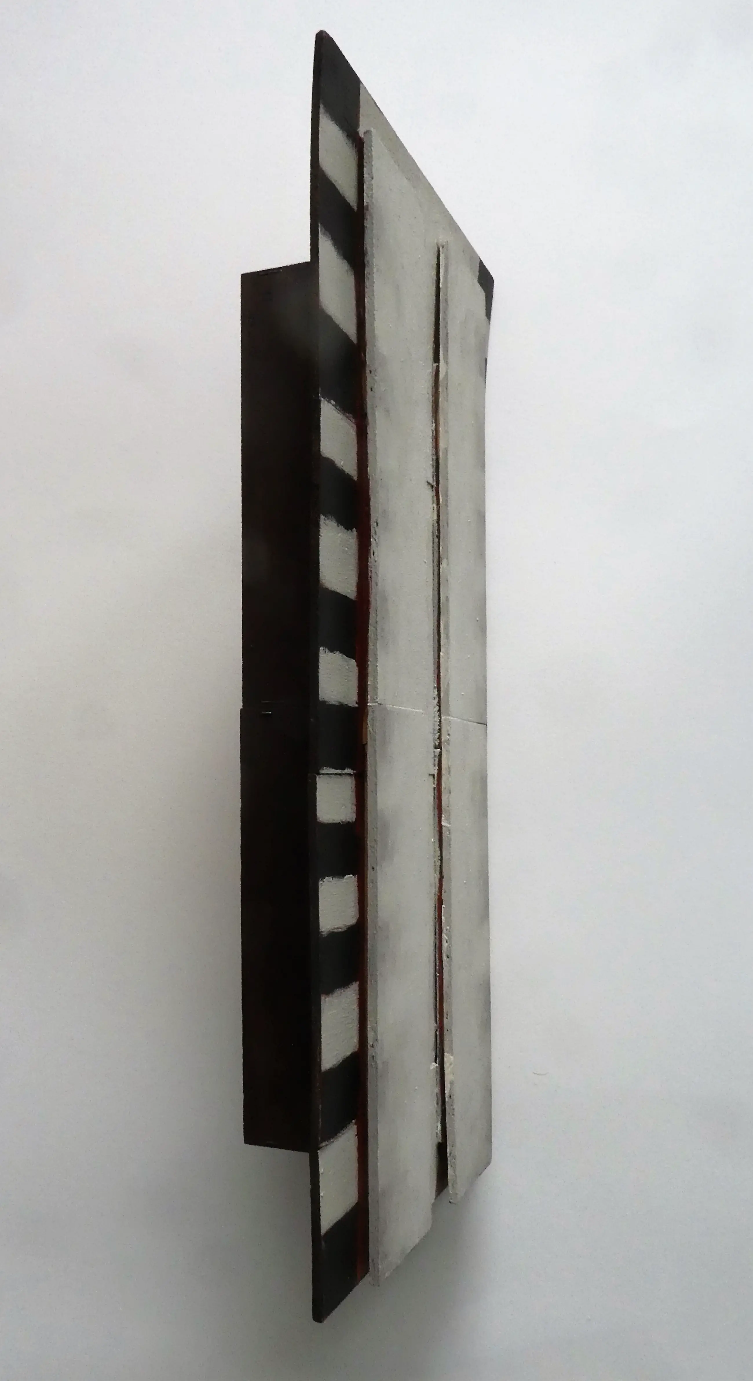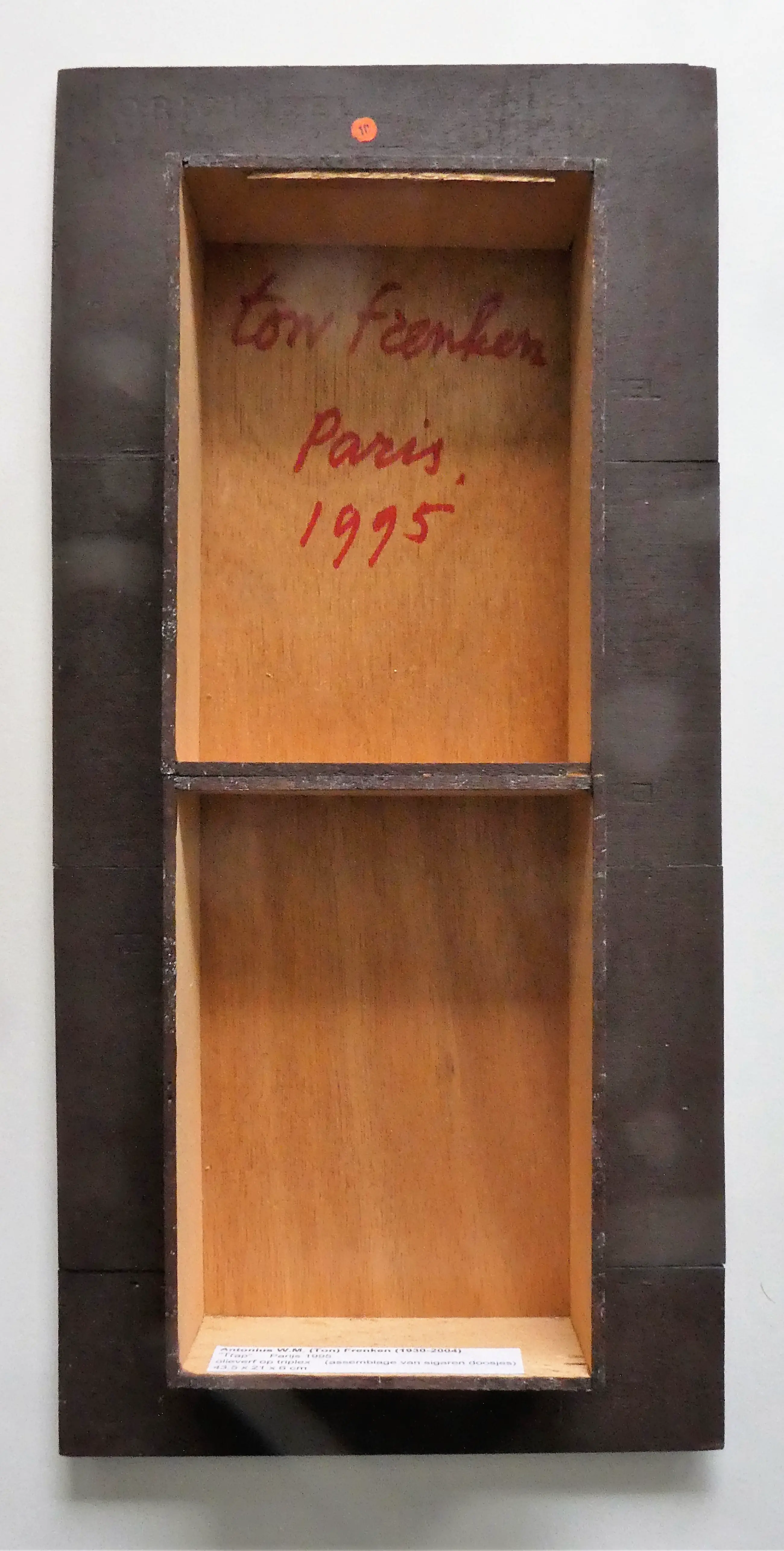 Olieverf op triplex.Assemblage van sigaren doosjes.Het zij-aanzicht laat zien dat het werk minimaal aan de bovenzijde is kromgetrokken. Dit is nauwelijks zichtbaar.
