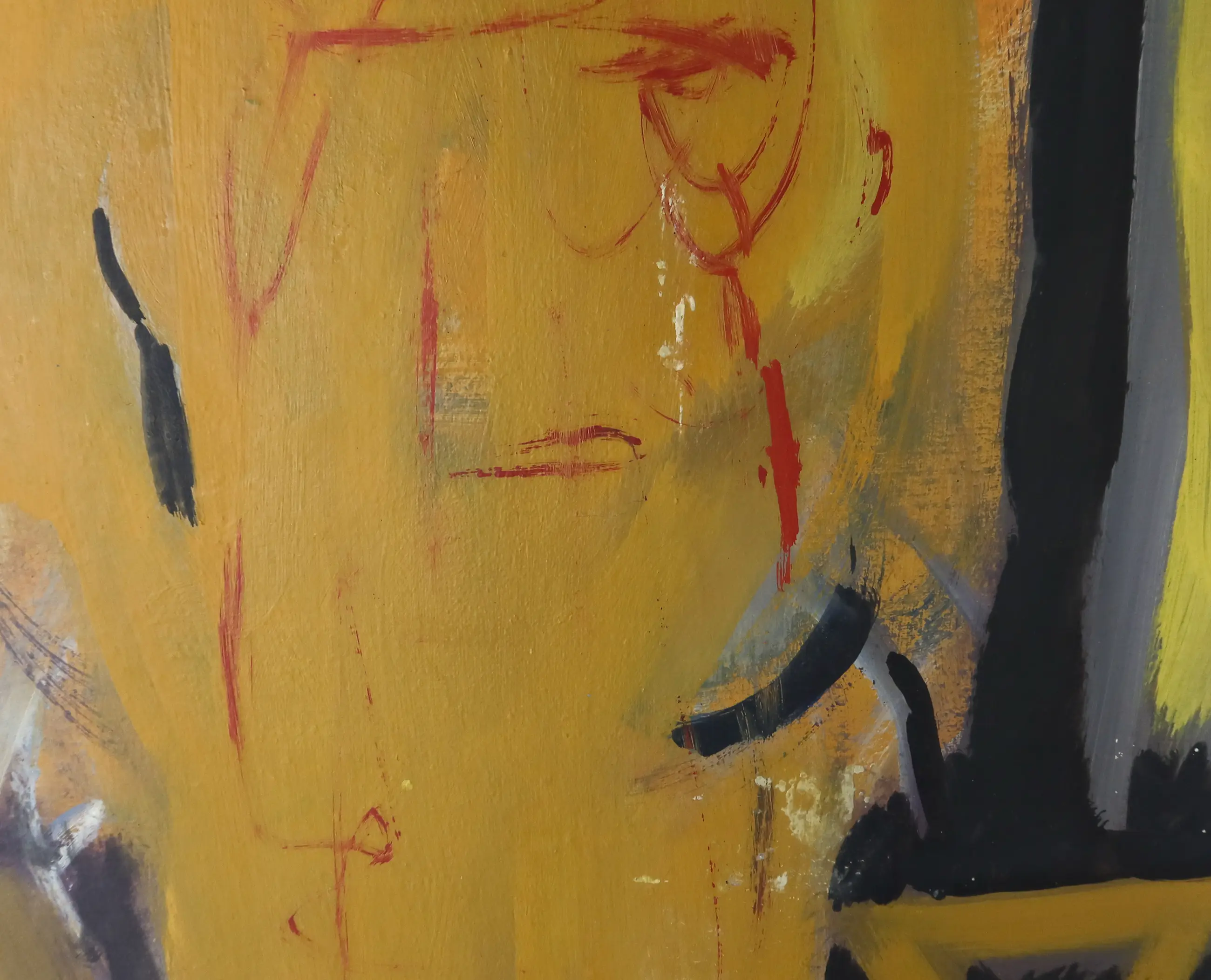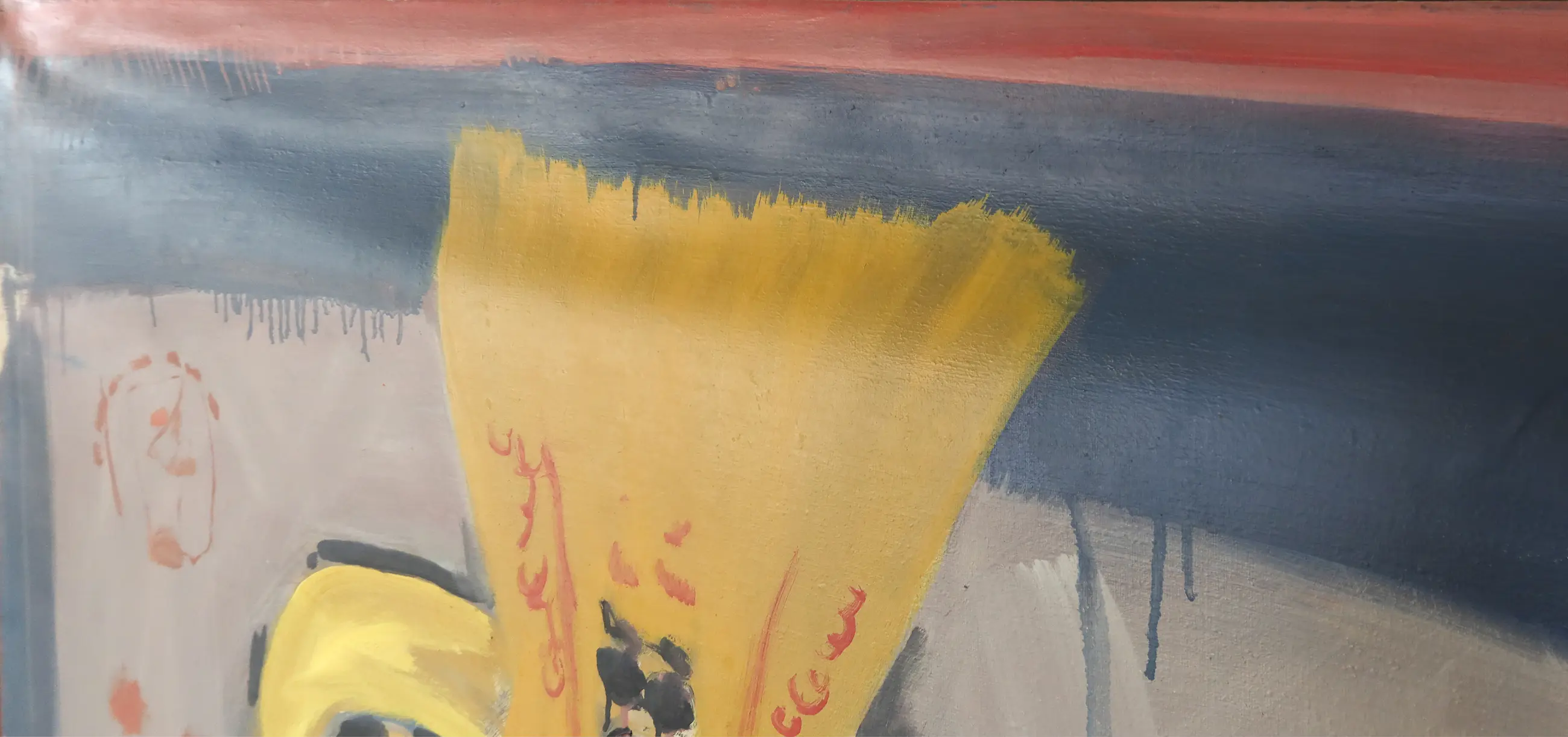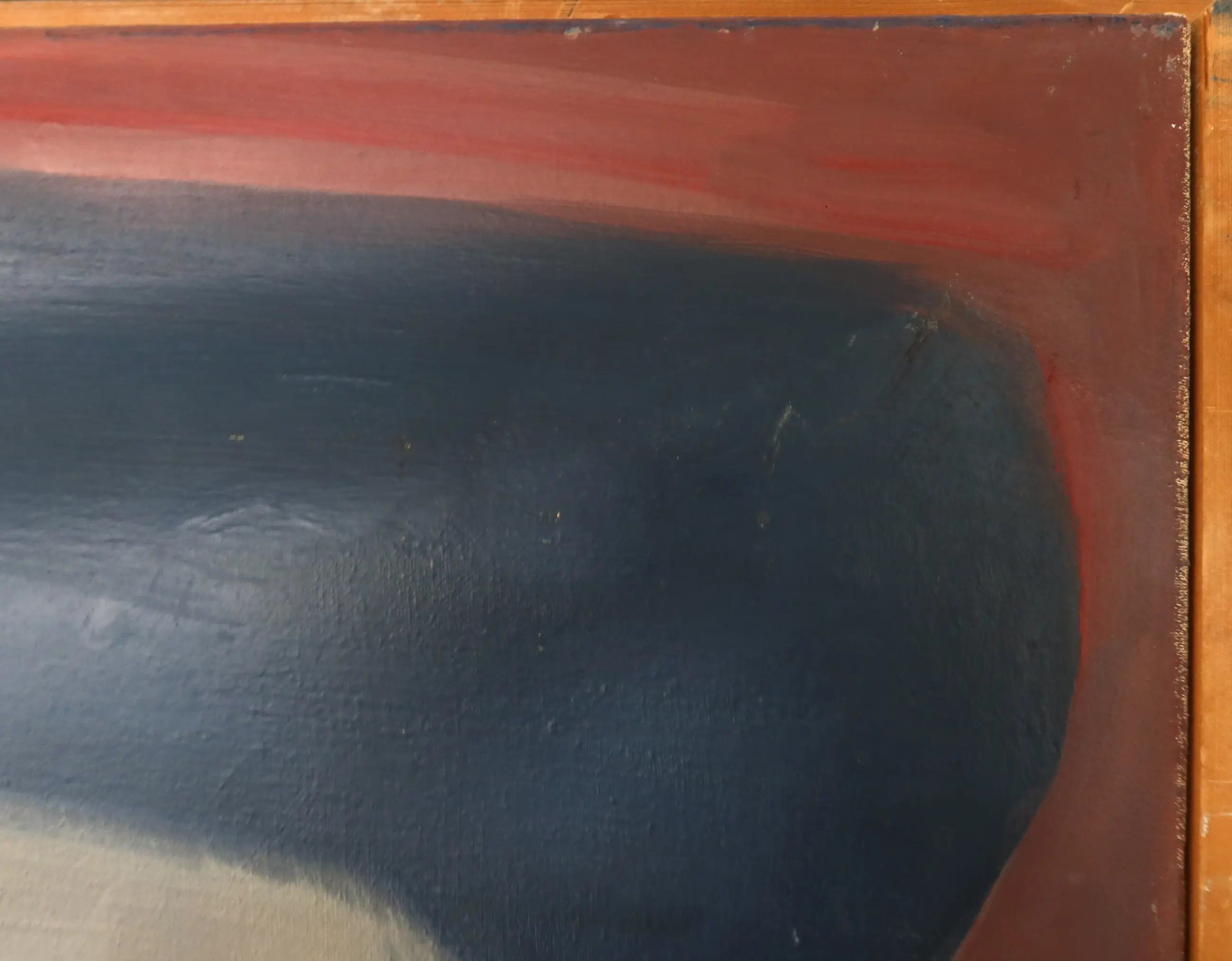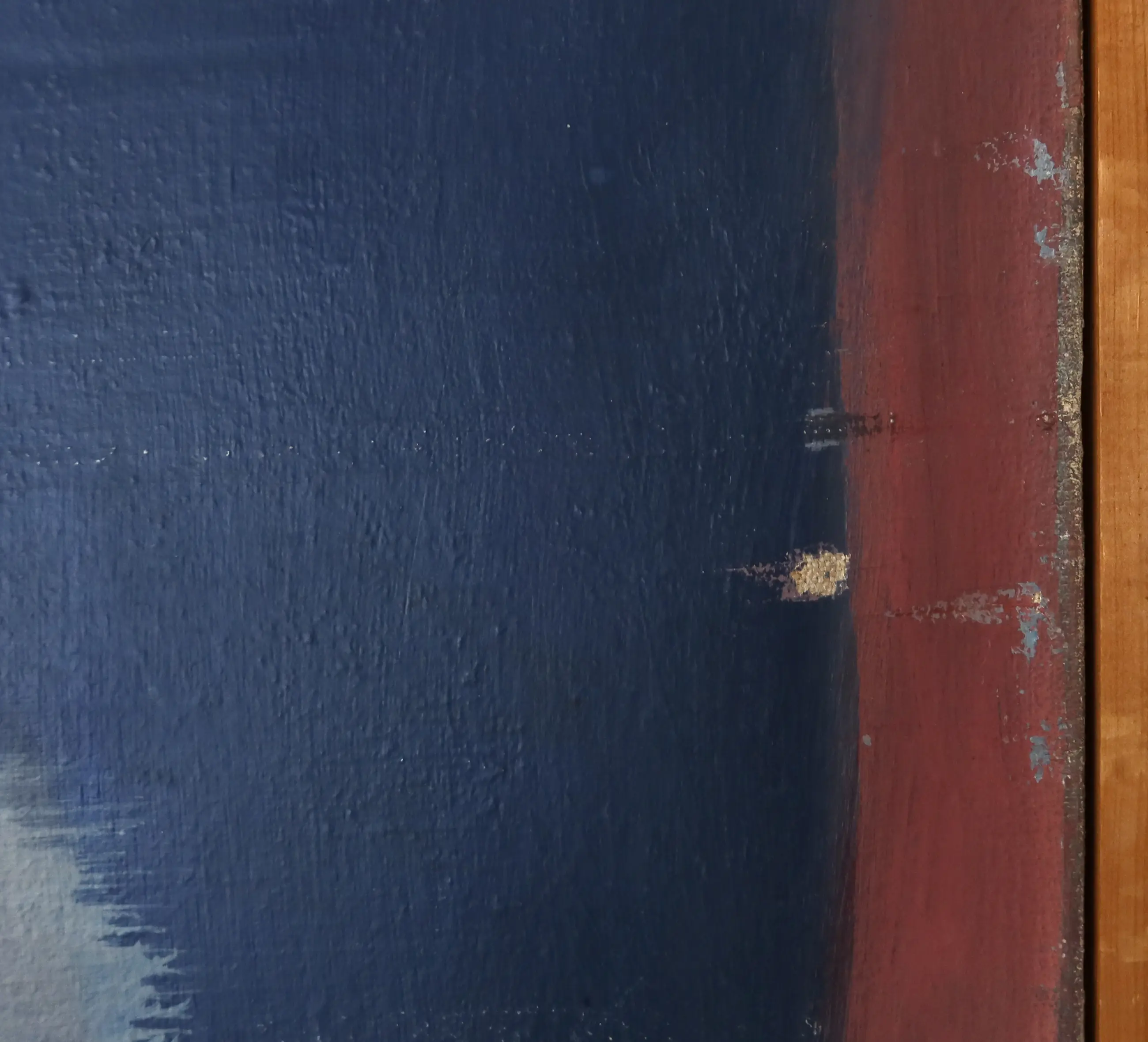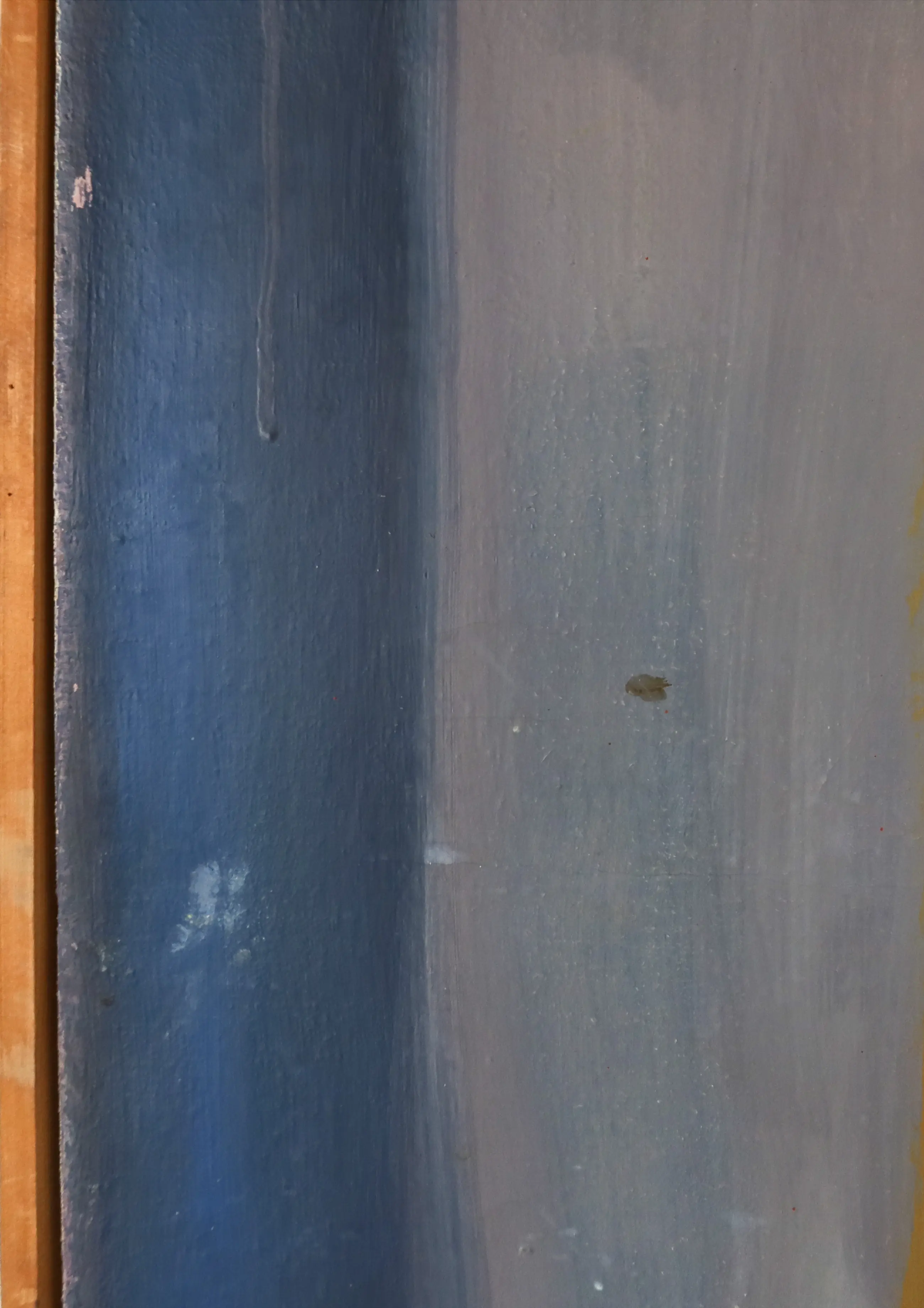 | Het doek is niet goed opgespannen waardoor het bovenaan is gaan golven. Ook zijn er wat plekjes verfschade en vuil. De lijst is aan vervanging toe; bovenaan mist een lat, en de aanwezigen zitten wat wankel. | |