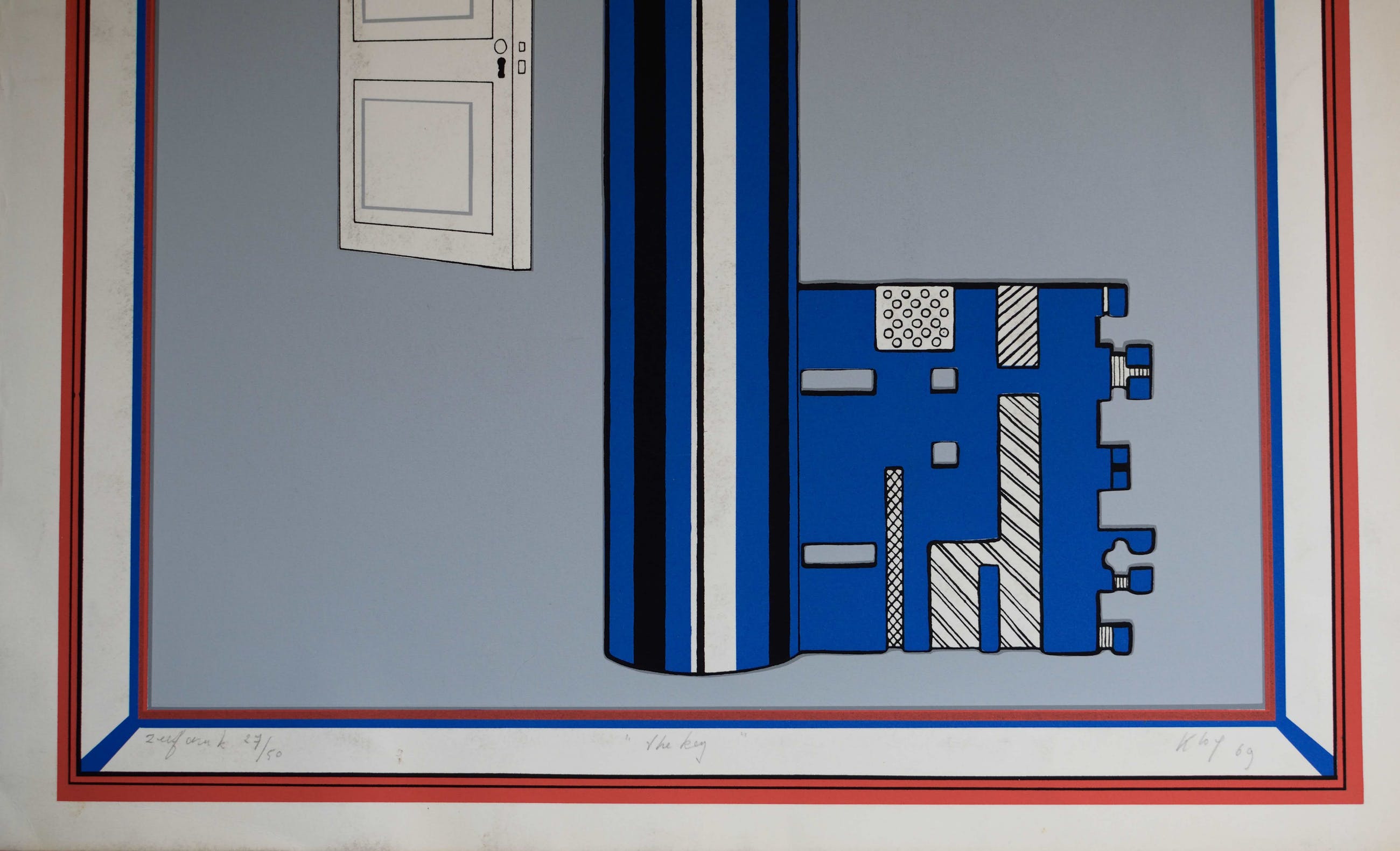 Ton Klop maakt grappig werk en je moet er zeker de humor van in zien. Deze zeefdruk heeft als titel : "de sleutel".
