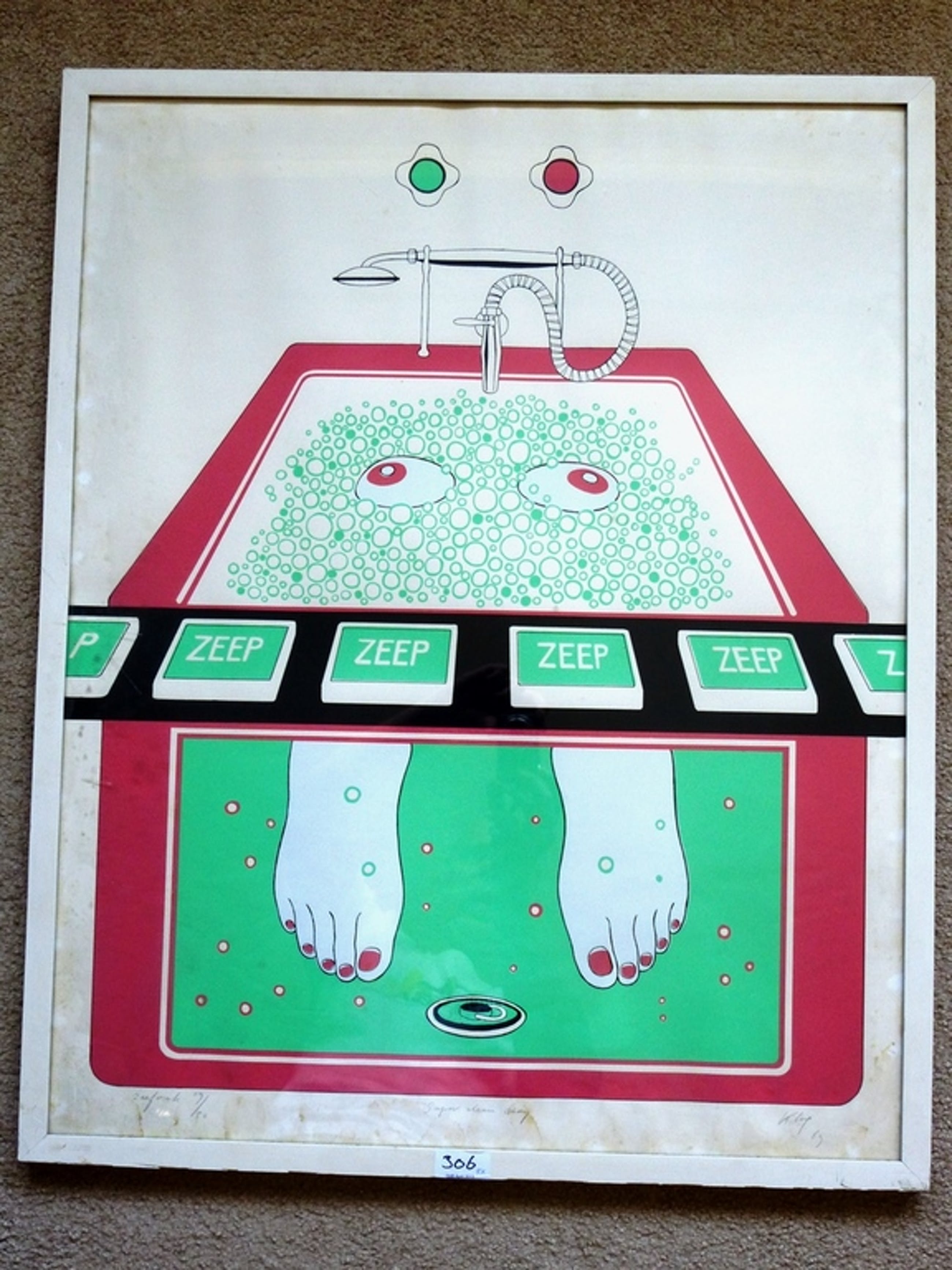 In redelijke staat. De zeefdruk moet worden schoongemaakt. Er zitten bruine vlekken (waterschade) op de witte randen.