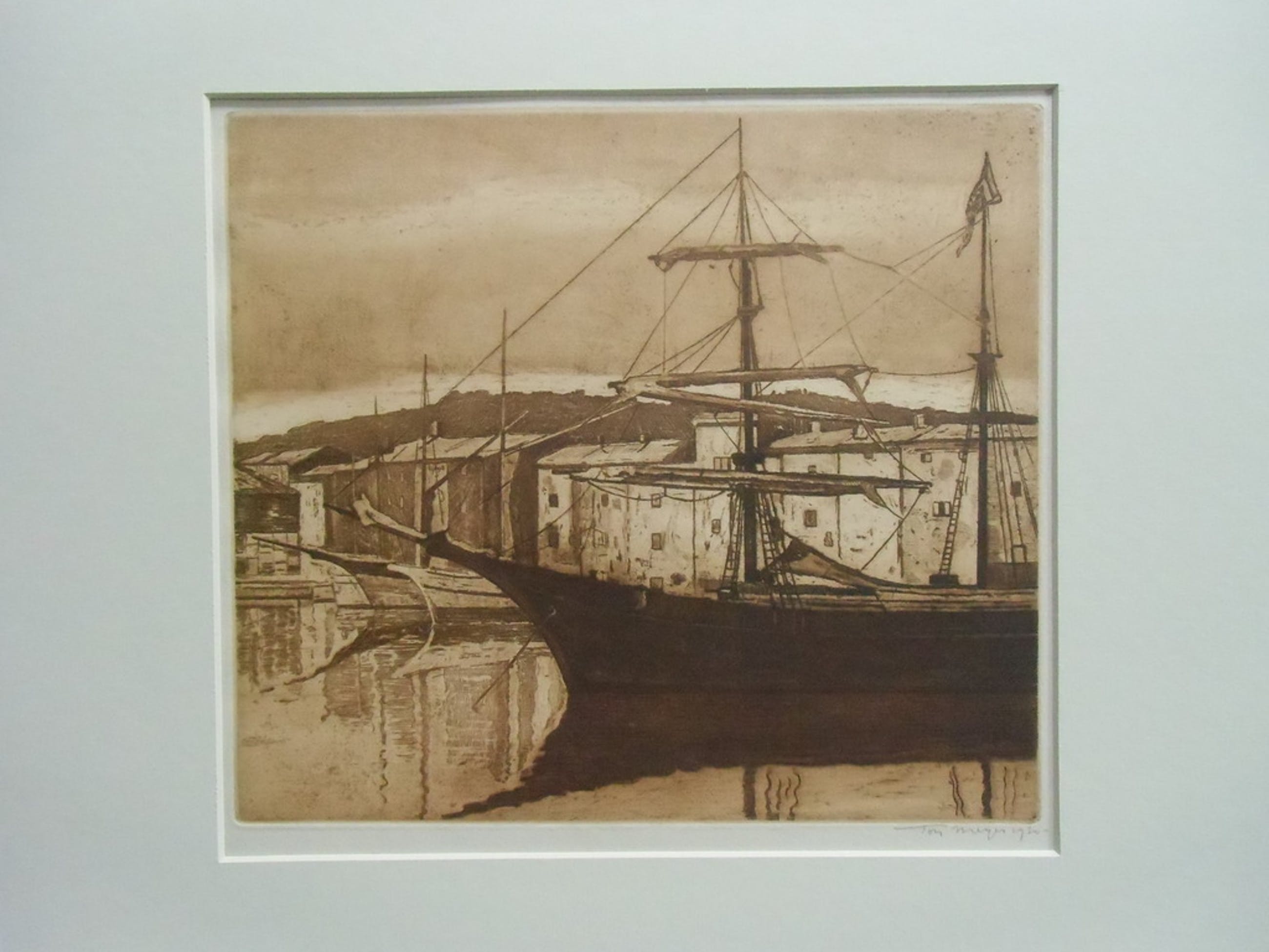 Ingelijst: de ets is opgenomen in passepartout met achtervel. Geen lijst