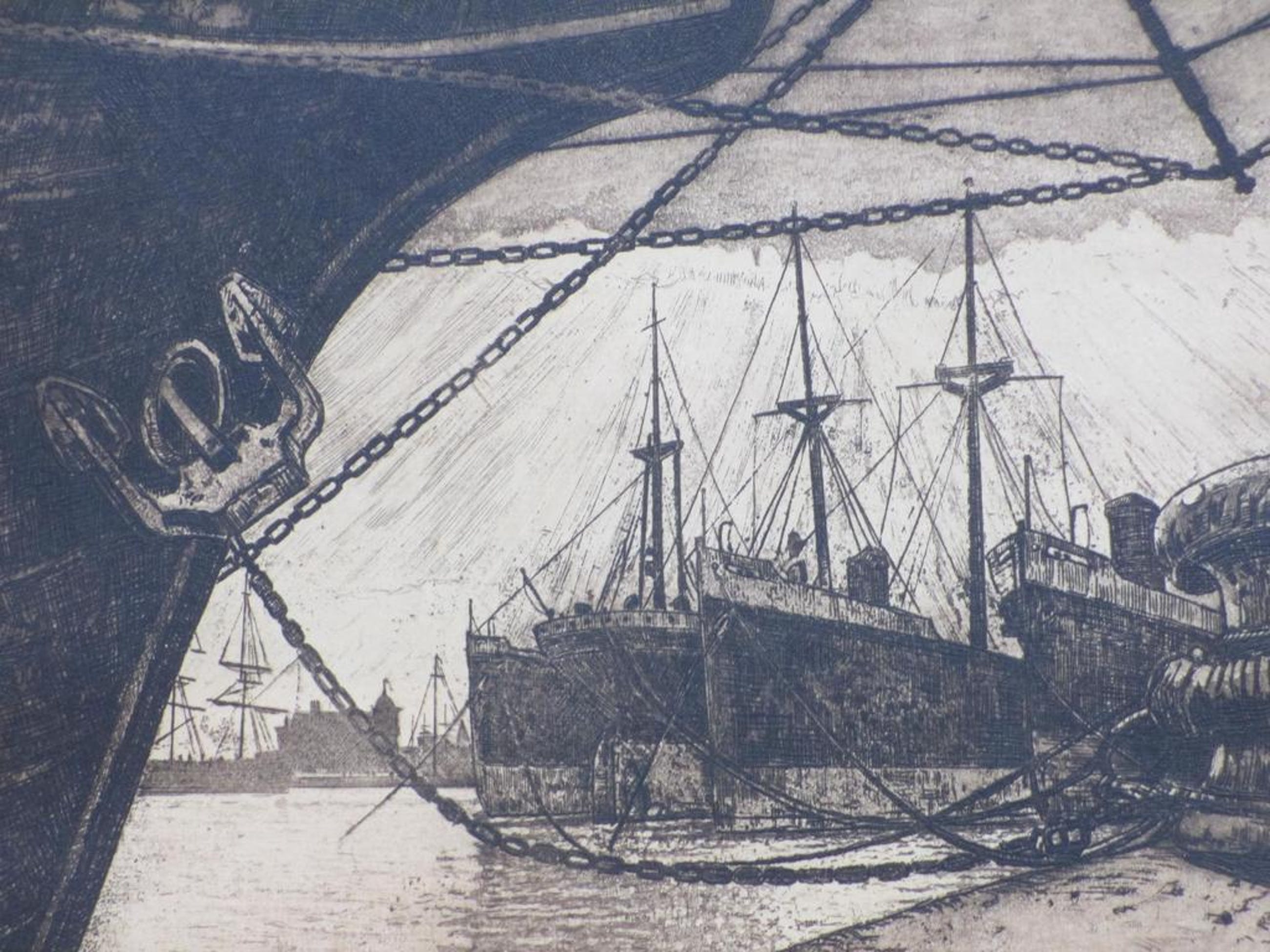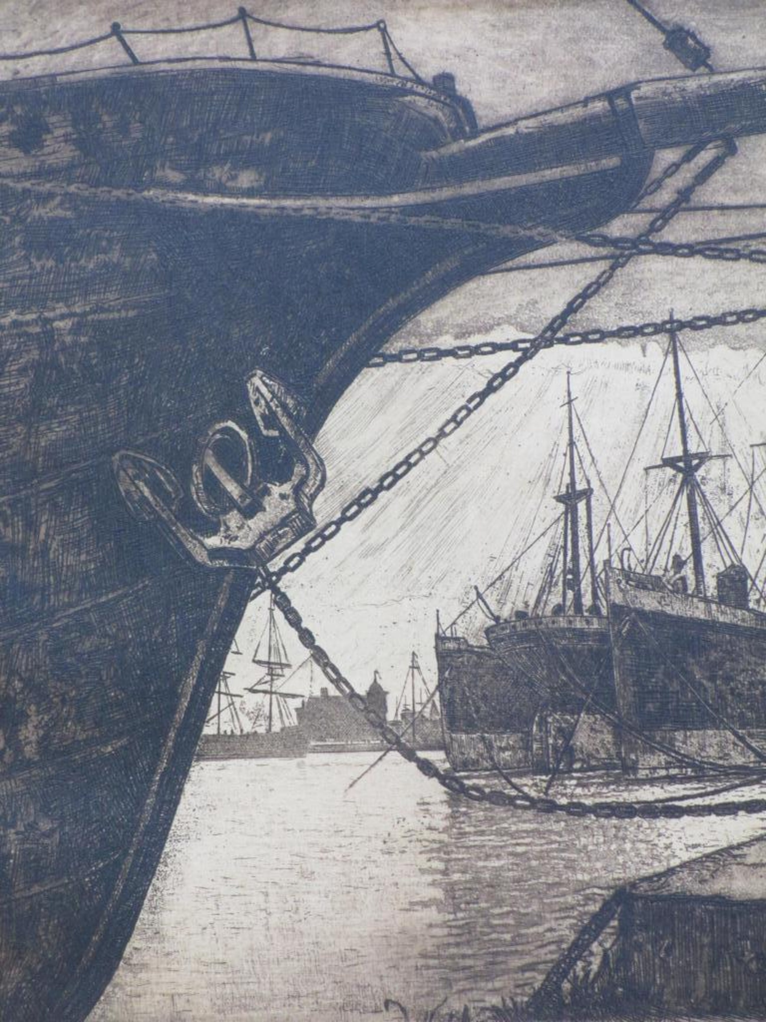 Voorstelling van een aantal afgemeerde schepen in de Rotterdamse haven.
