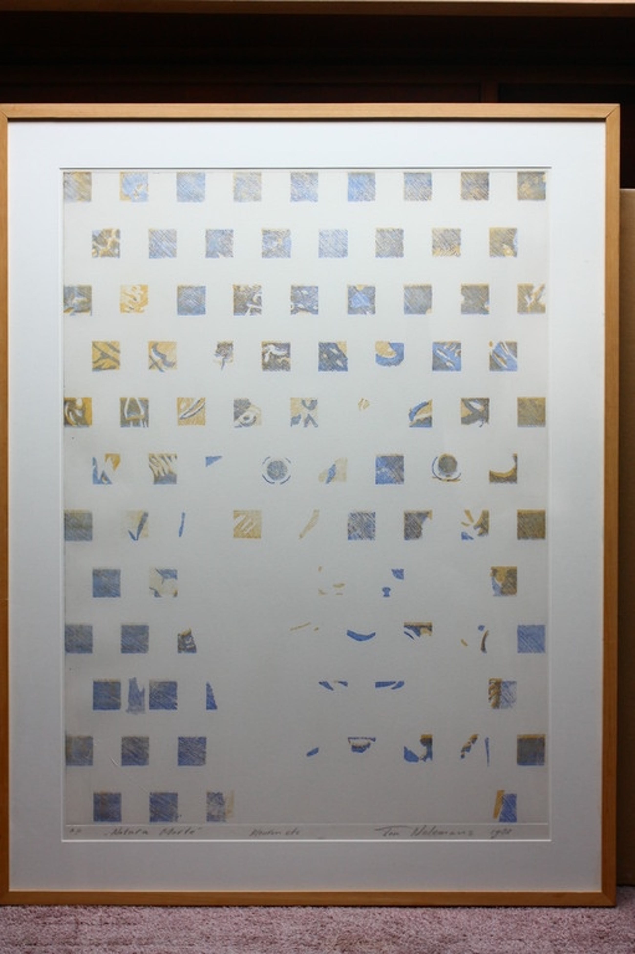 Kleurenets achter glas in houten lijst.