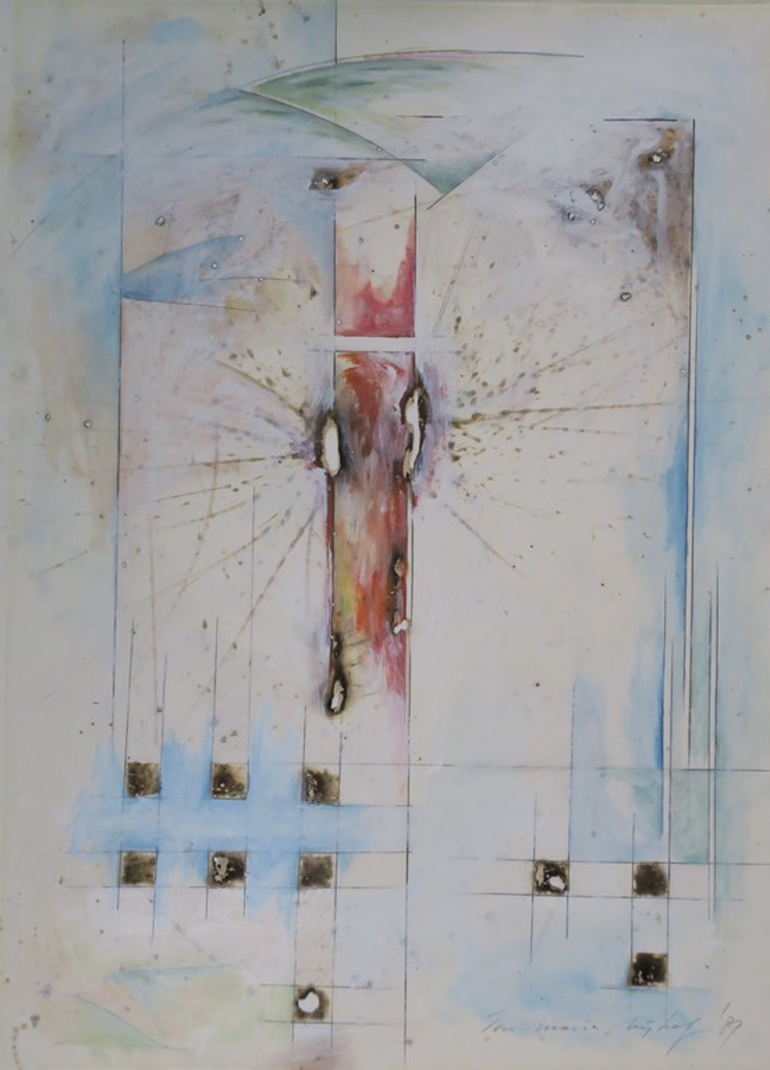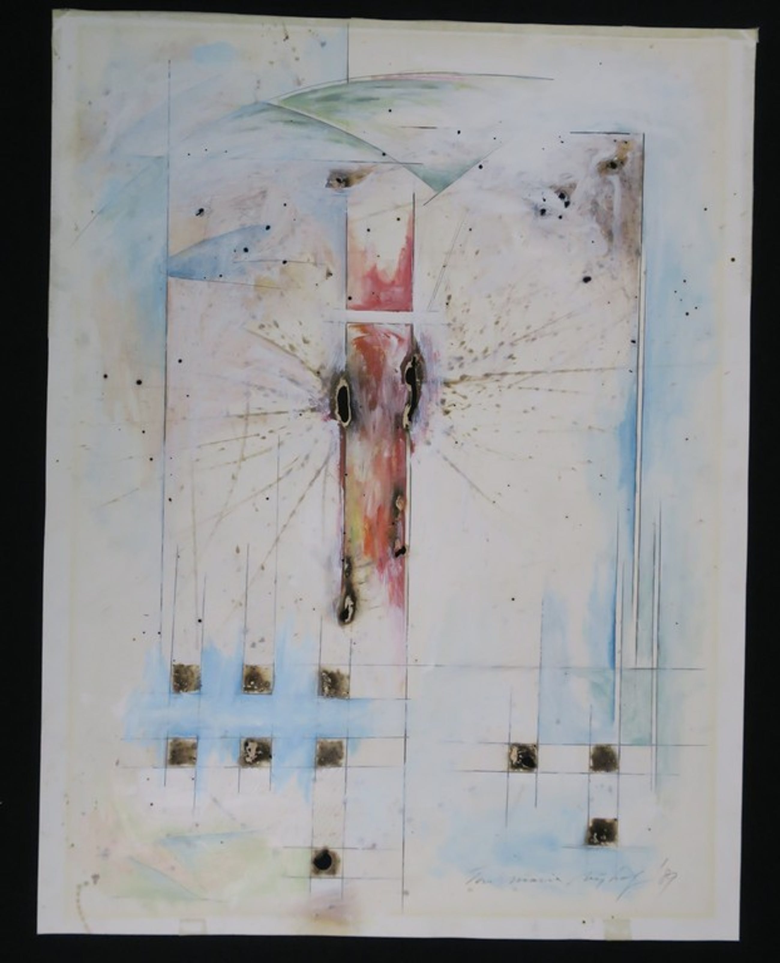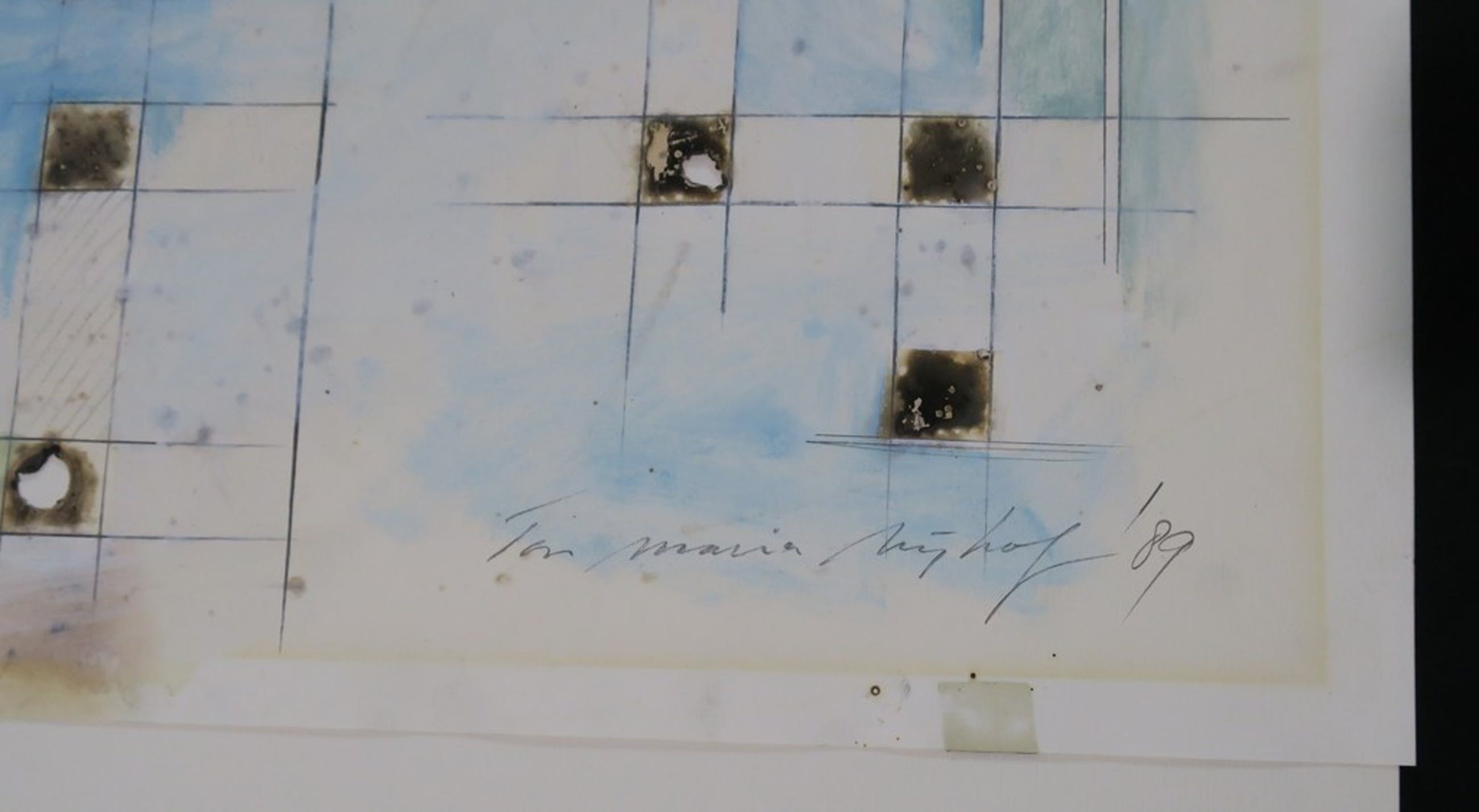Materiaal: Gemengde techniek, Gouache en potlood op door de kunstenaar met gaatjes bewerkt papier
