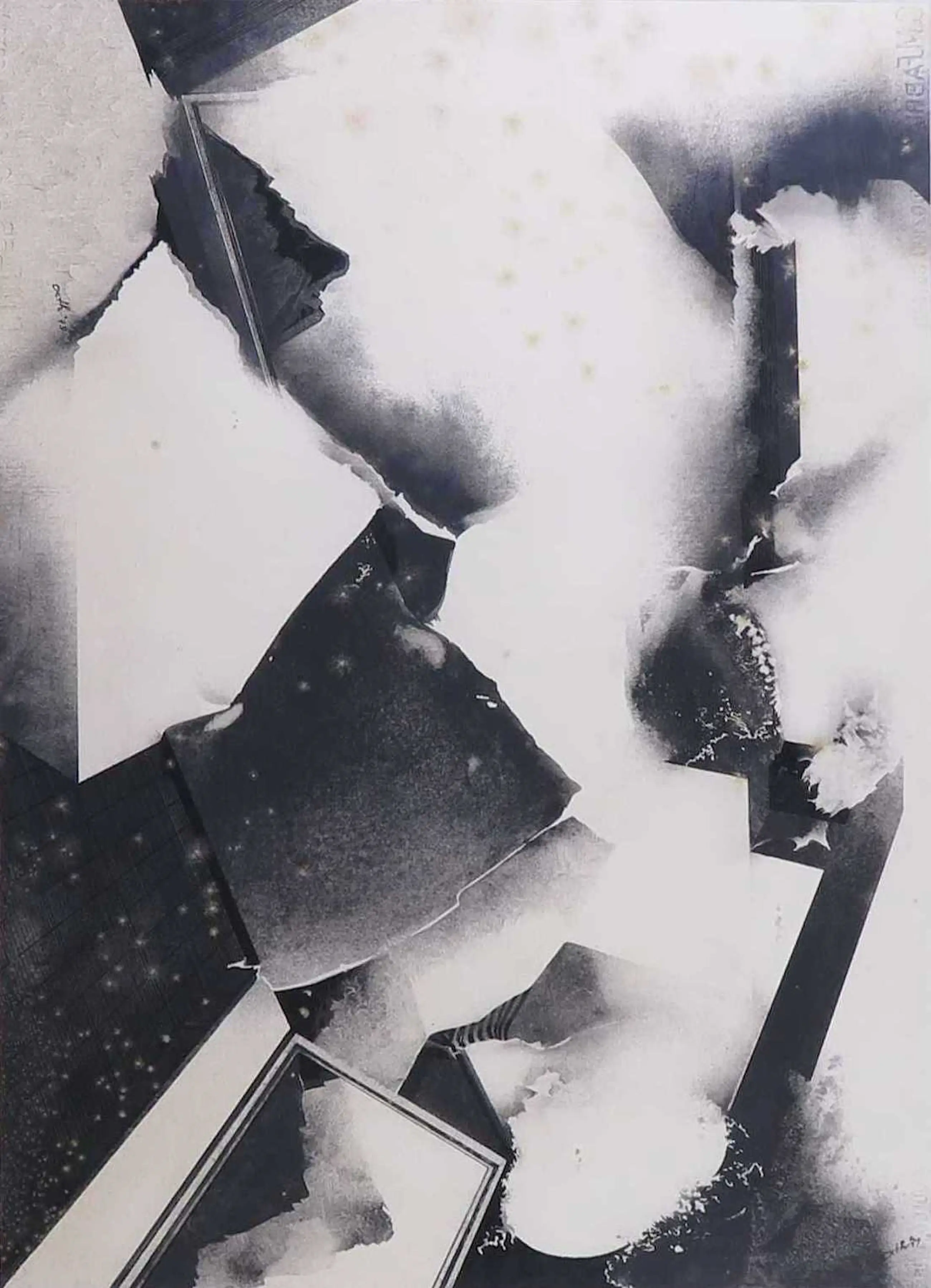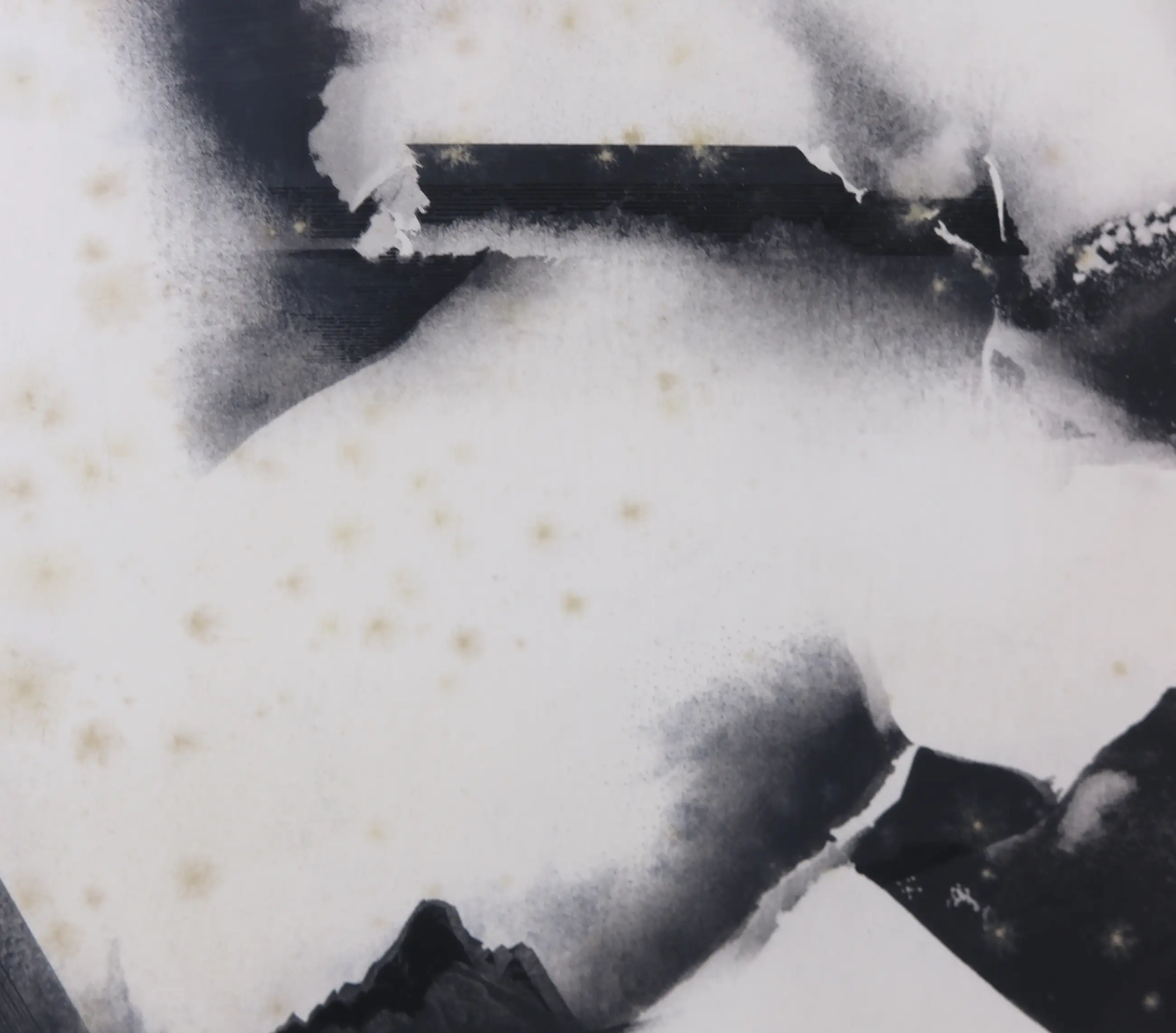 | Verspreid over het papier oxidatievlekjes (in het wit en zwart) | |