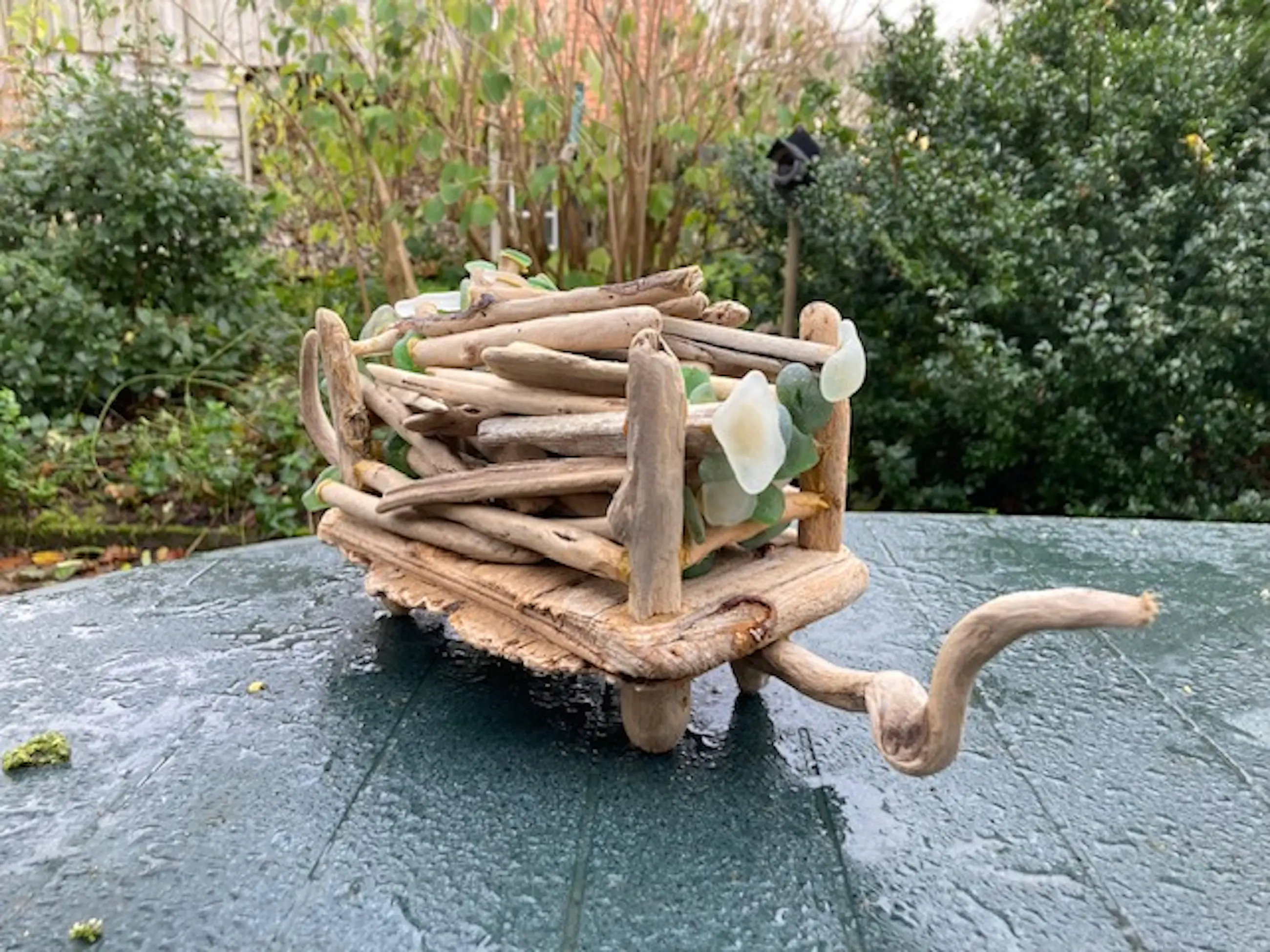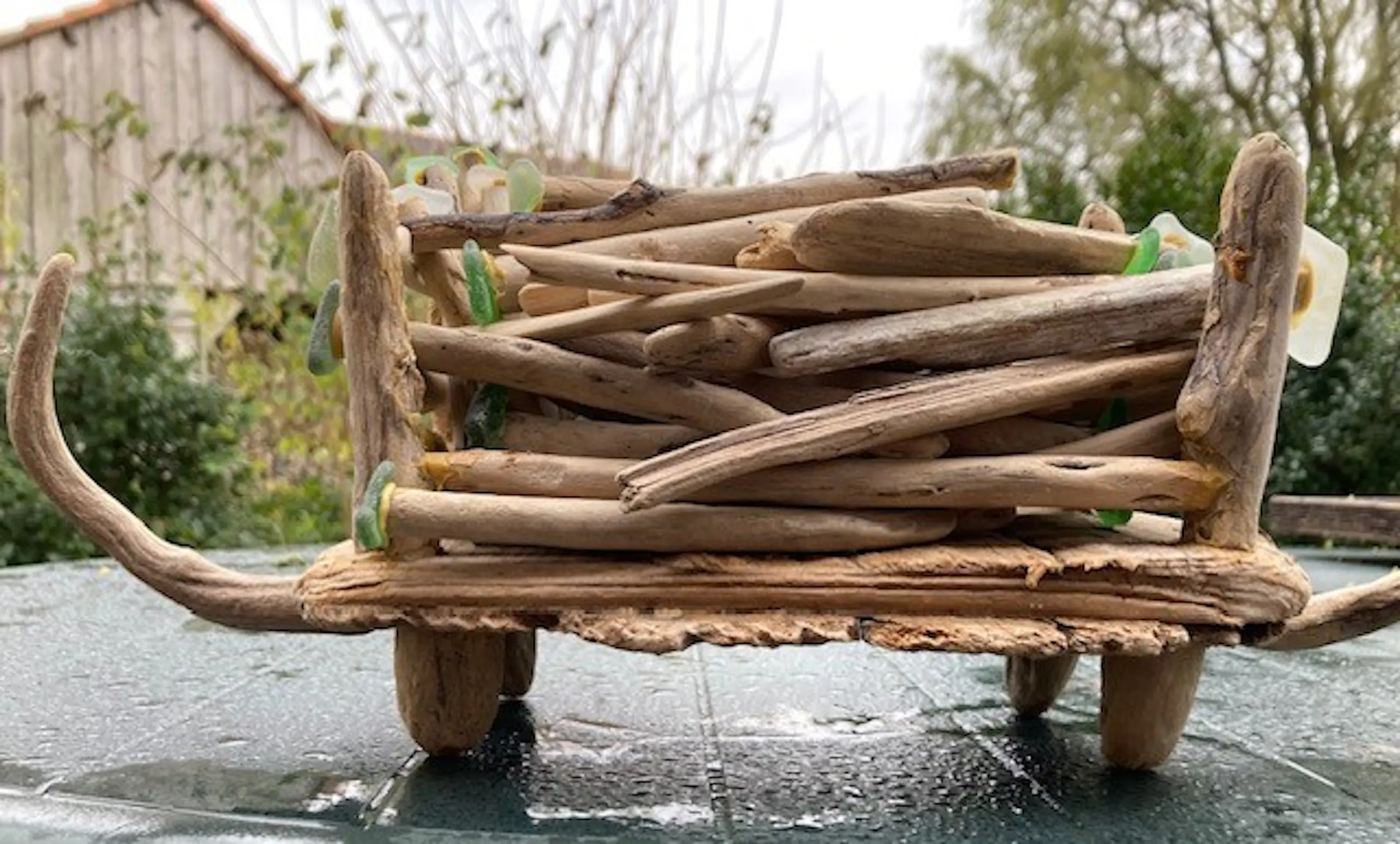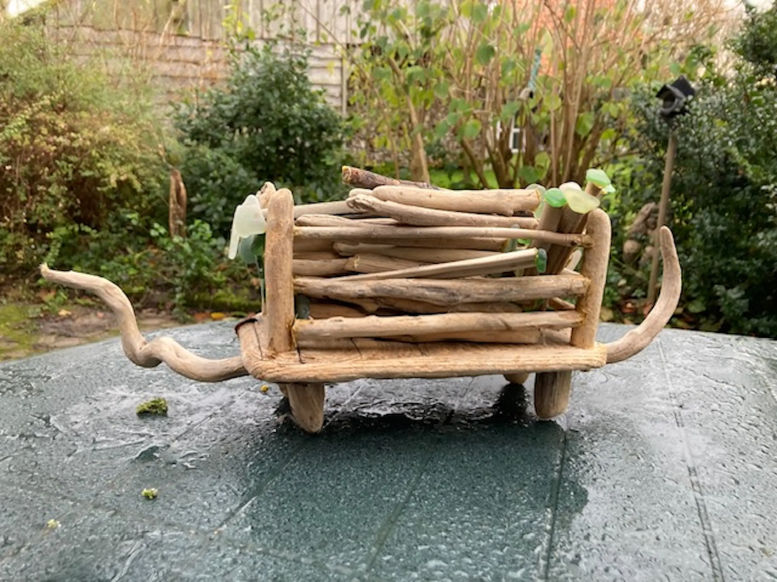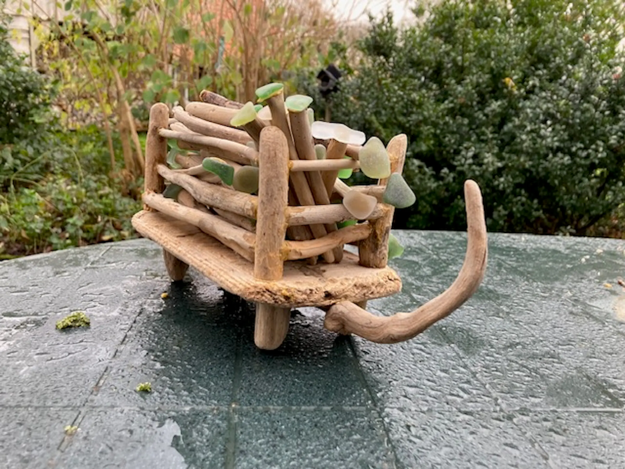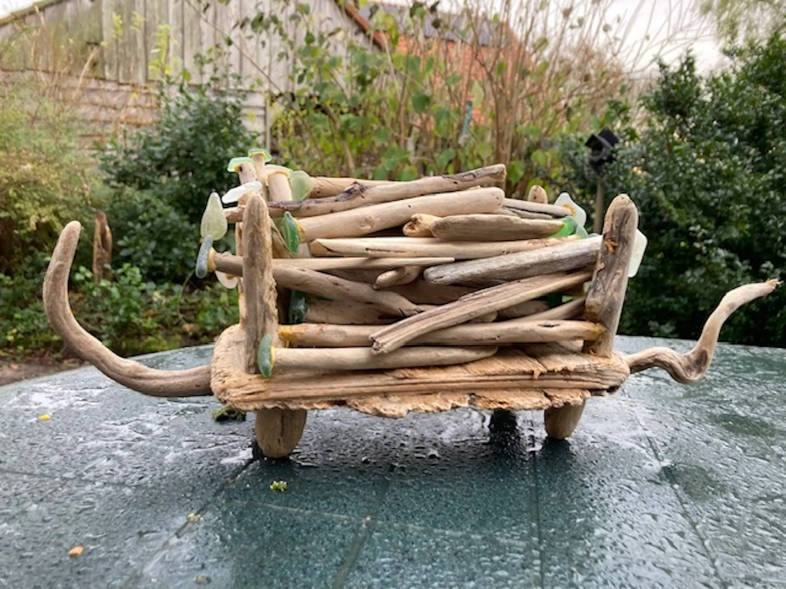 Het gaat om een object van hout met glas. Het materiaal is verzameld aan de kust en gepolijst door wind, zee, zand en zon. Daarna door de kunstenaar verder bewerkt.