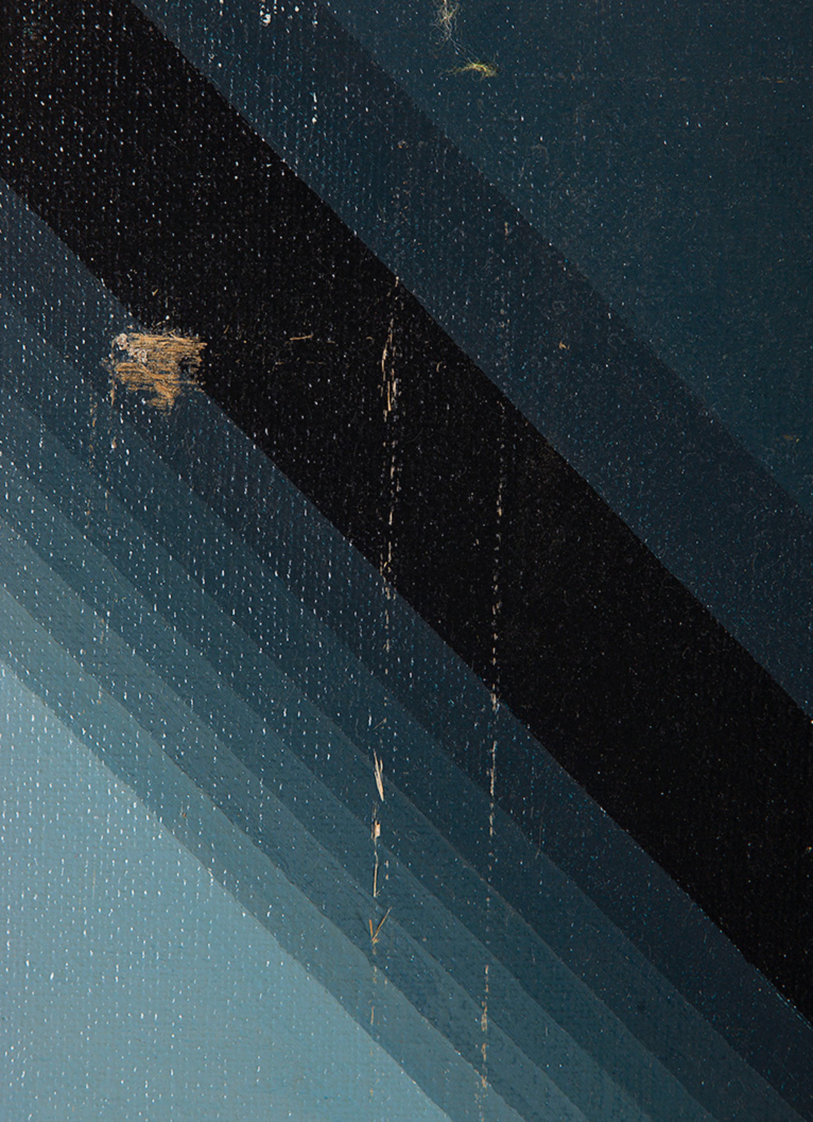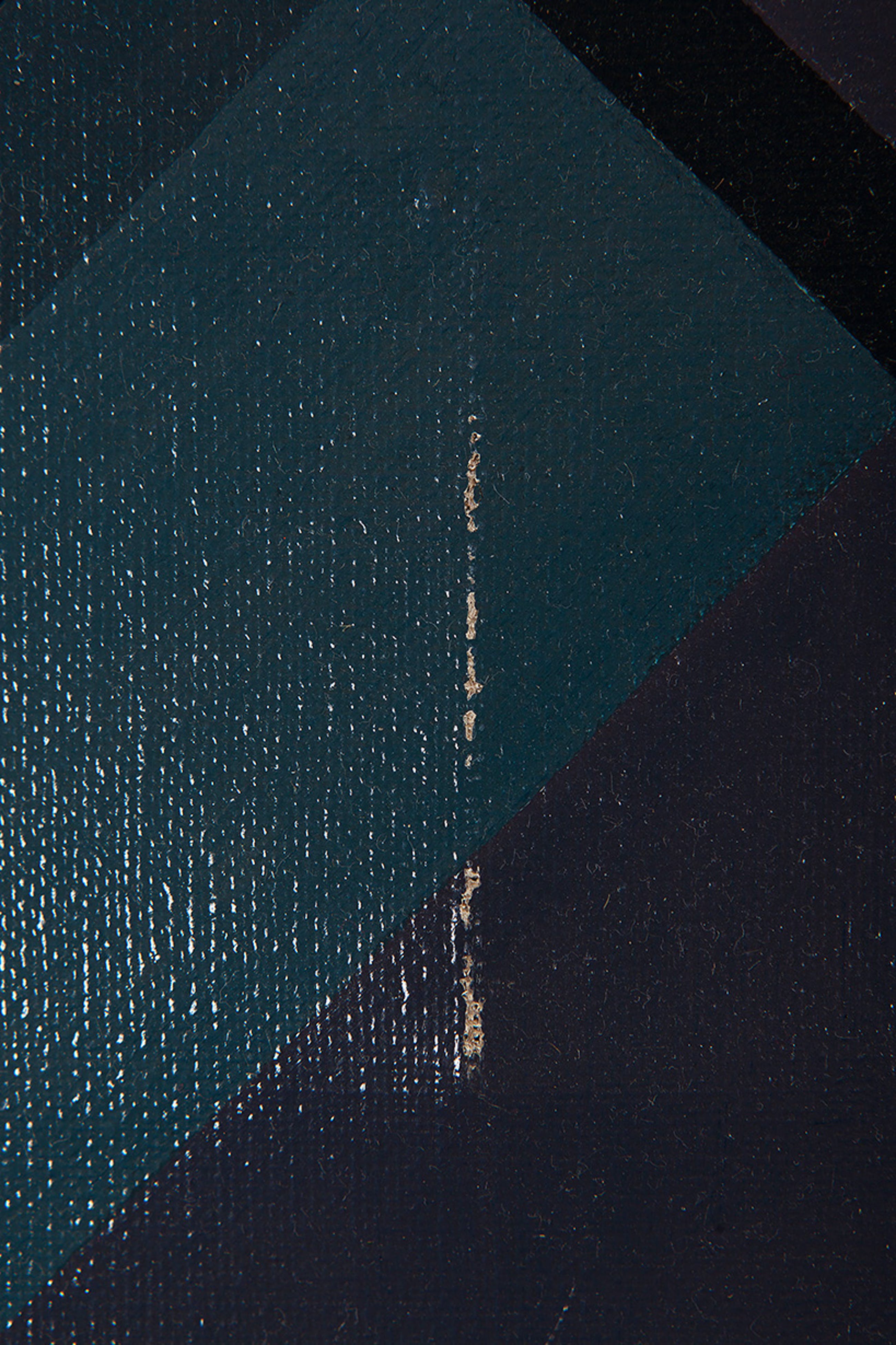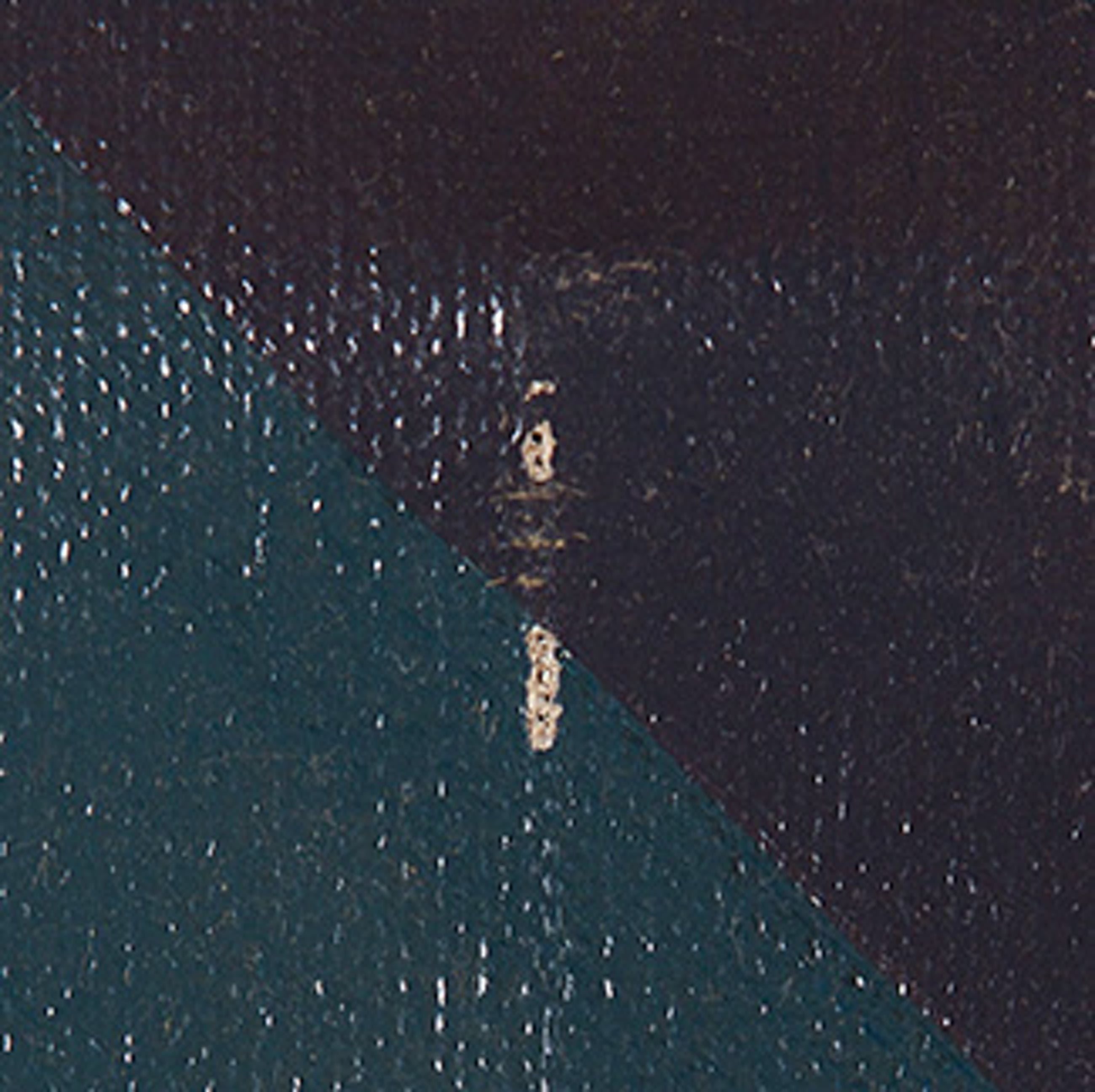 | Het doek is doorgehangen in het midden. Vuil en meerdere beschadigingen zijn over het hele doek verdeeld in de hoeken. | |