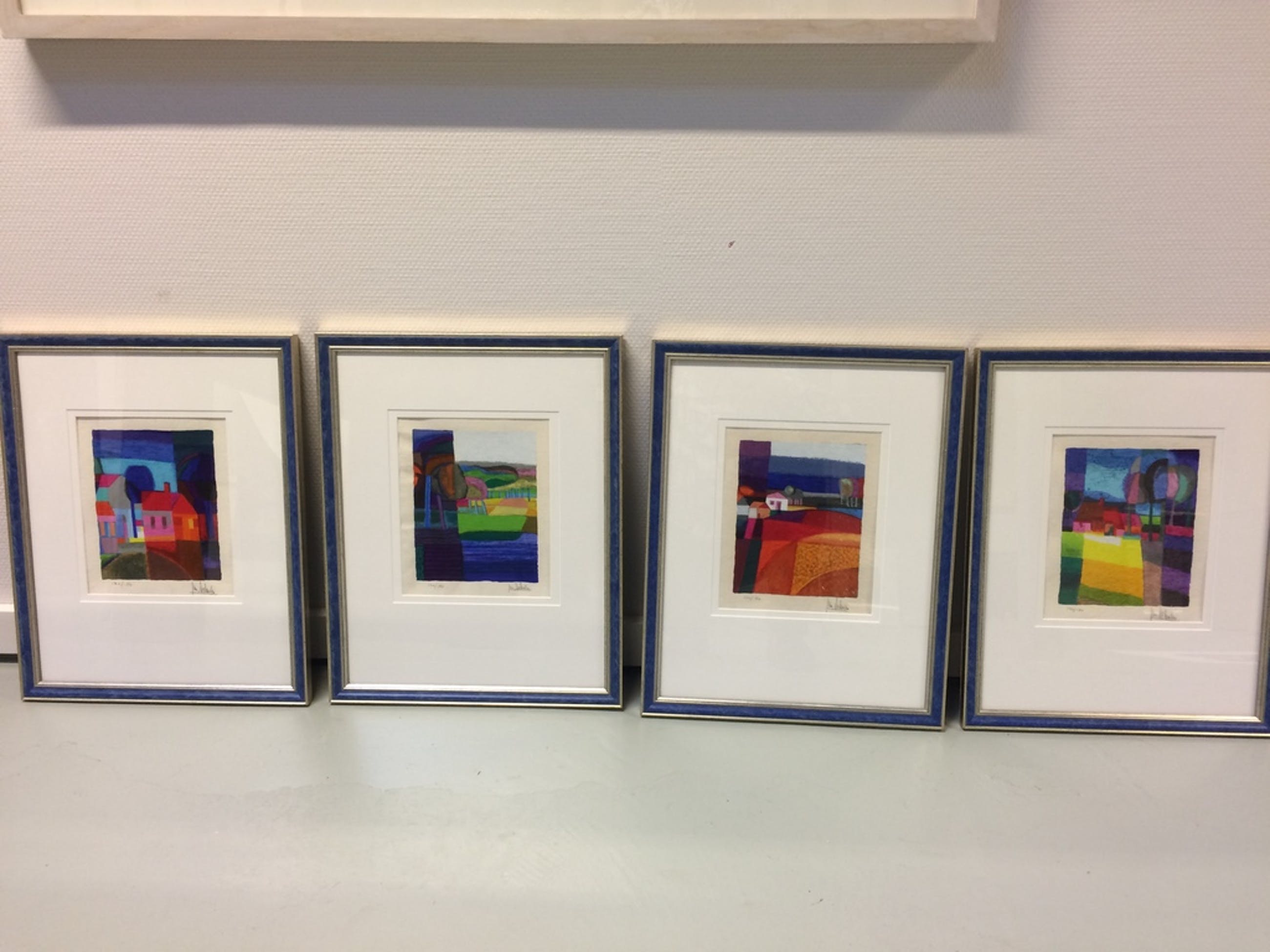 Vier prachtige zeefdrukken van Ton Schulten. Deze serie van vier is op dezelfde manier ingelijst met prachtige blauwe bewerkte lijsten met dubbel passe partout, kunnen zo worden opgehanden. Met een oplage van 180 exemplaren hebben deze vier werken allemaal nummer 130. De lijsten zijn 50 x 40 cm en het zeefdruk is in beeld over een afmeteing 24 x 20 cm. Bieden vanaf € 795,--