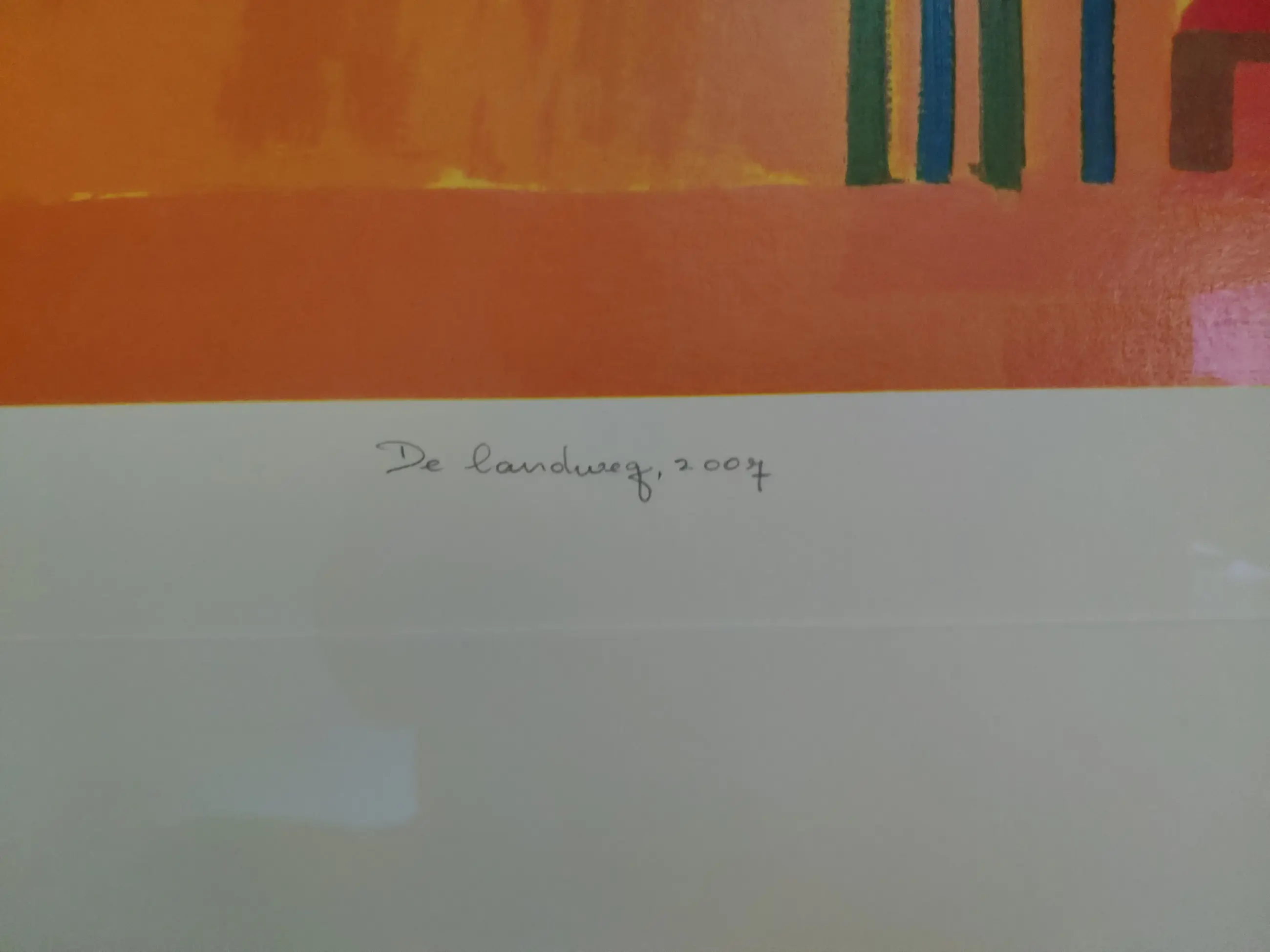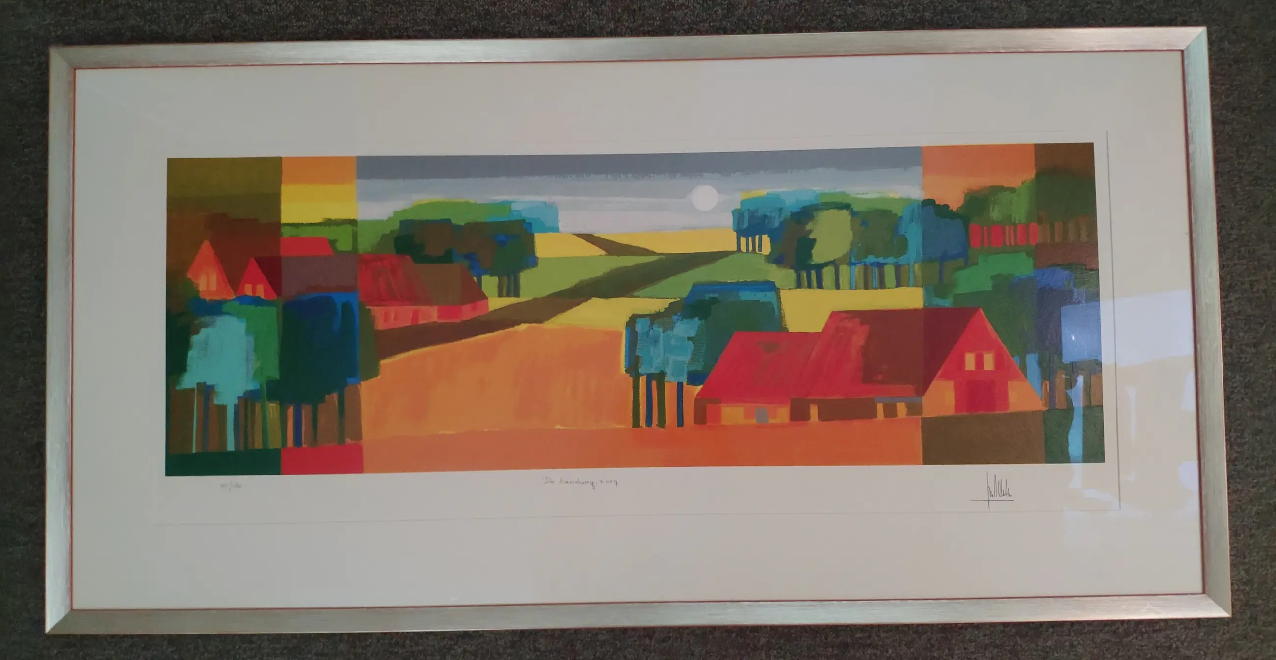 1e eigenaar. Factuur en Certificaat van echtheid aanwezig.Zeefdruk nummer 101 van 180. In de galerie van Ton Schulten in Ootmarsum gekocht. Ontspiegelend museumglas. en bijpassende lijst met oranje accent.