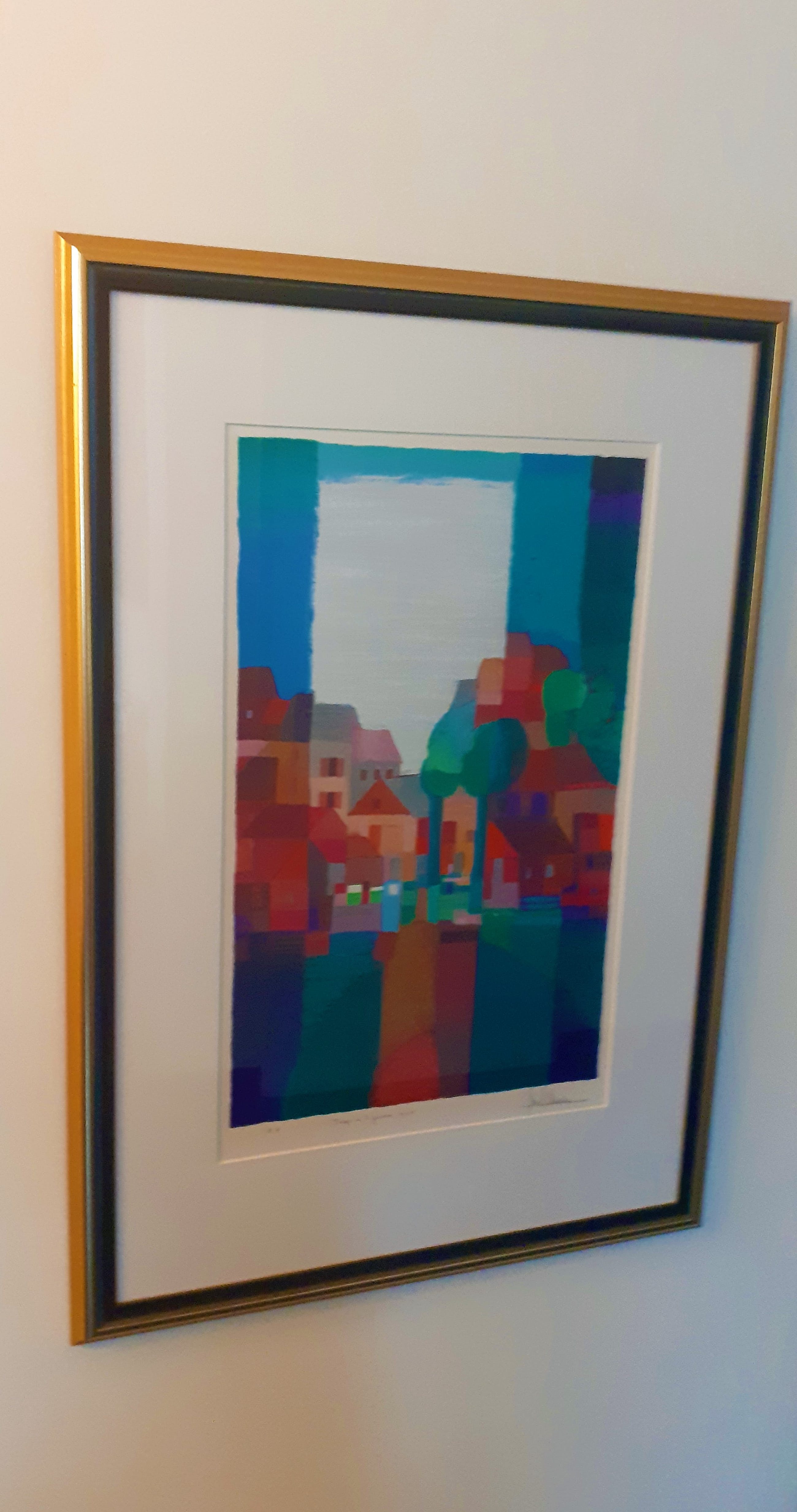 Mooi groot formaat zeefdruk (e.a.), getiteld 'Dorp in 't Groen'' uit 1995 in de zo kenmerkende stijl van Schulten.