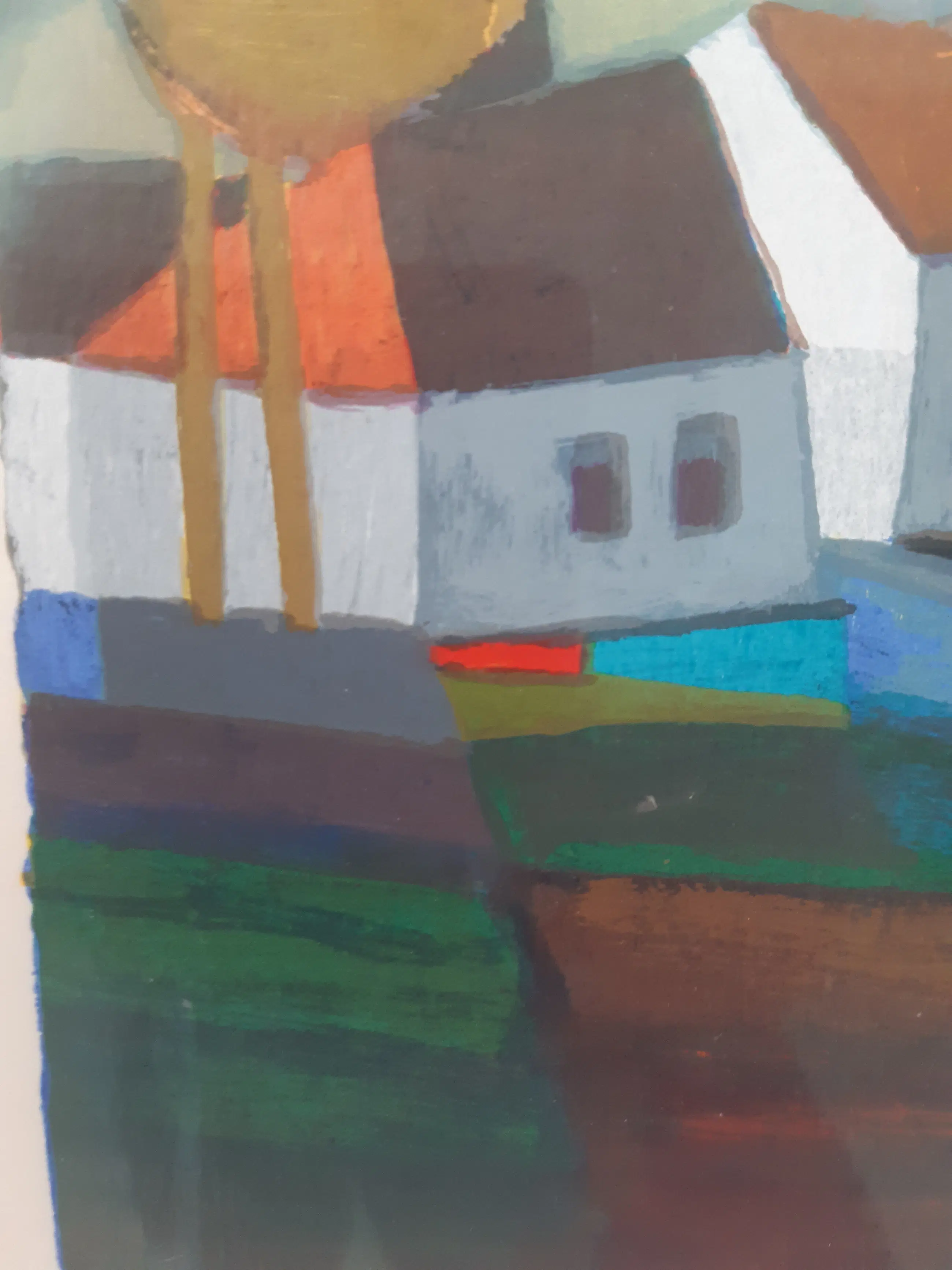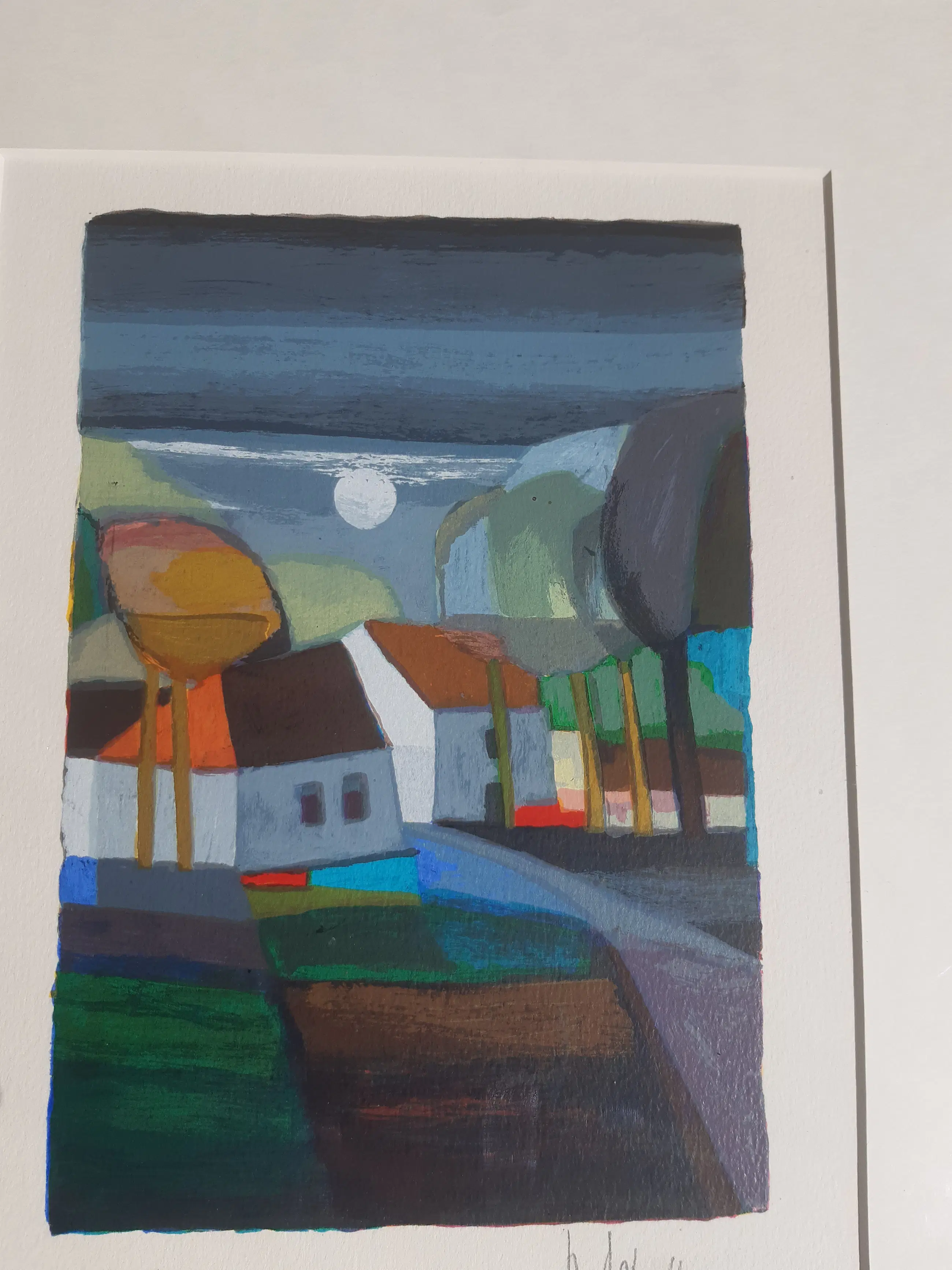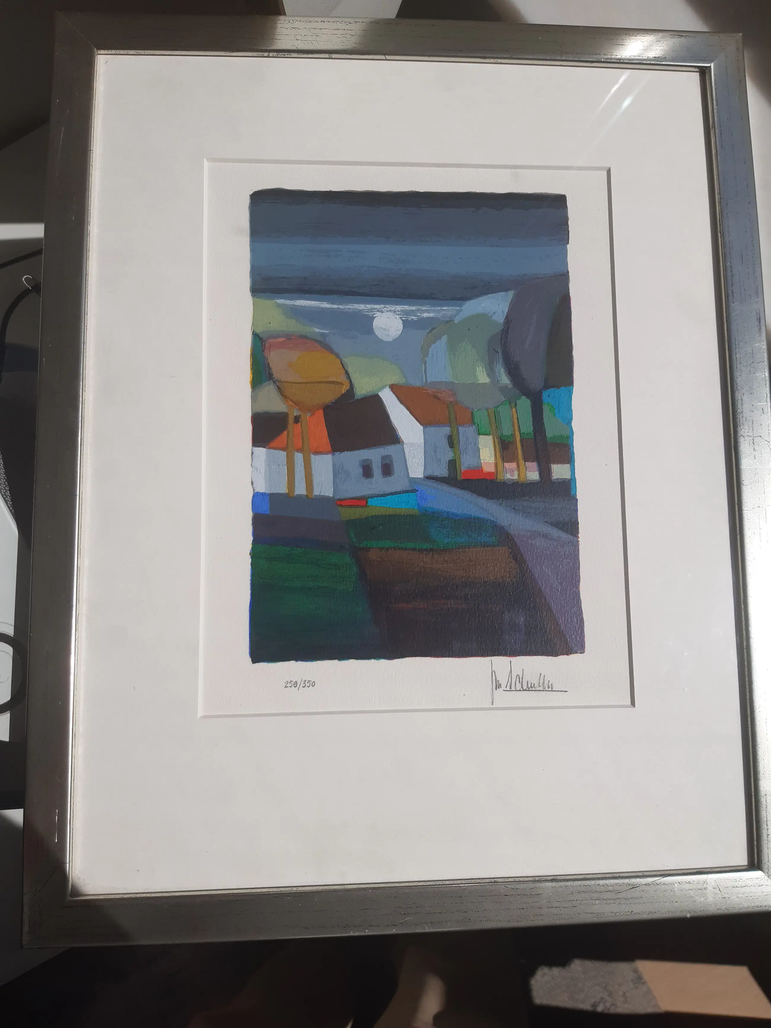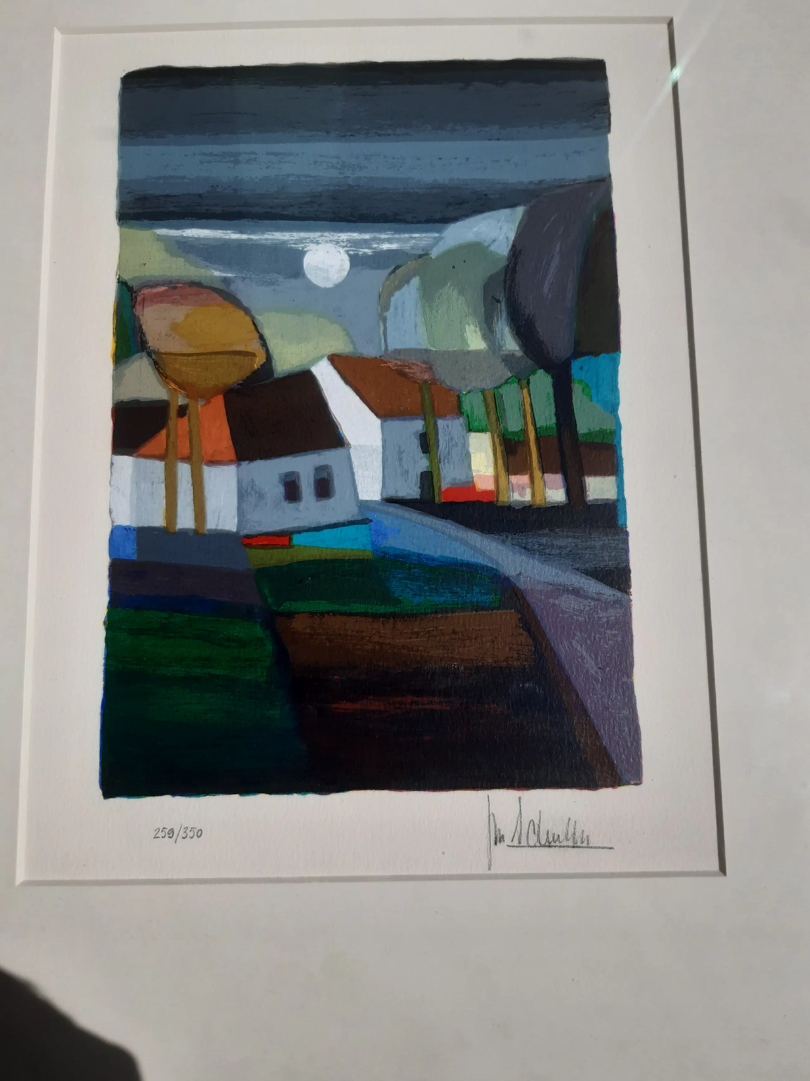 Mooie, kleine zeefdruk van een landschap bij volle maan in de voor Ton Schulten typische stijl. De zeefdruk is genummerd (250/350) en handgesigneerd. Het werk zit in een lijst achter glas.