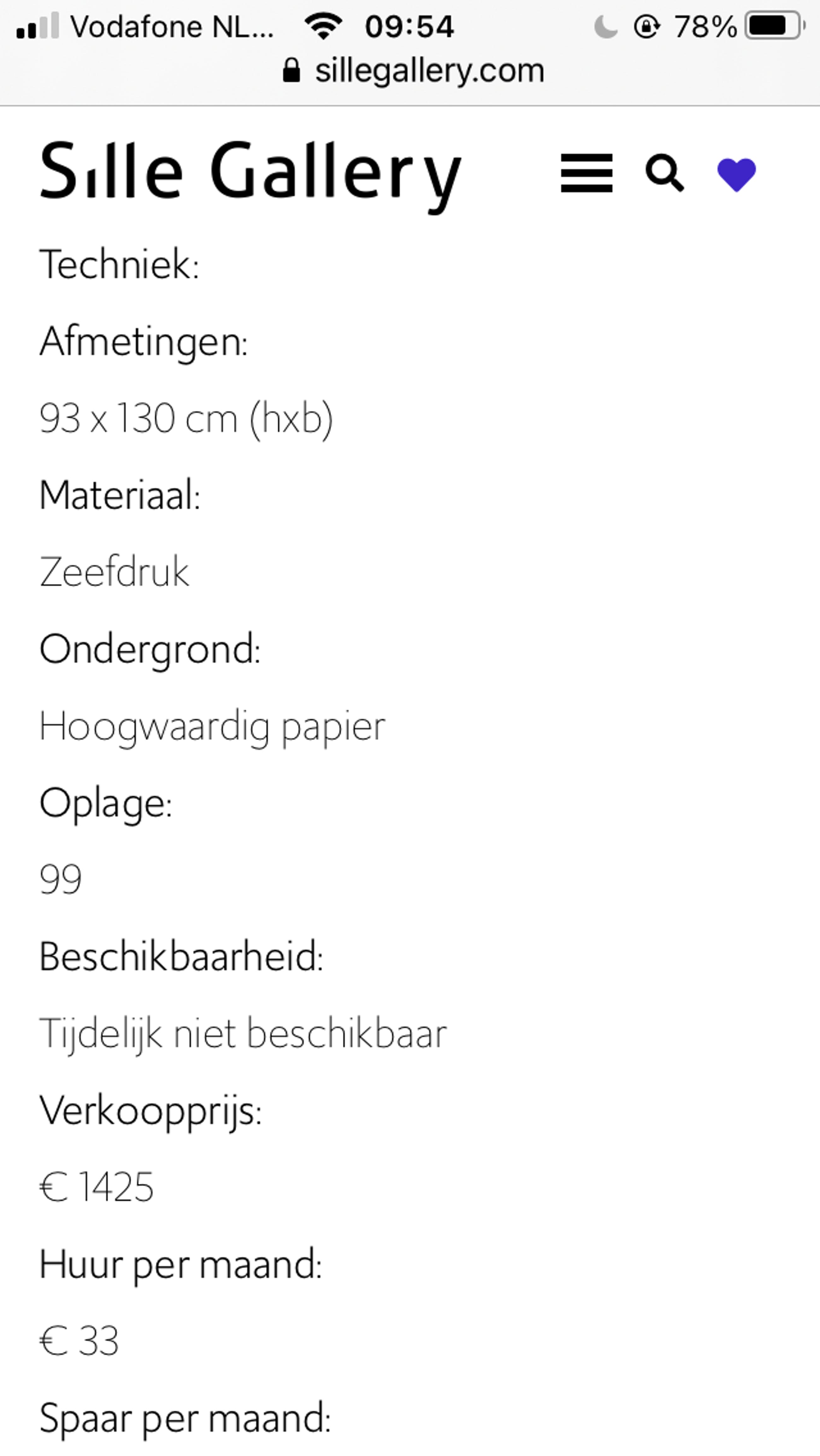 Afhalen Het werk is af te halen op locatie. Als koper dient u zelf verpakkingsmateriaal mee te nemen. De locatie is: Amsterdam, Nederland