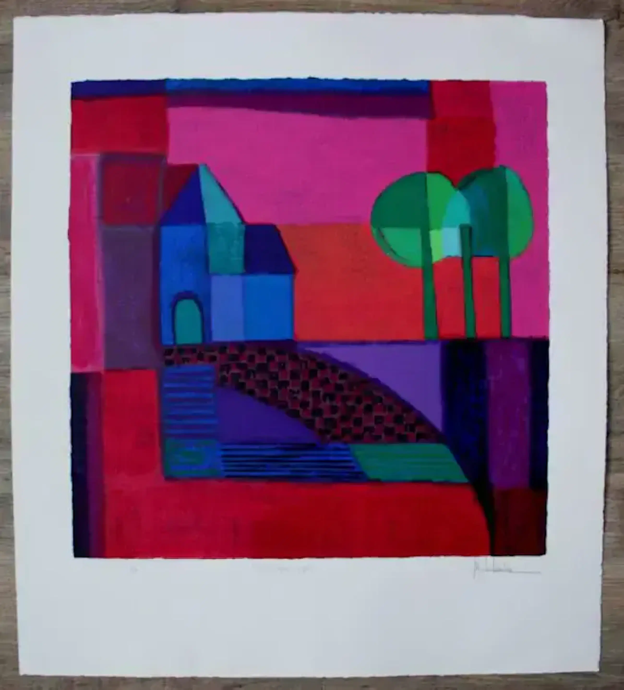 Zeefdruk van Ton Schulten uit 1993. Titel: Veldkapel. Nummer: 142/180. Afmetingen blad: H70.5 x b63cm. Afmetingen voorstelling: H50.5 x b50.5cm. Het werk is rechtsonder gesigneerd door de kunstenaar. De authenticiteit van het aangeboden werk wordt volledig gegarandeerd. Een certificaat van echtheid kan, op aanvraag, worden gemaild.