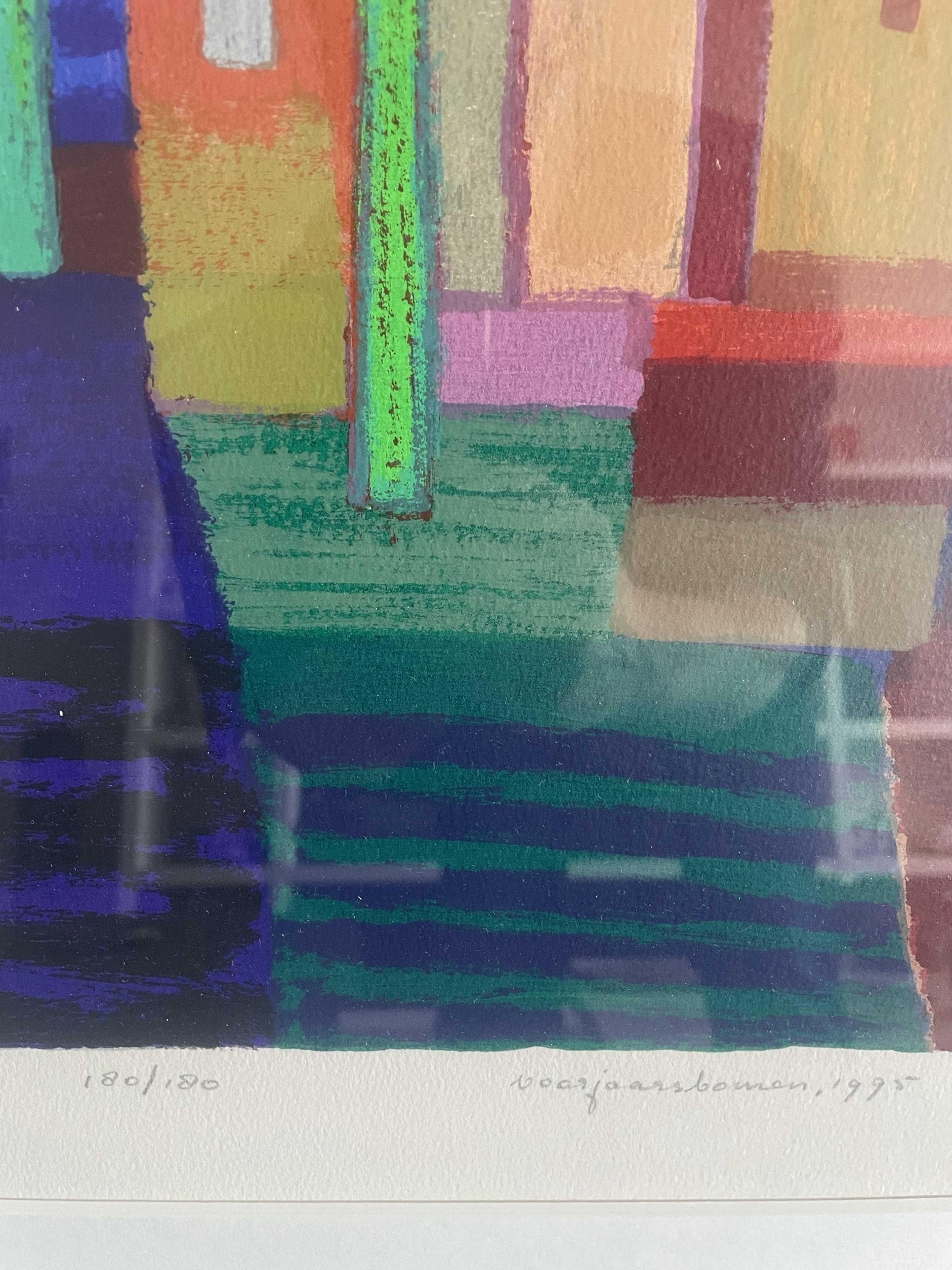Mooi groot formaat zeefdruk in de zo kenmerkende stijl van Schulten. Met potlood gesigneerd en genummerd, het betreft nr. 180 uit een druk van 180. Keurig ingelijst mooi werk.