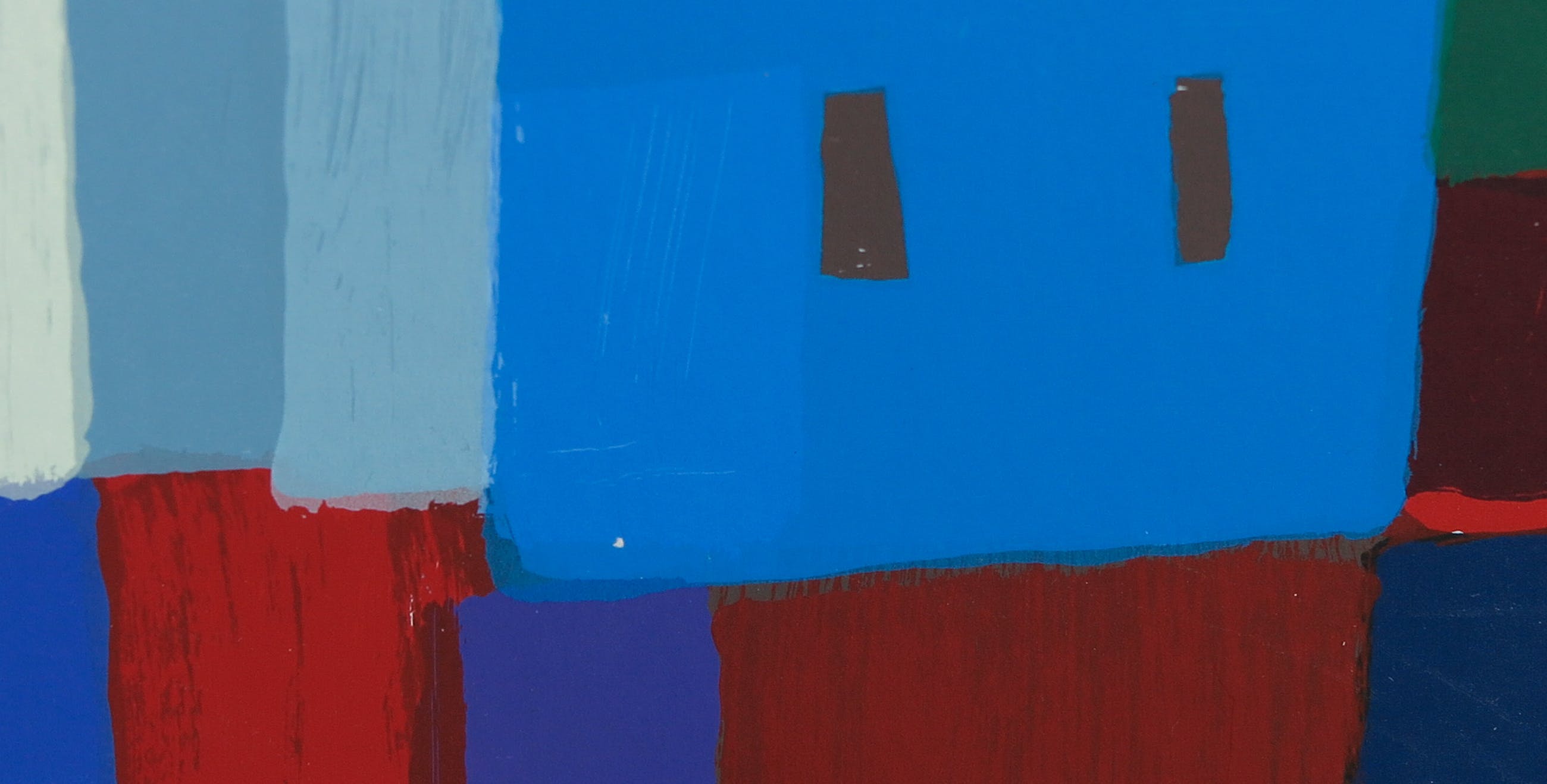 | Er zit geen glas meer in de lijst. Putje in het passe-partout rechts en onder. Kleine beschadiging in het blauwe huisje en enkele oppervlakkige krasjes (zichtbaar met strijklicht) | |
