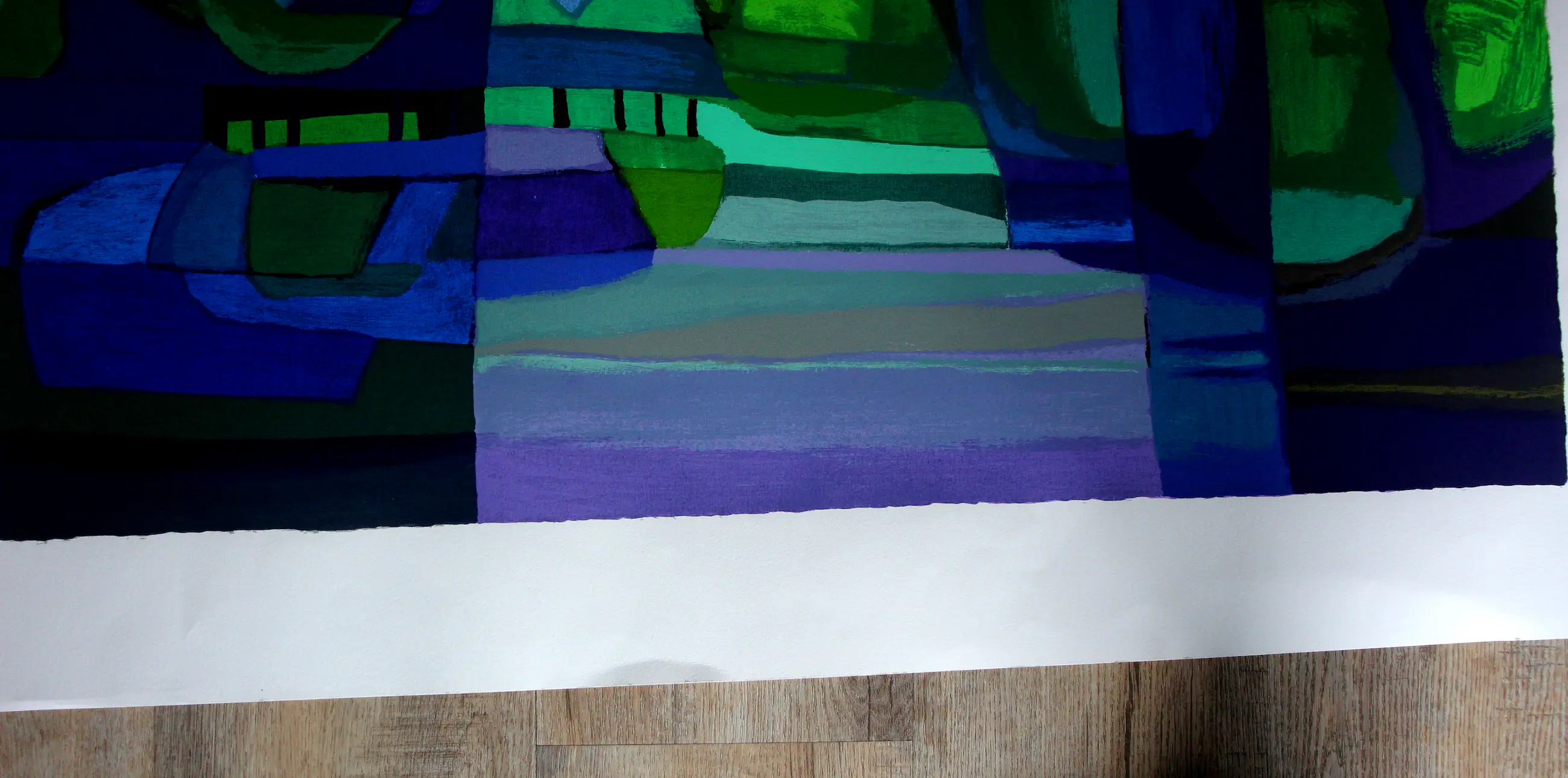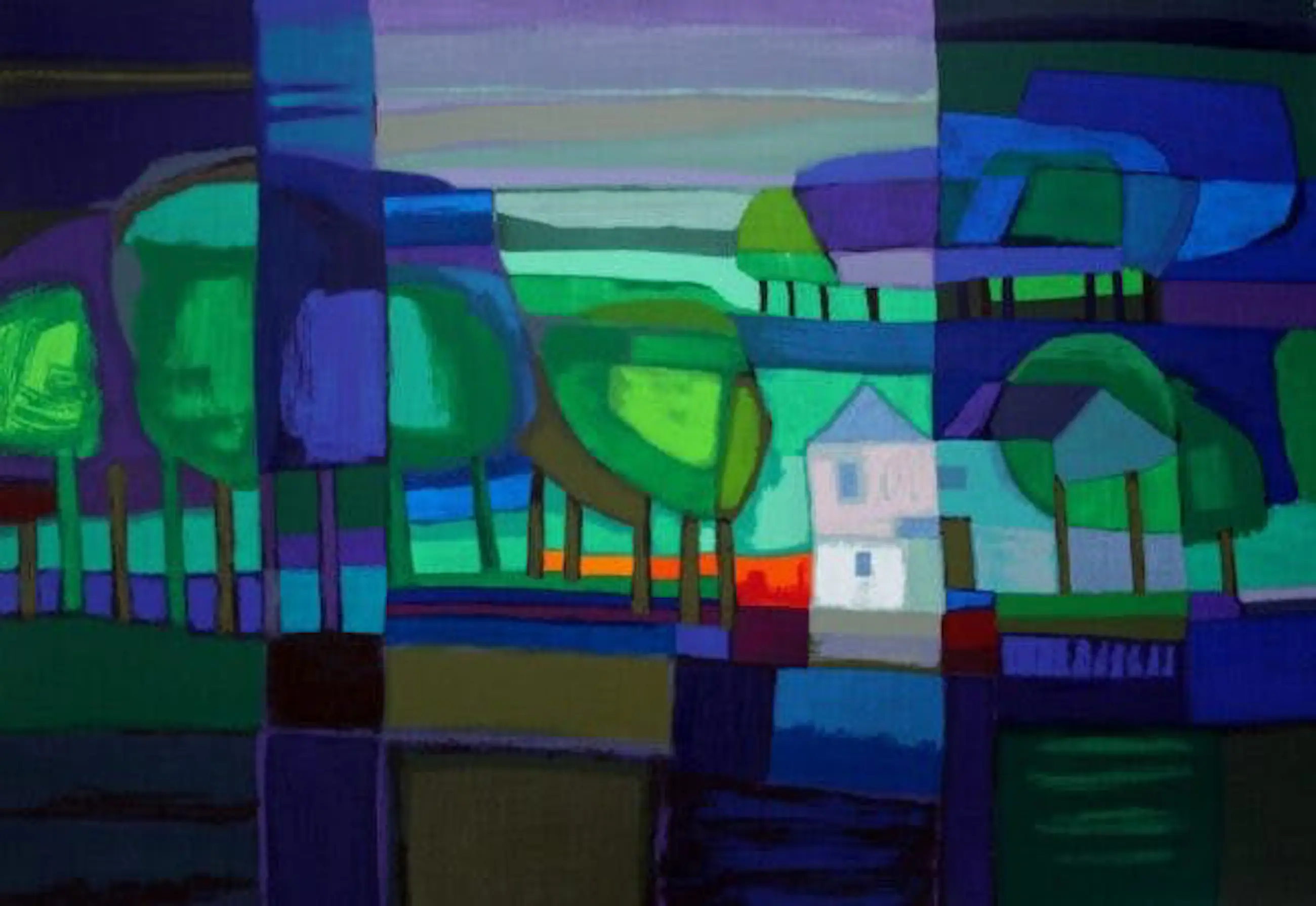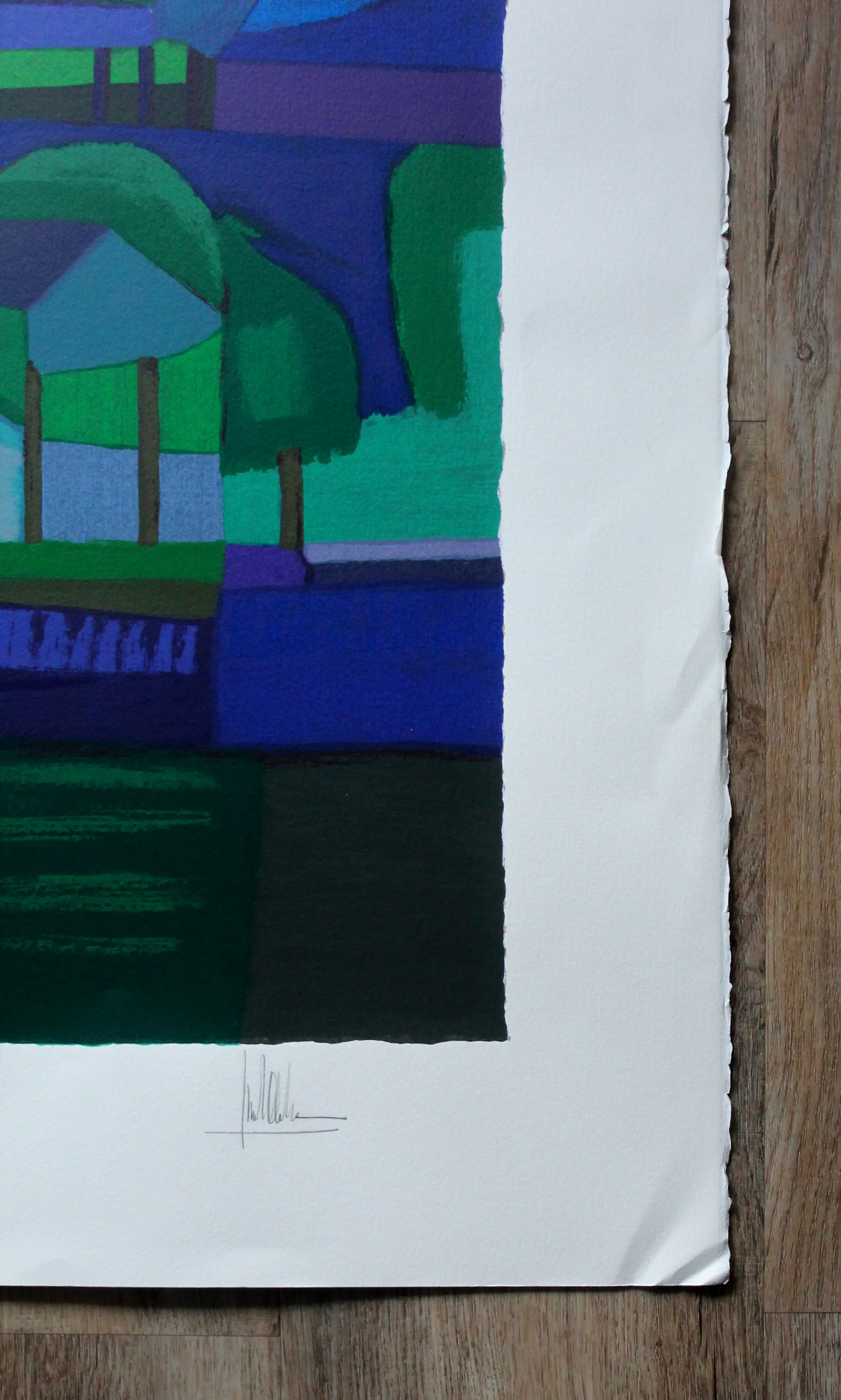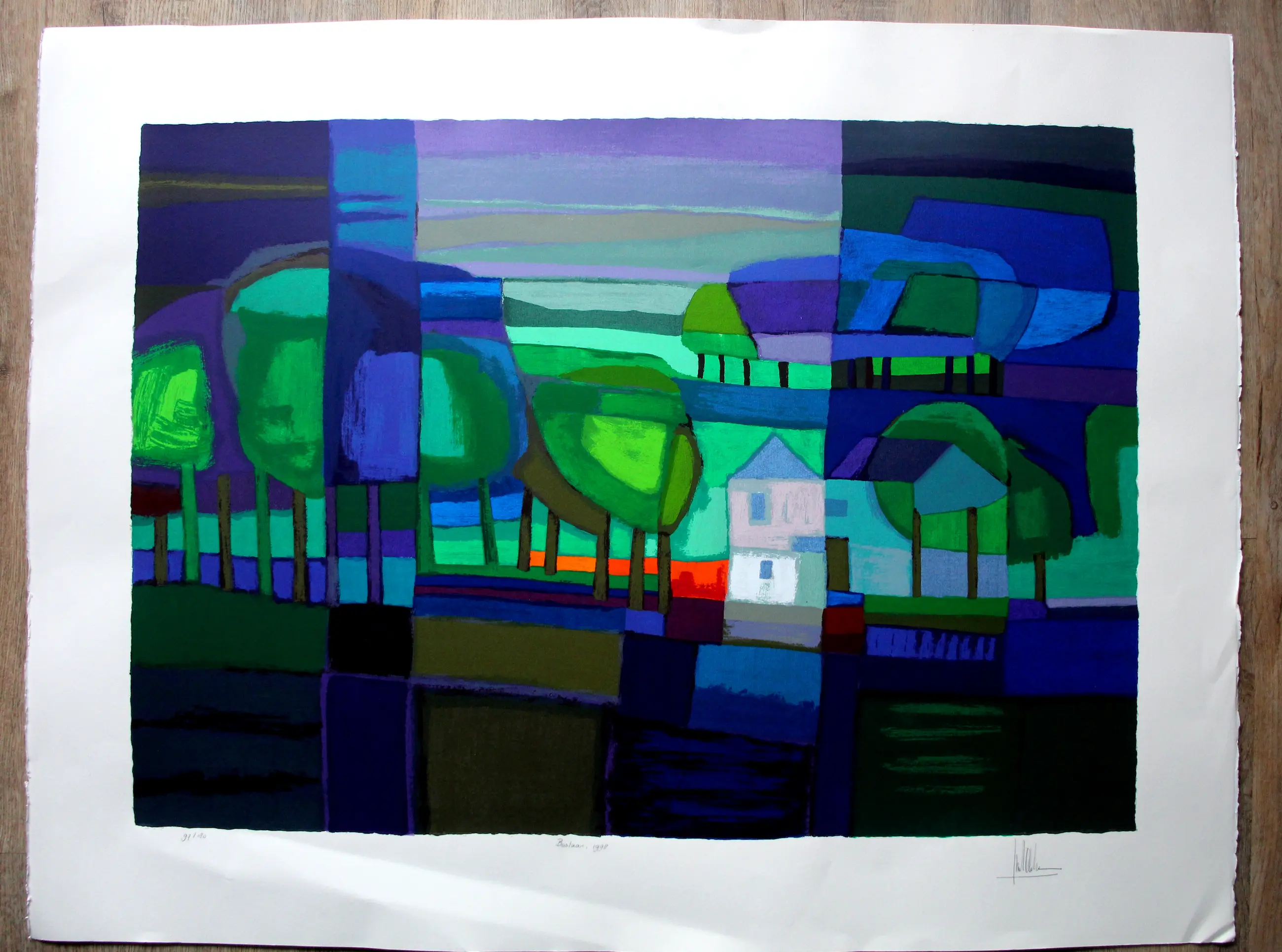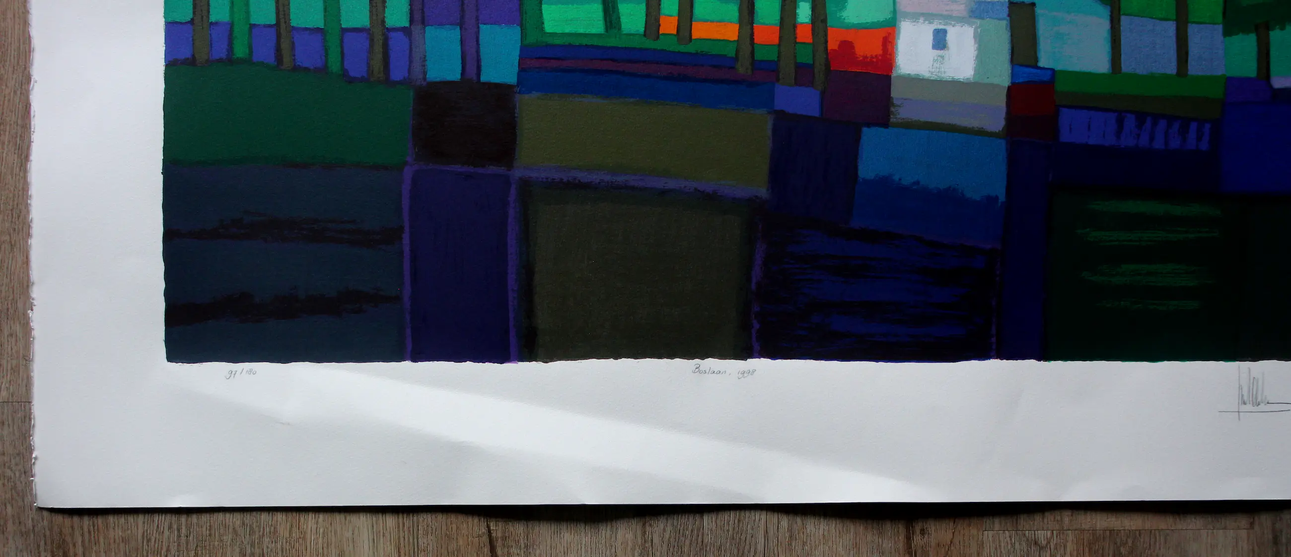 Techniek: zeefdruk Titel: Boslaan Nummer: 97/180 Afmetingen blad : H92 x b120cm. Afmetingen voorstelling: H70 x b99cm. Het werk is rechtsonder gesigneerd.