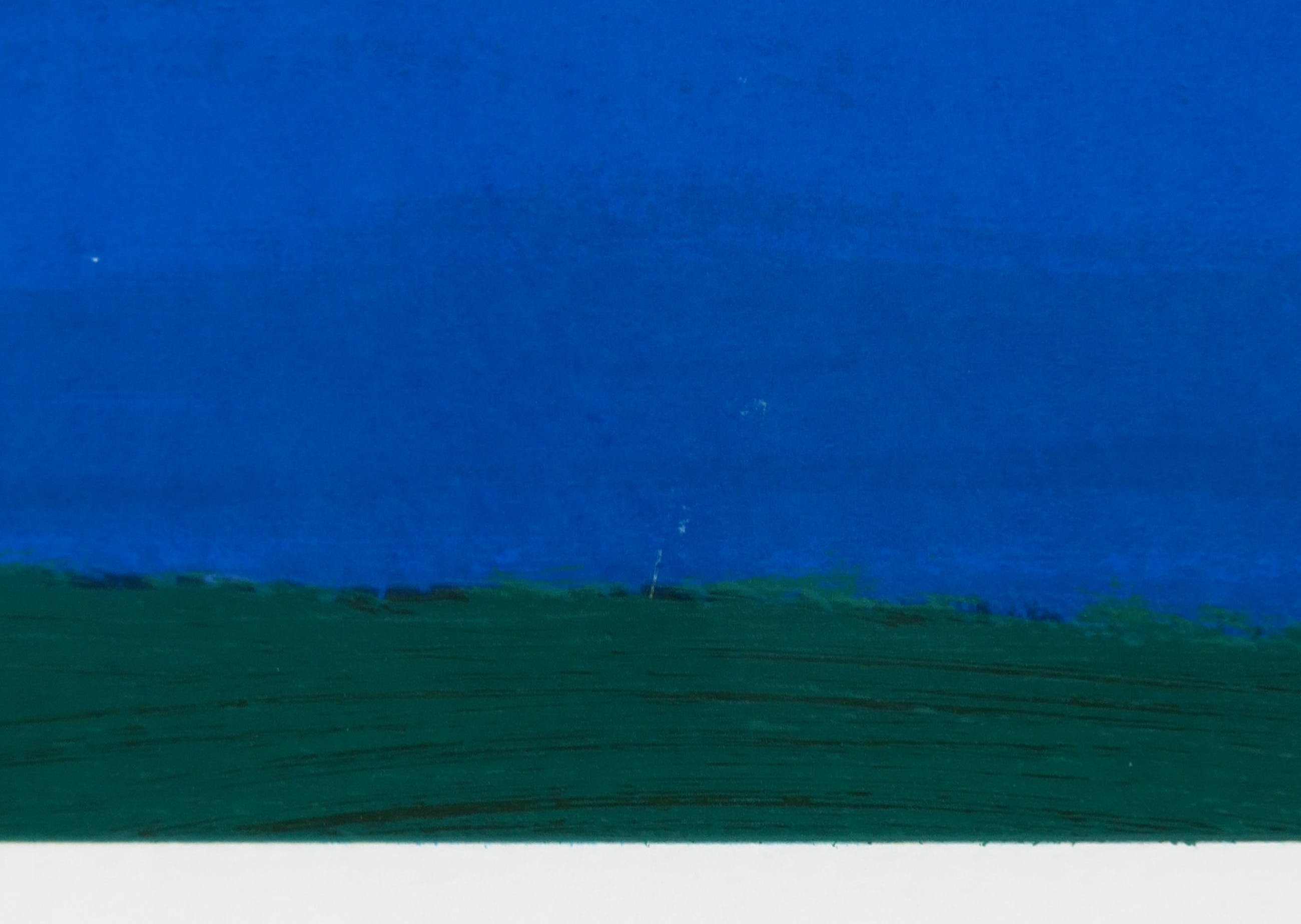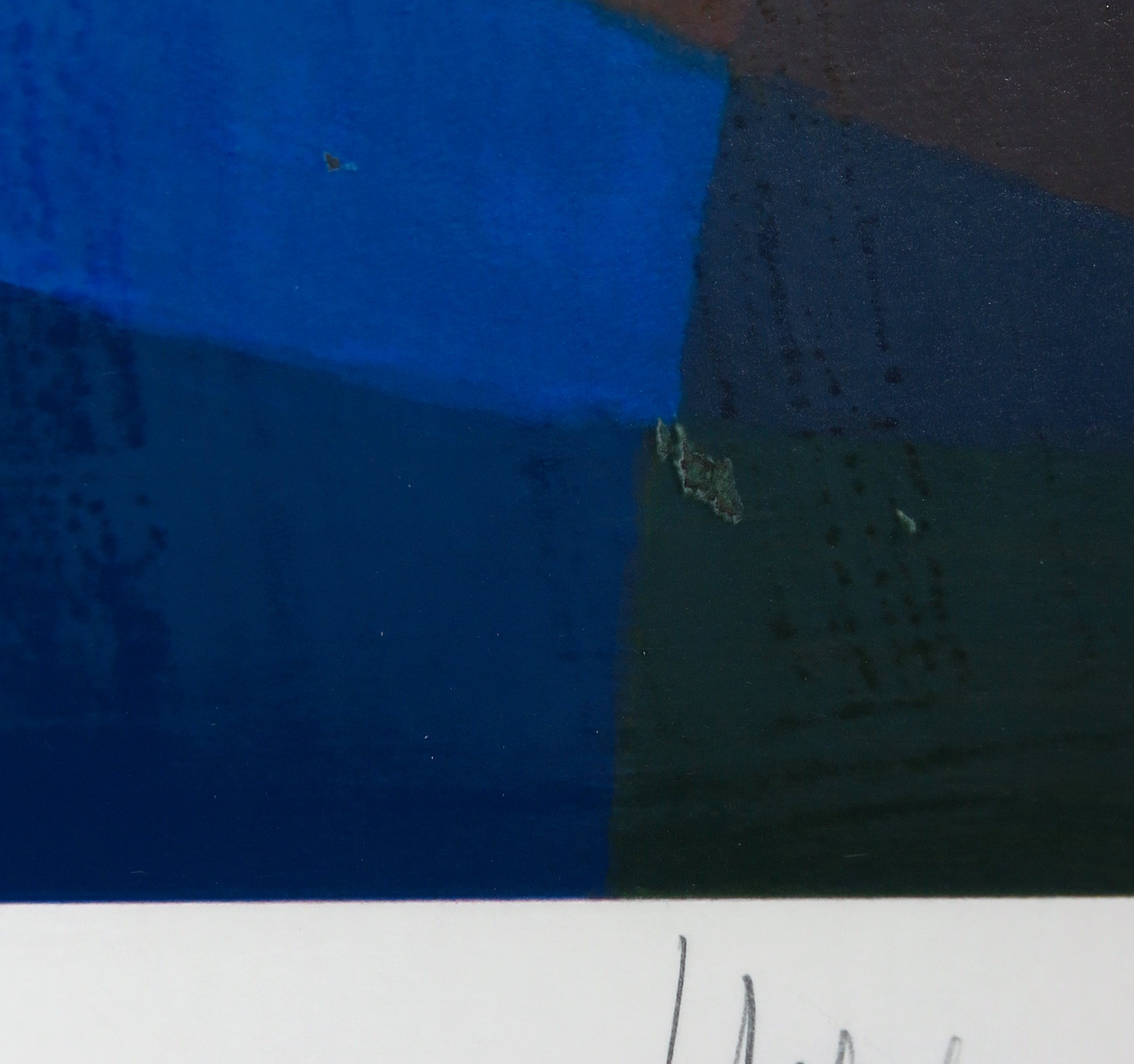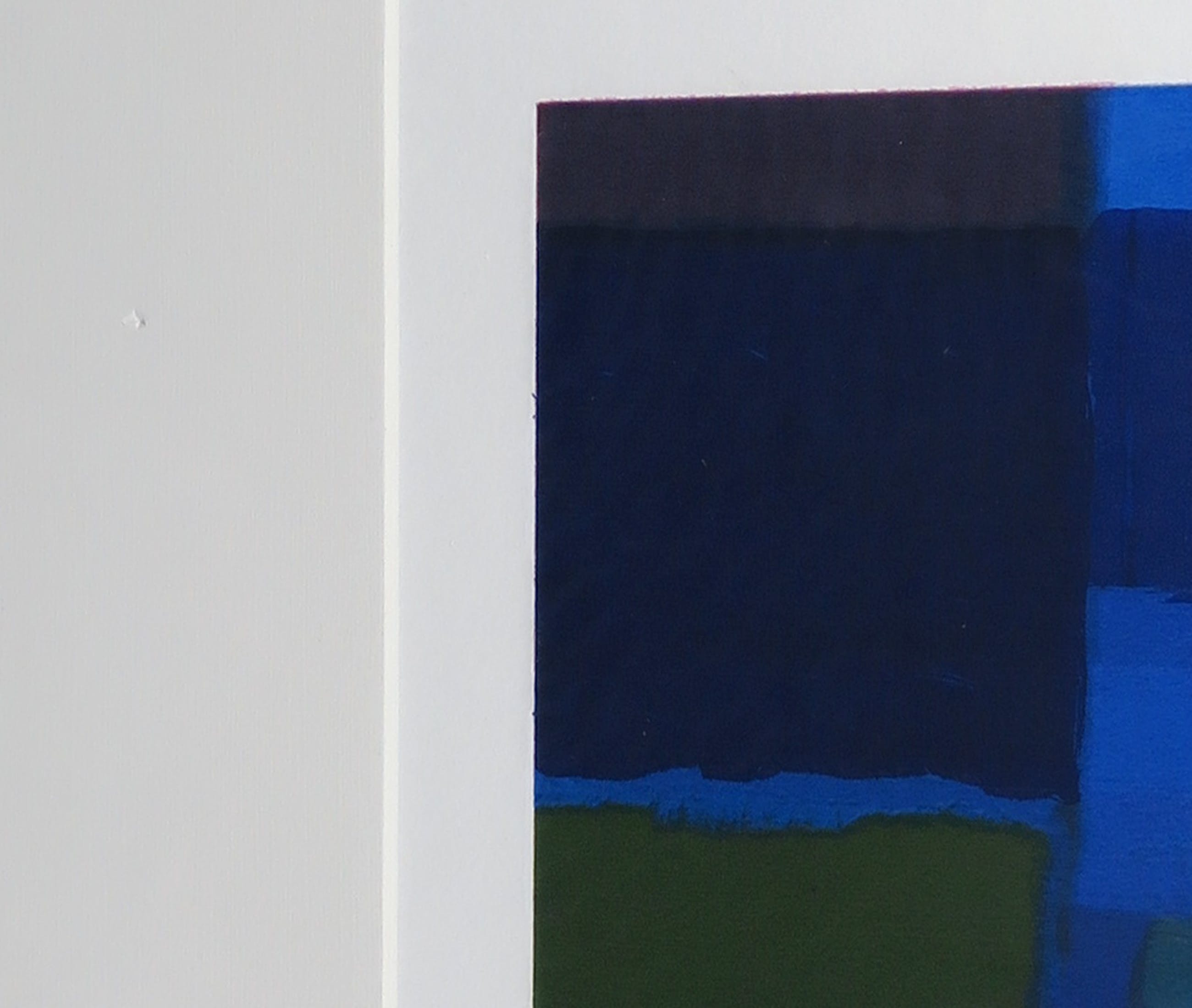 | Wel enkele imperfecties in de druk, zie de detailfoto's. Klein putje in het passe-partout (laatste foto). Wat aanslag op de binnenzijde van het glas. | |