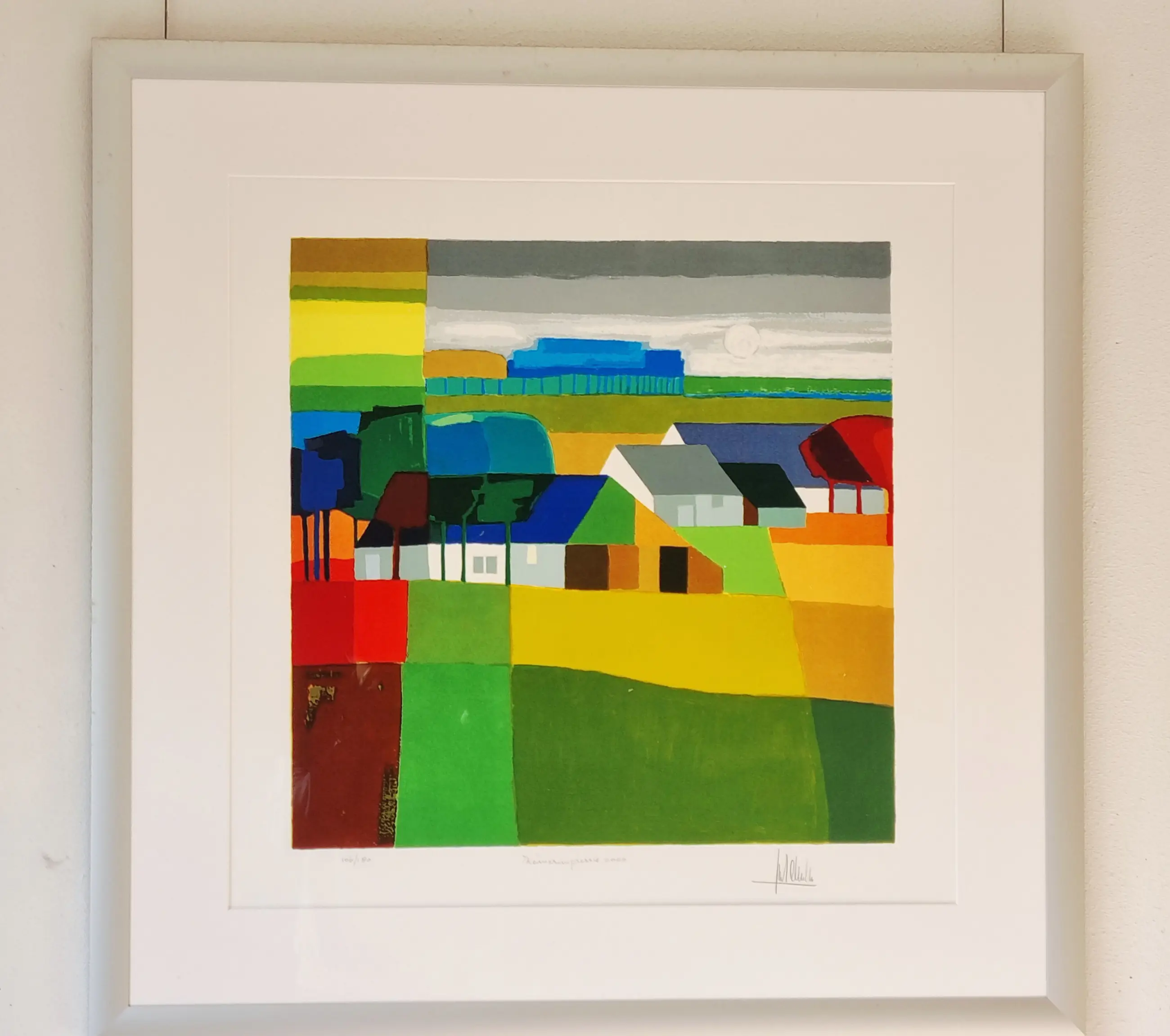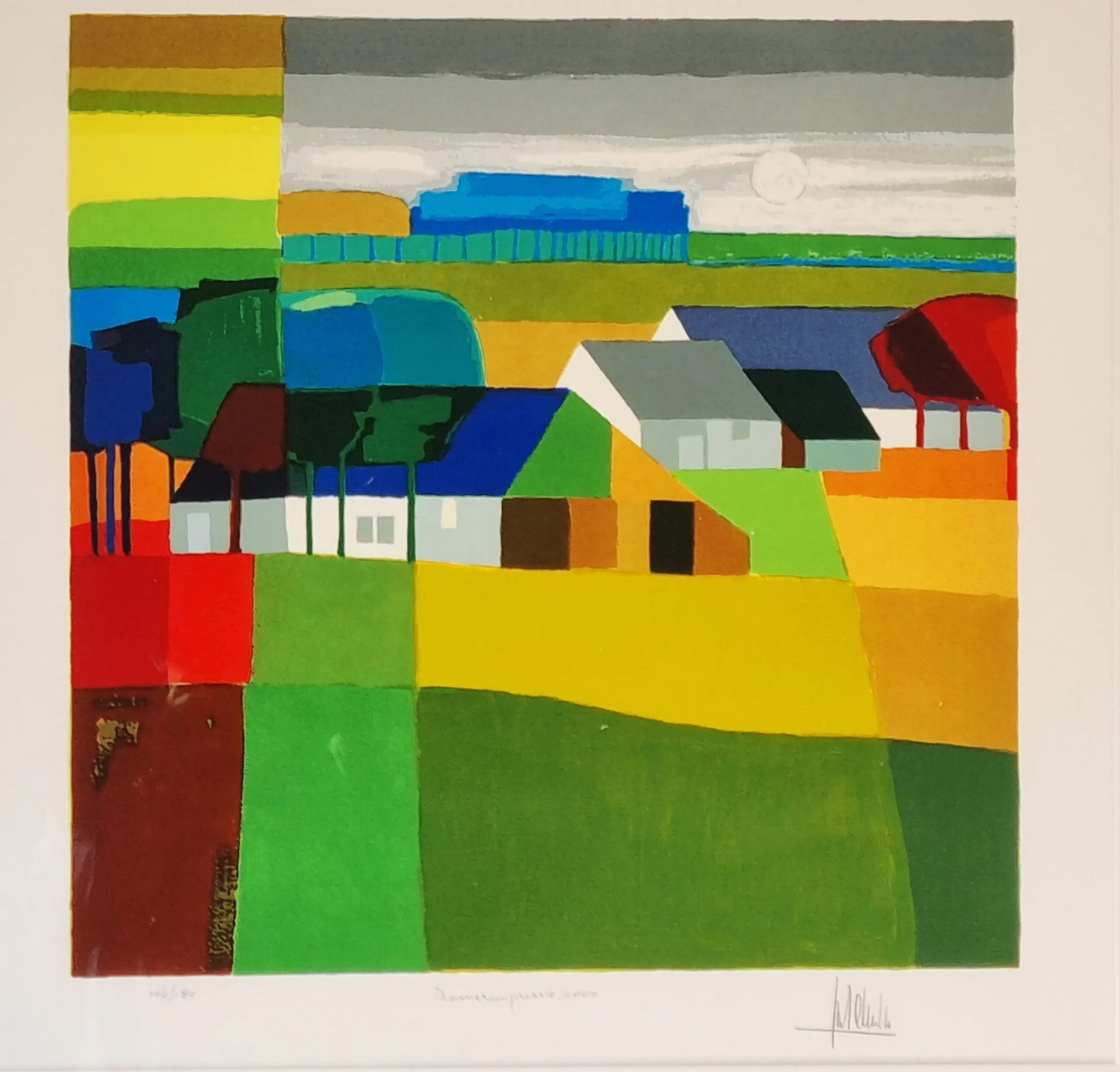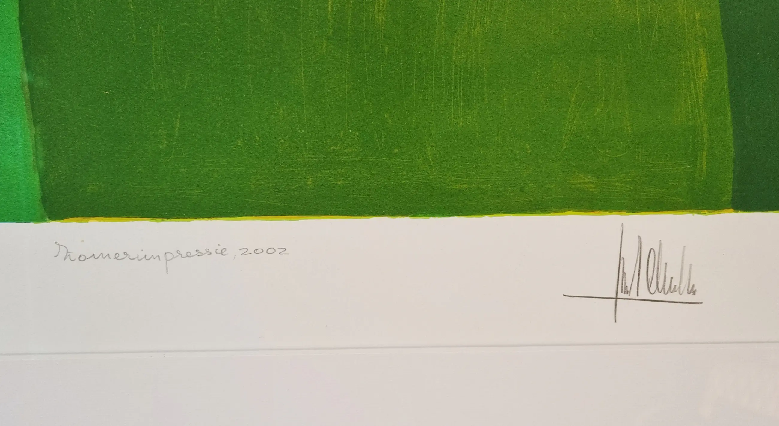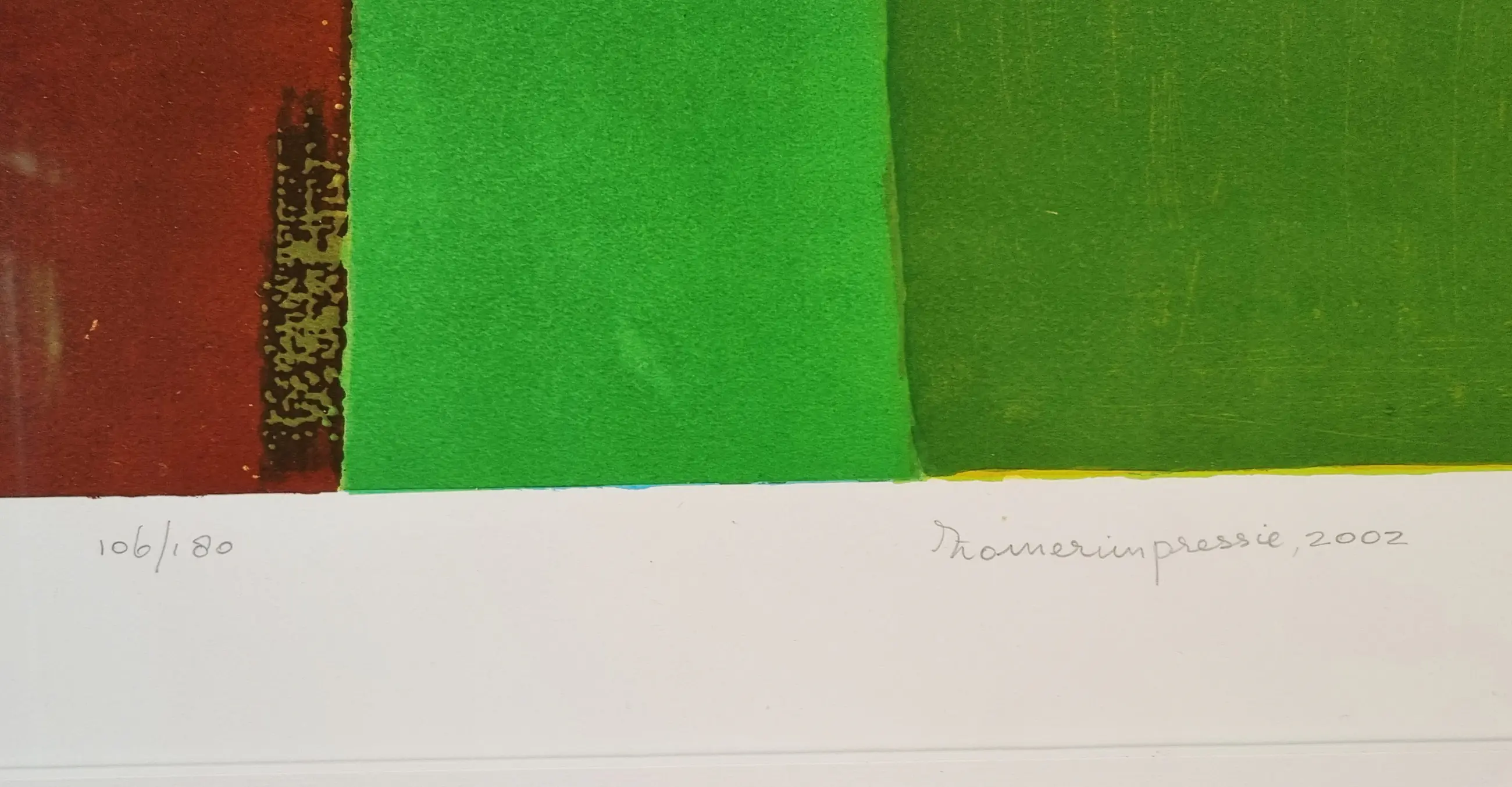 Prachtige zeefdruk van Ton Schulten uit 2002 De zeefdruk is ongeveer 80x80 cm. De afbeelding zelf 60x60 cm. De zeefdruk is mooi ingelijst in een aluminium lijst met passepartout en museumglas. Het geheel verkeert in perfecte staat. De kleurverschillen in het bruine vlak zijn origineel. Er zijn geen beschadigingen. Ivm de kwetsbaarheid zelf afhalen in Den Haag.