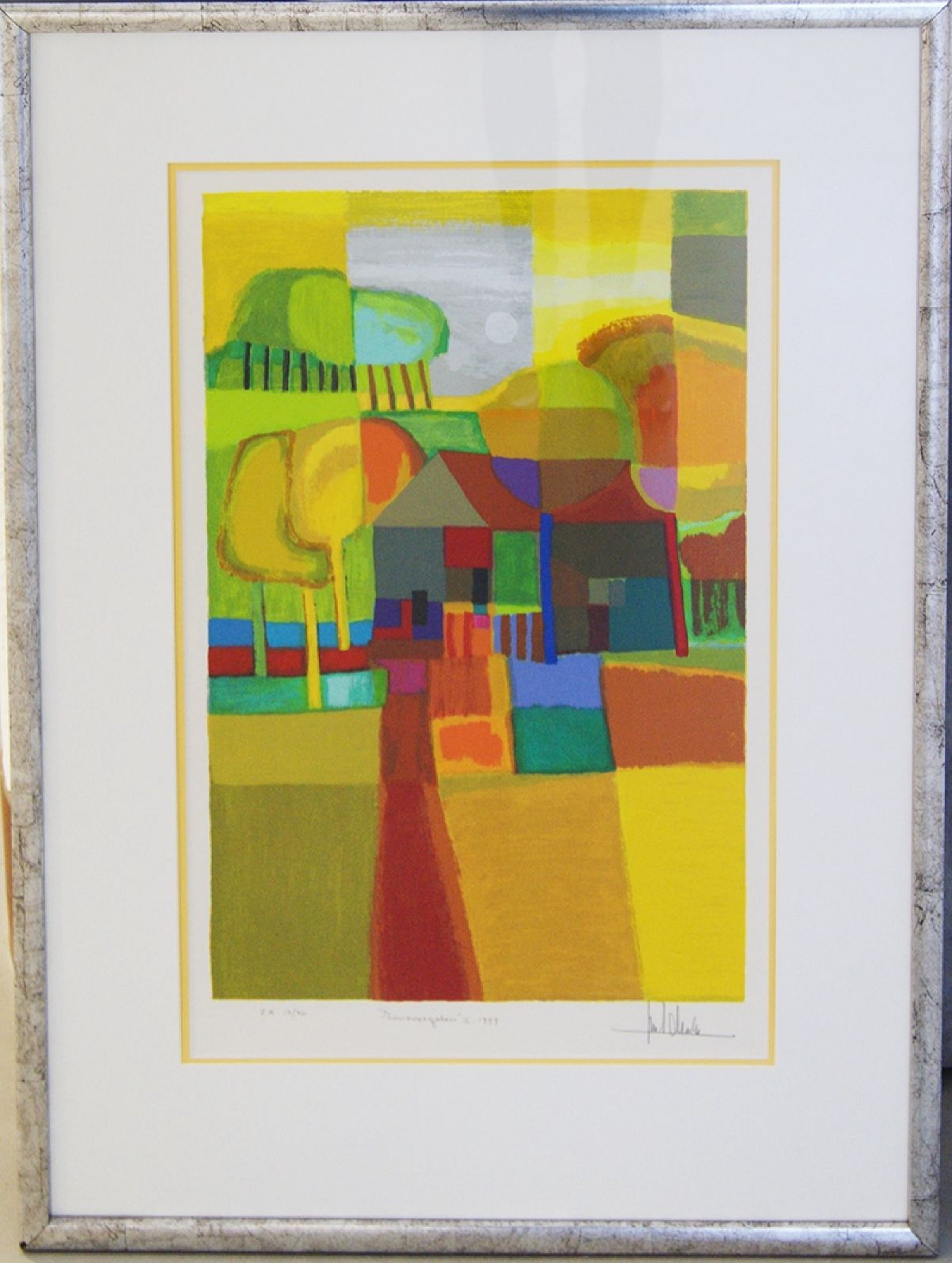 Zeefdruk van Ton Schulten. Landschappelijk werk in vrolijke kleuren.