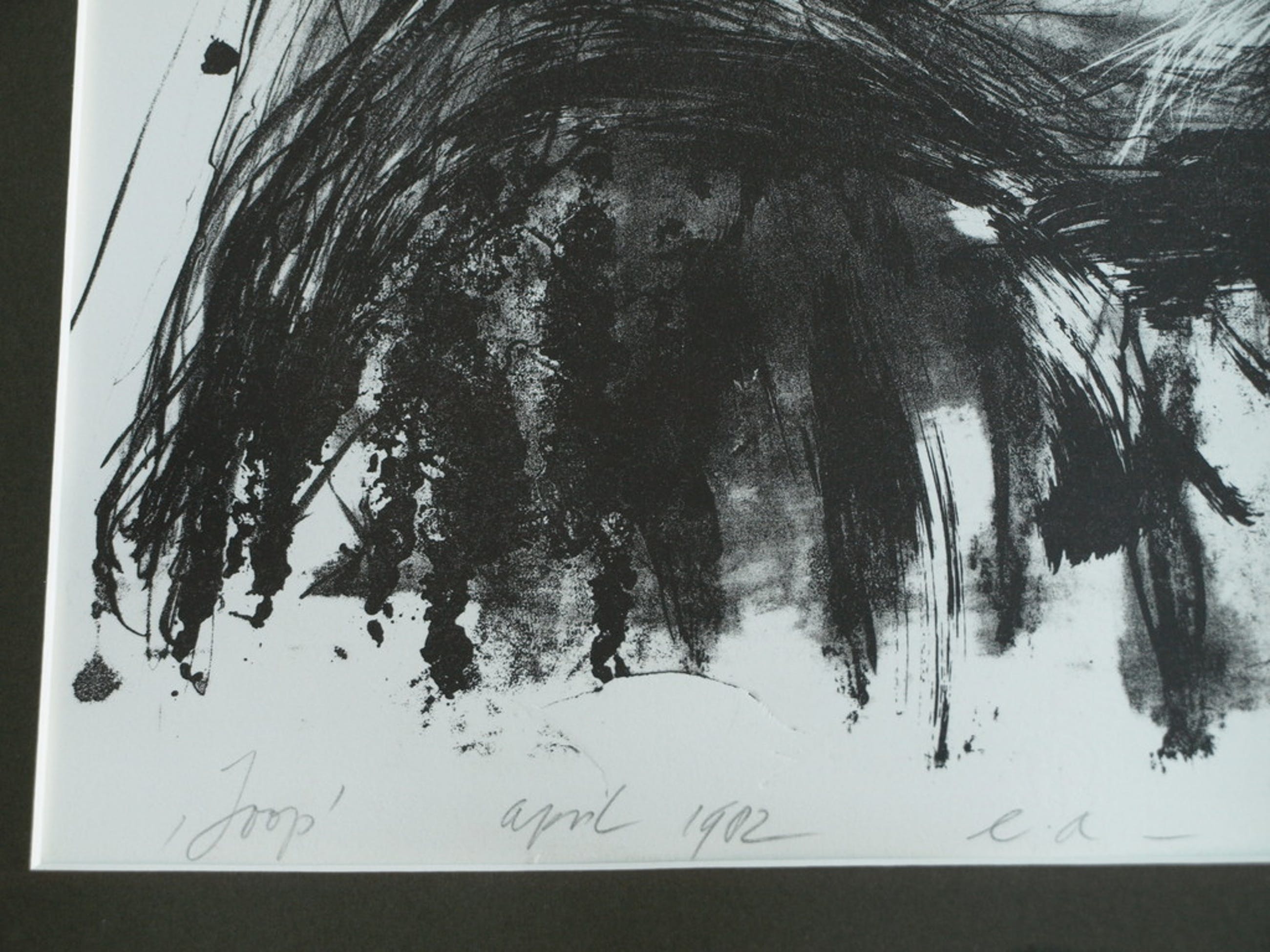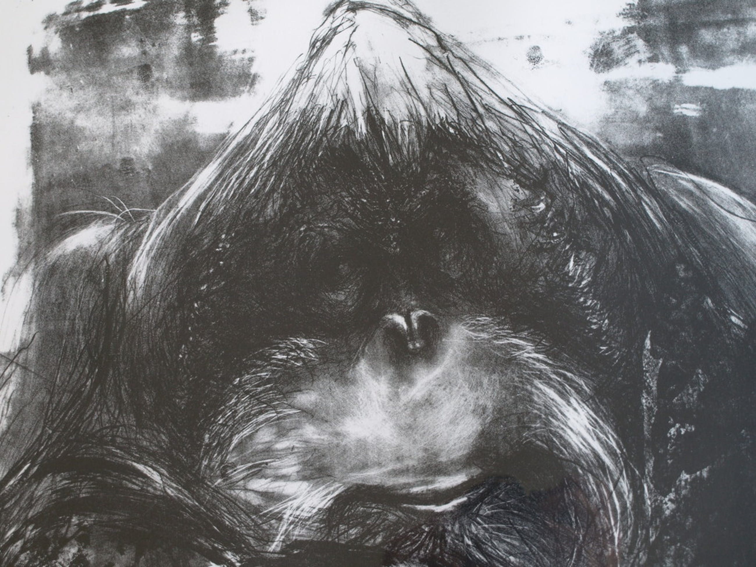 Een litho, gemaakt in Artis, uit april 1982 van de Nederlandse kunstenaar Ton Söder (1954), met een voorstelling van de Orang-oetan “Joop”.