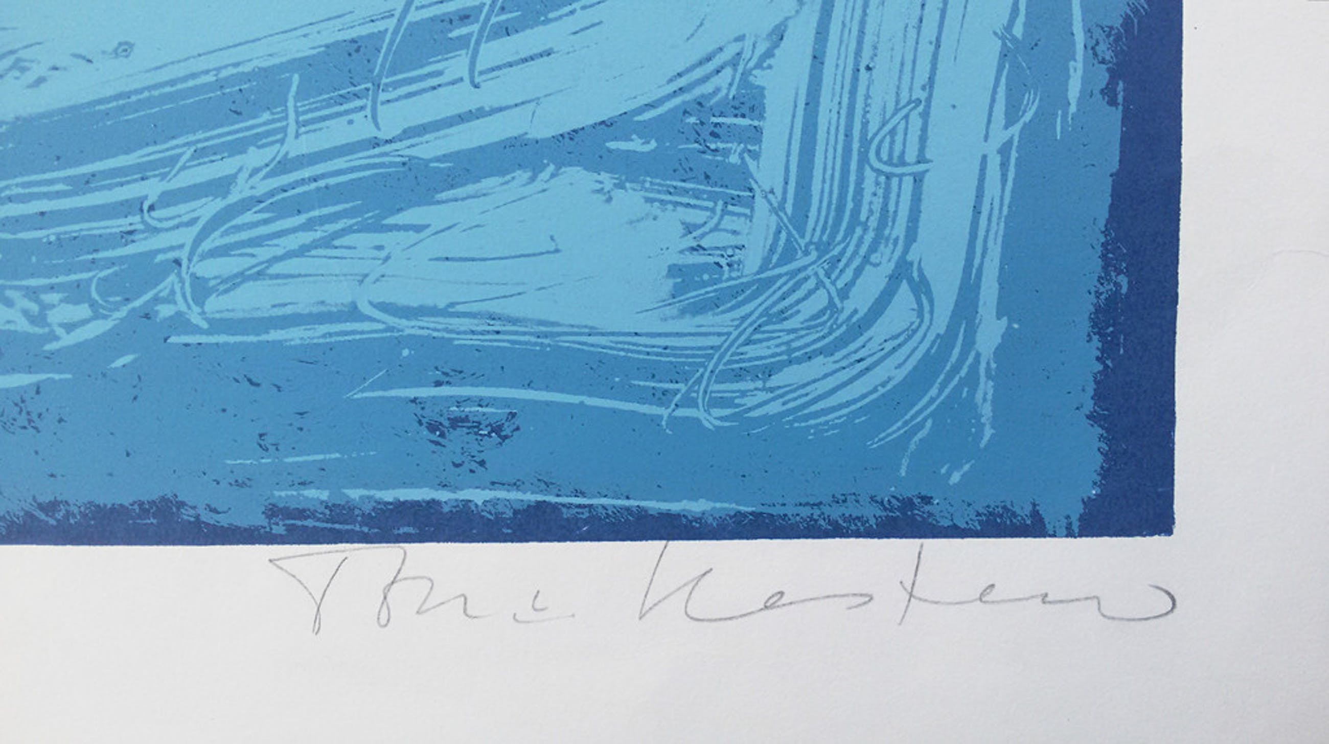 Zeer mooie zeefdruk van Ton van Kesteren. Met potlood gesigneerd en genummerd (163/200). In goede conditie; beeld is uitstekend, uiterste witte marges her en der wat vlekjes en kreukjes. Indien ingelijst met passe-partout zijn de onregelmatigheden niet meer te zien en wordt het een kunstwerk dat van de muur af spat.
