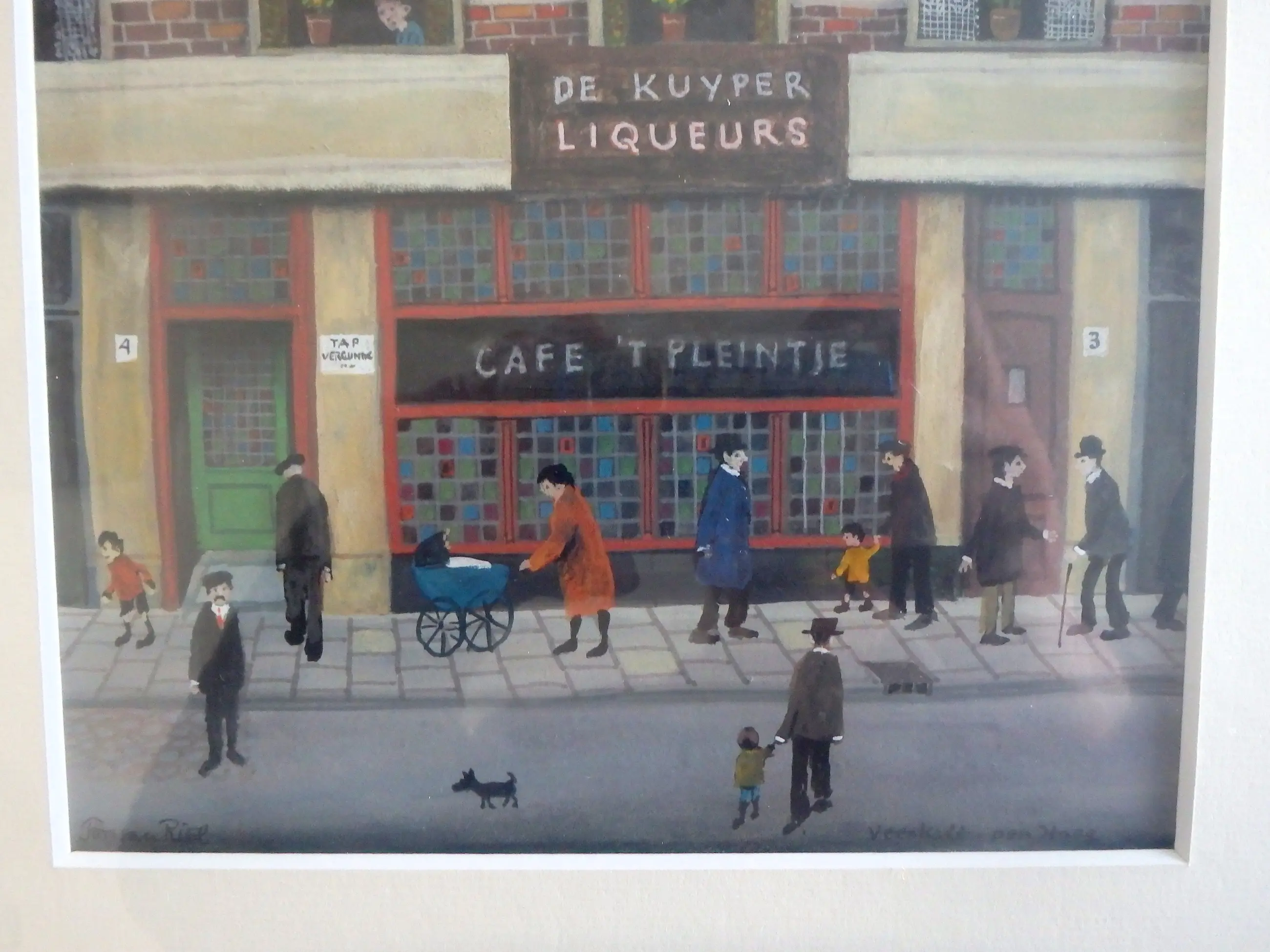 Gouache ca. 21x19, linksonder gesigneerd Ton van Riel en rechtsonder "Veenkade, Den Haag. Werk zal zijn uit de jaren '70. Gouache is op de mooiste manier ingelijst.