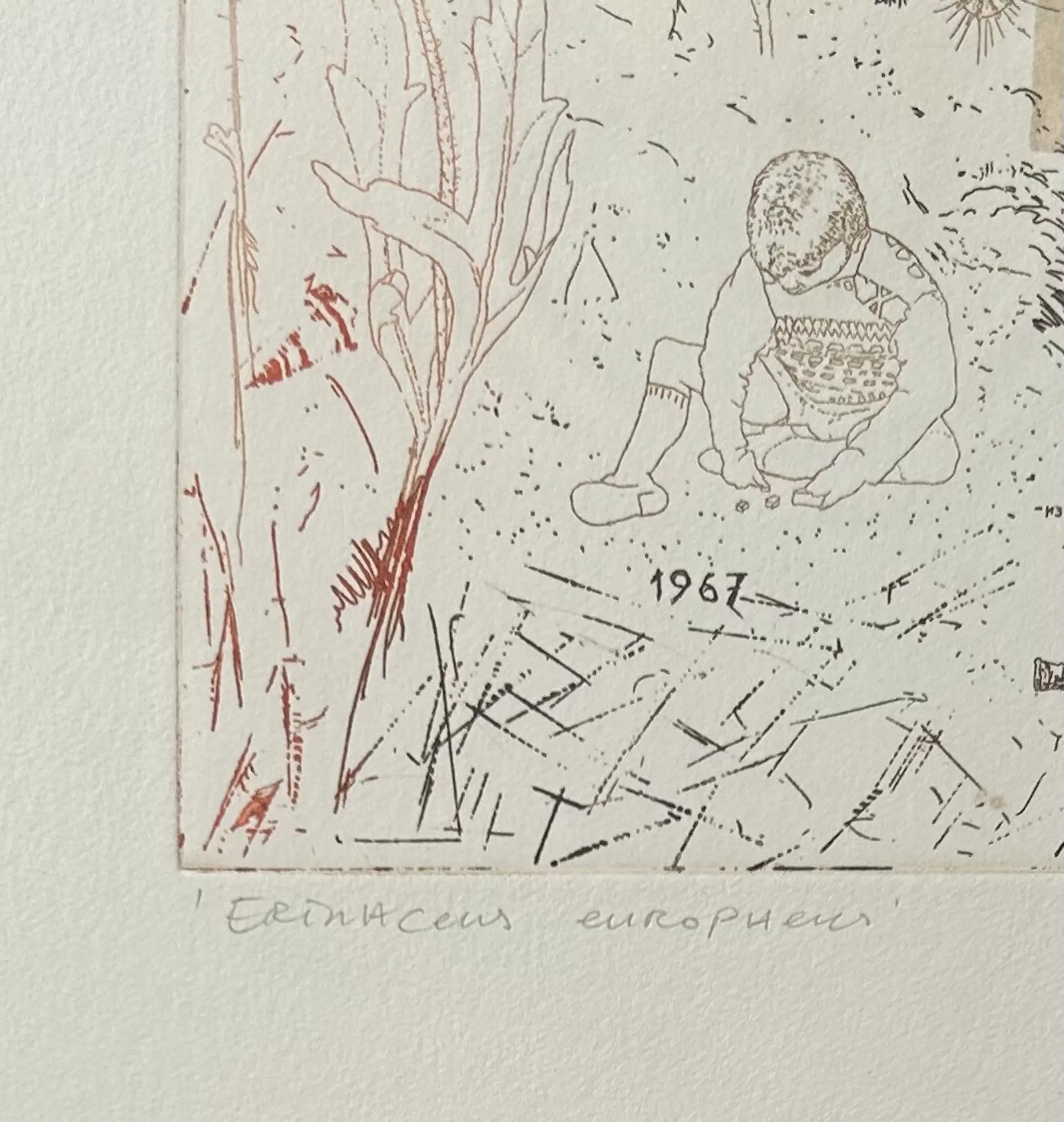 Prachtige compositie met in het midden een egel uitgebeeld. In potlood gesigneerd, getiteld (Erinaceus Europaeus) en genummerd: 5/20. Zie foto's. Gezien de grootte heeft ophalen (in Utrecht) de voorkeur.