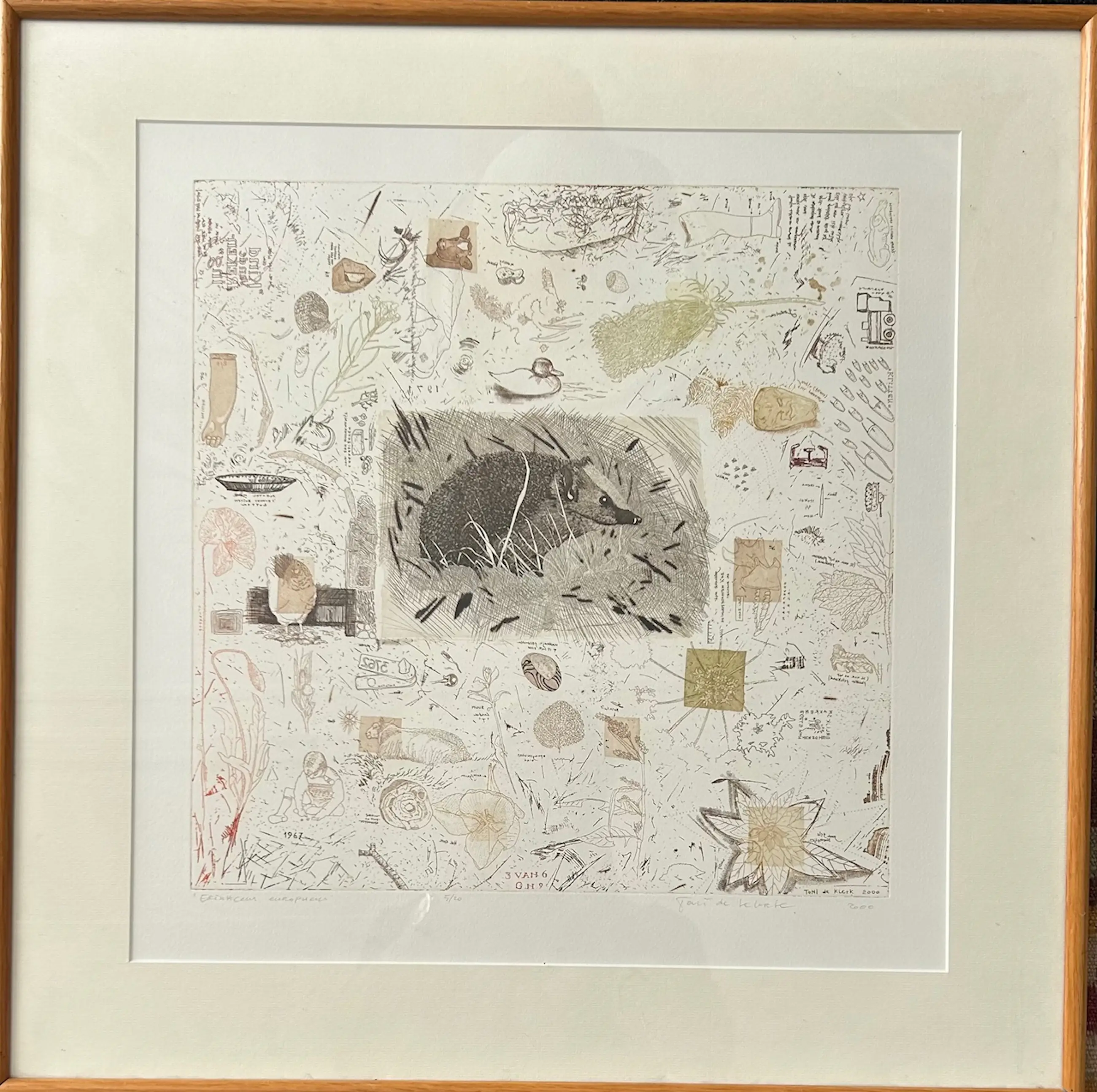 Prachtige compositie met in het midden een egel uitgebeeld. In potlood gesigneerd, getiteld (Erinaceus Europaeus. Dit is de Latijnse naam voor egel) en genummerd: 5/20. Zie foto's. Zeer goed staat. Goede houten lijst; kan zo aan de muur met ophangsysteem.