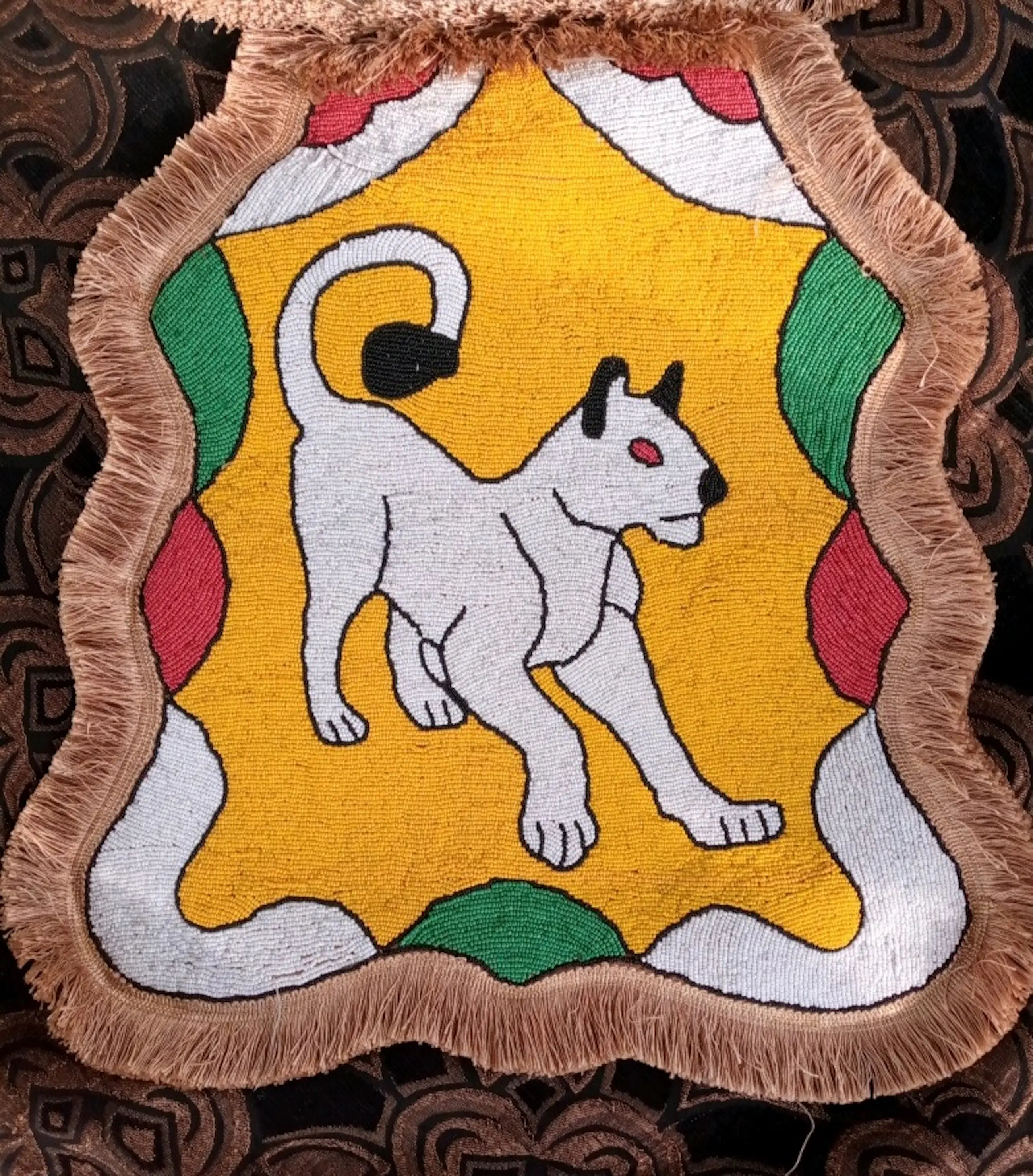 Dit uitzonderlijke handgemaakte kunstwerk toont een gestileerde katachtige, een symbool van macht, waakzaamheid en adel. Volledig handgemaakt met ingewikkeld genaaide kralen op een fluwelen achtergrond, weerspiegelt het traditioneel Afrikaans vakmanschap en het culturele erfgoed van Benin. De levendige kleuren en dynamische patronen roepen spiritualiteit en bescherming op, wat dit werk tot een uniek stuk maakt dat zowel decoratief als betekenisvol is. Perfect voor verzamelaars van authentieke kunst en liefhebbers van Afrikaanse kunst.